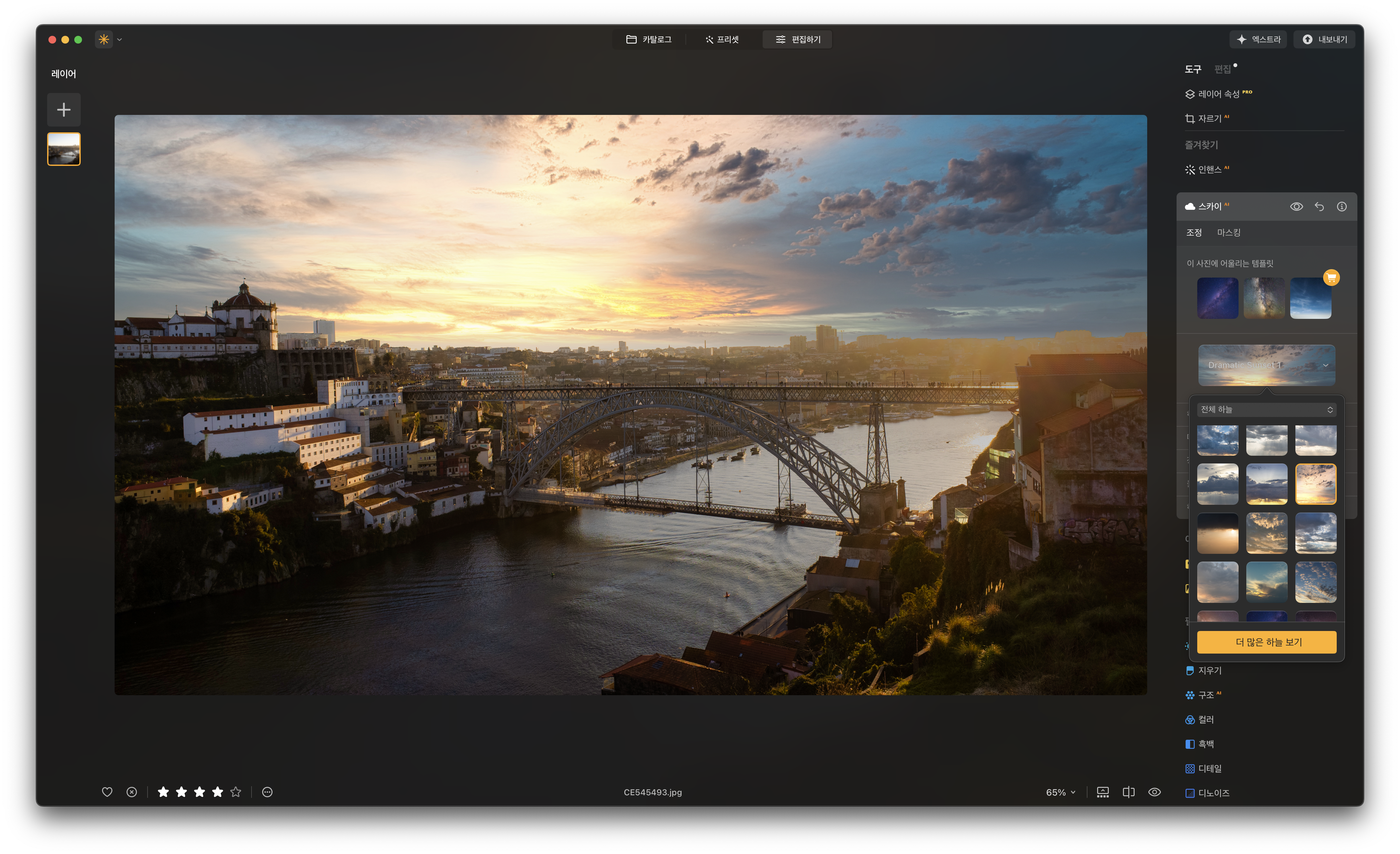 루미나 네오의 대표 기능입니다. AI가 사진 속 하늘 영역을 인식한 뒤 프리셋 형태로 저장된 이미지를 합성하는 기능입니다. 여행지의 날씨가 아쉬울 때, 사진의 분위기를 색다르게 연출해 보고 싶을 때 사용할 수 있습니다. 편집하기 메뉴에서 비교적 상단에 위치해 있습니다. 인핸스 AI와 함께 즐겨찾기에 배치해 놓았는데 그만큼 쉽고 효과가 좋습니다.