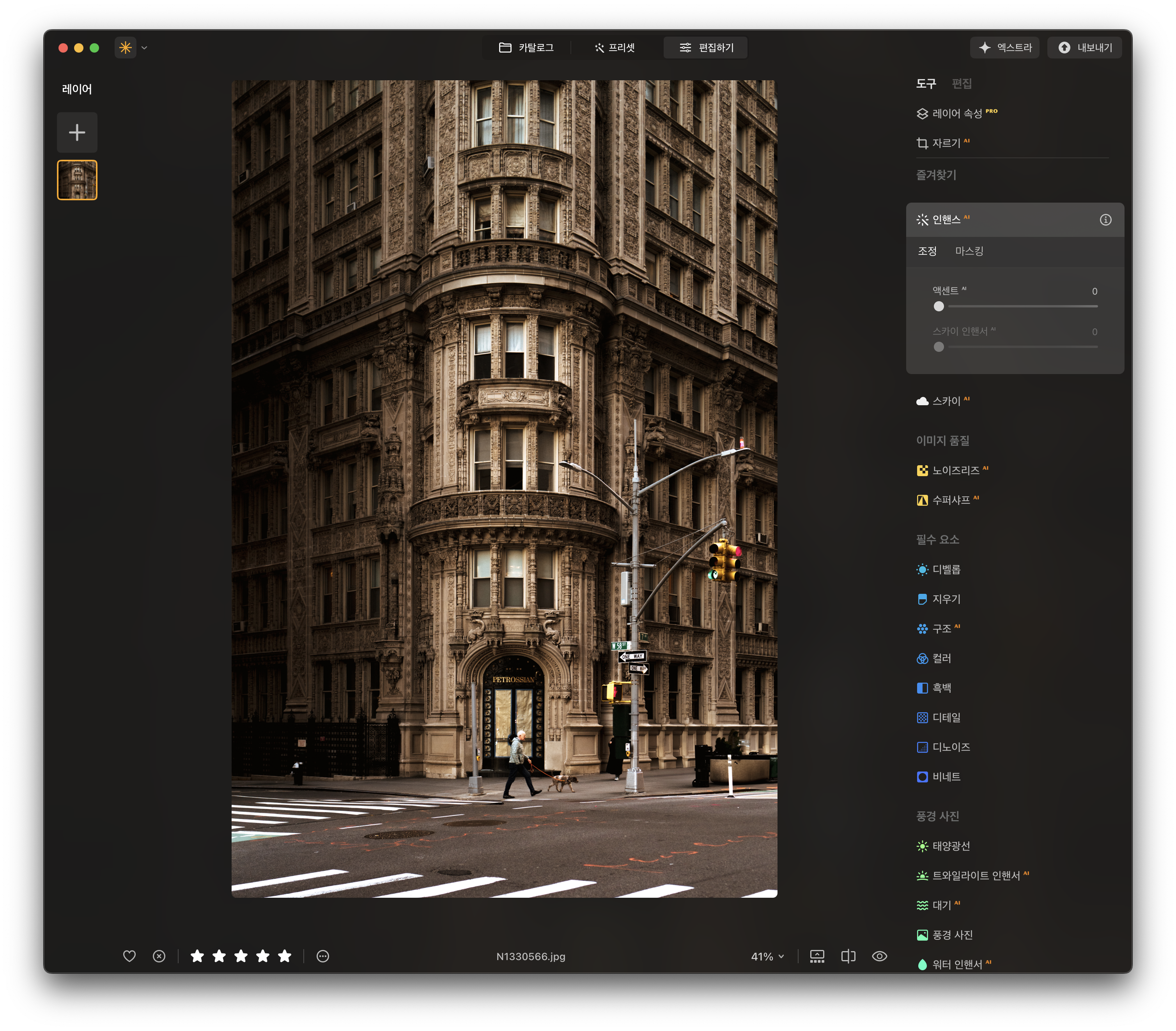 풍경, 여행 등 장르에 맞춘 필터도 제공되기 때문에 편집에 서툰 사용자들에게는 인핸스AI-필터 과정을 추천합니다. 두 항목으로 노출과 색, 분위기까지 모두 해결할 수 있고 시간도 얼마 걸리지 않아요. 숙달되면 1분 안으로 편집이 끝납니다. 여행지에서 찍어 온 많은 사진들을 일일이 편집할 생각에 골치 아프다면 이것이 좋은 답이 될 겁니다.