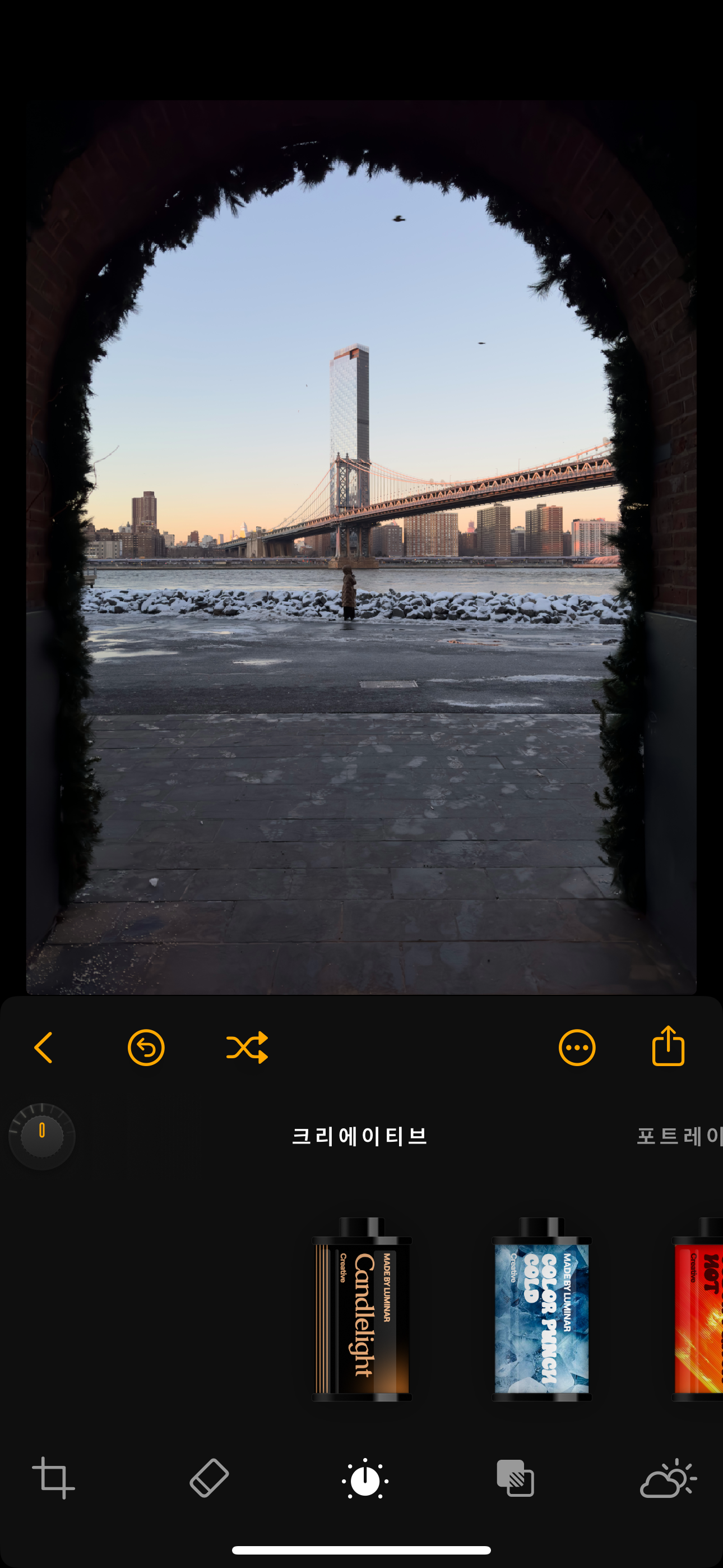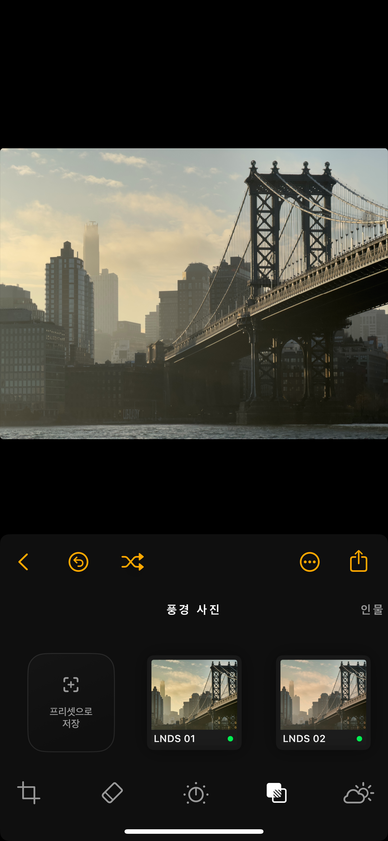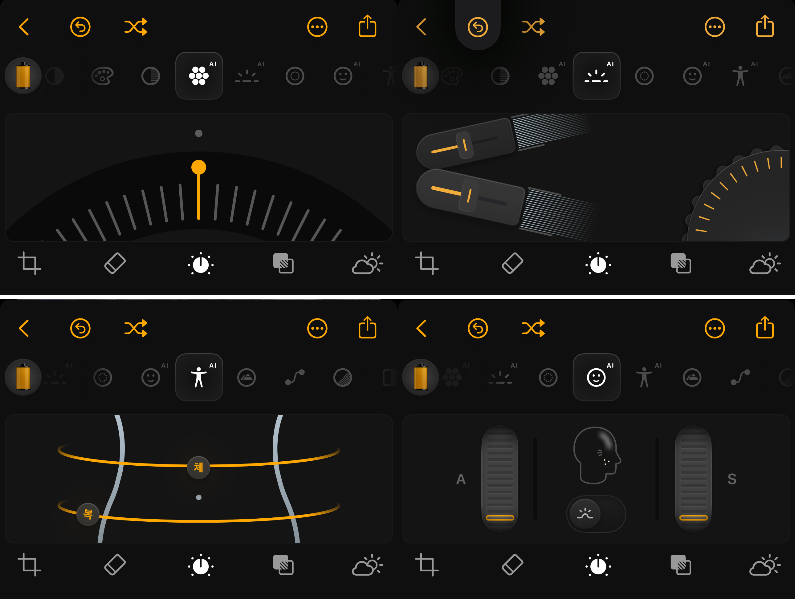 루미나 모바일에서 편집할 이미지를 불러 왔을 때 가장 먼저 표시되는 기능입니다. AI 편집의 핵심 기능이기도 하고요. 화면에 표시된 다이얼을 돌리면 AI가 이미지를 분석해 노출과 명암대비, 색 표현 등을 최적화합니다. 사용자는 단순히 값을 조절하는 것만으로 기본 편집이 끝나고요. 간단하면서도 효과가 좋기 때문에 이미지 편집에 익숙하지 않은 사용자들에게 추천하는 기능입니다.