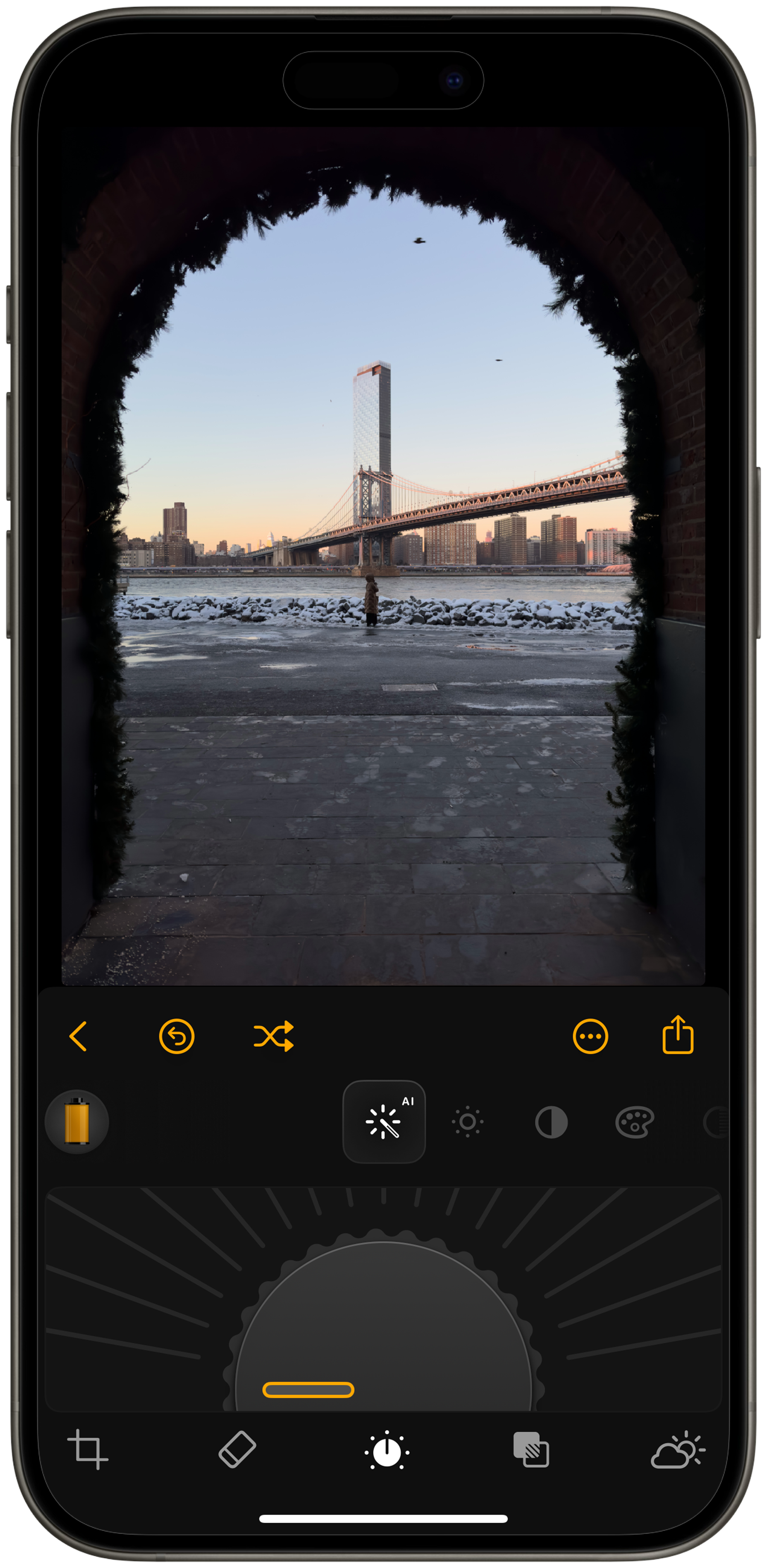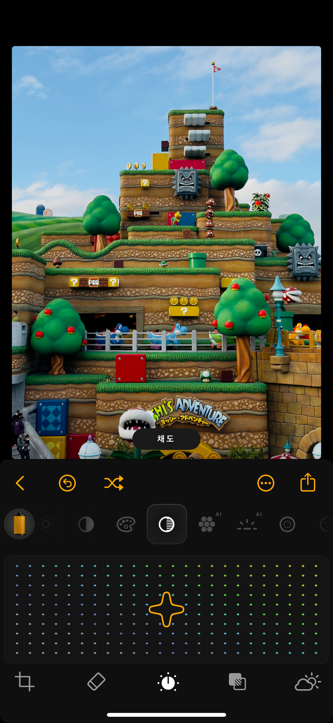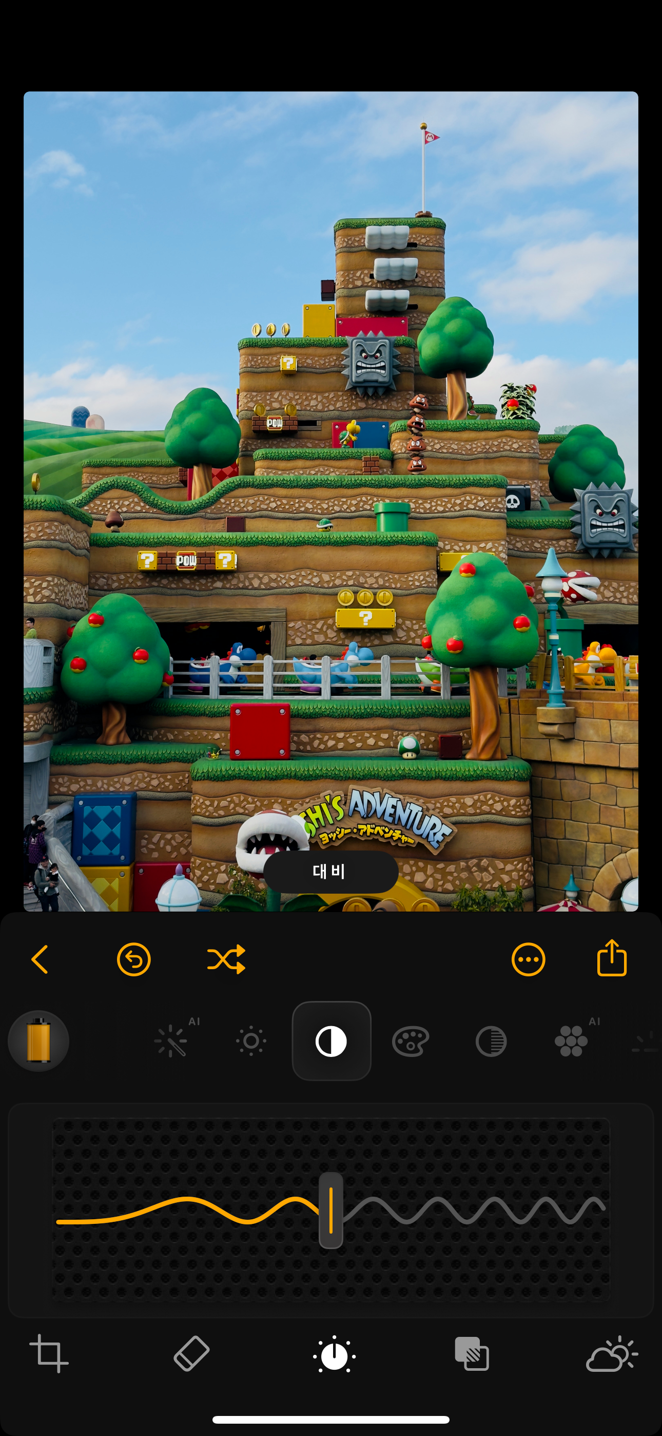 루미나 모바일에서 편집할 이미지를 불러 왔을 때 가장 먼저 표시되는 기능입니다. AI 편집의 핵심 기능이기도 하고요. 화면에 표시된 다이얼을 돌리면 AI가 이미지를 분석해 노출과 명암대비, 색 표현 등을 최적화합니다. 사용자는 단순히 값을 조절하는 것만으로 기본 편집이 끝나고요. 간단하면서도 효과가 좋기 때문에 이미지 편집에 익숙하지 않은 사용자들에게 추천하는 기능입니다.