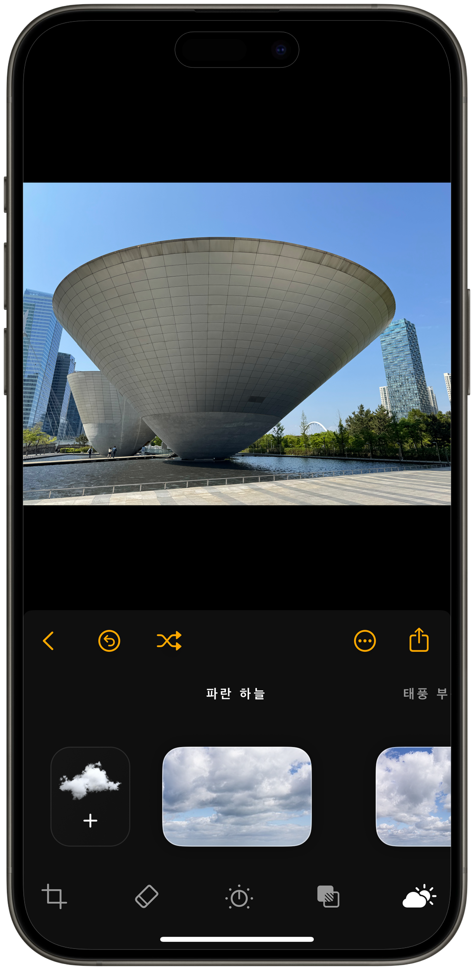 앱에서 지원되는 프리셋으로 교체하거나 가지고 있는 하늘 이미지를 덧씌울 수 있습니다. 이후에는 합성한 이미지의 크기와 위치, 밝기, 색감 등을 바꿔 원본 이미지와 자연스럽게 어울리도록 추가 조정할 수 있습니다.