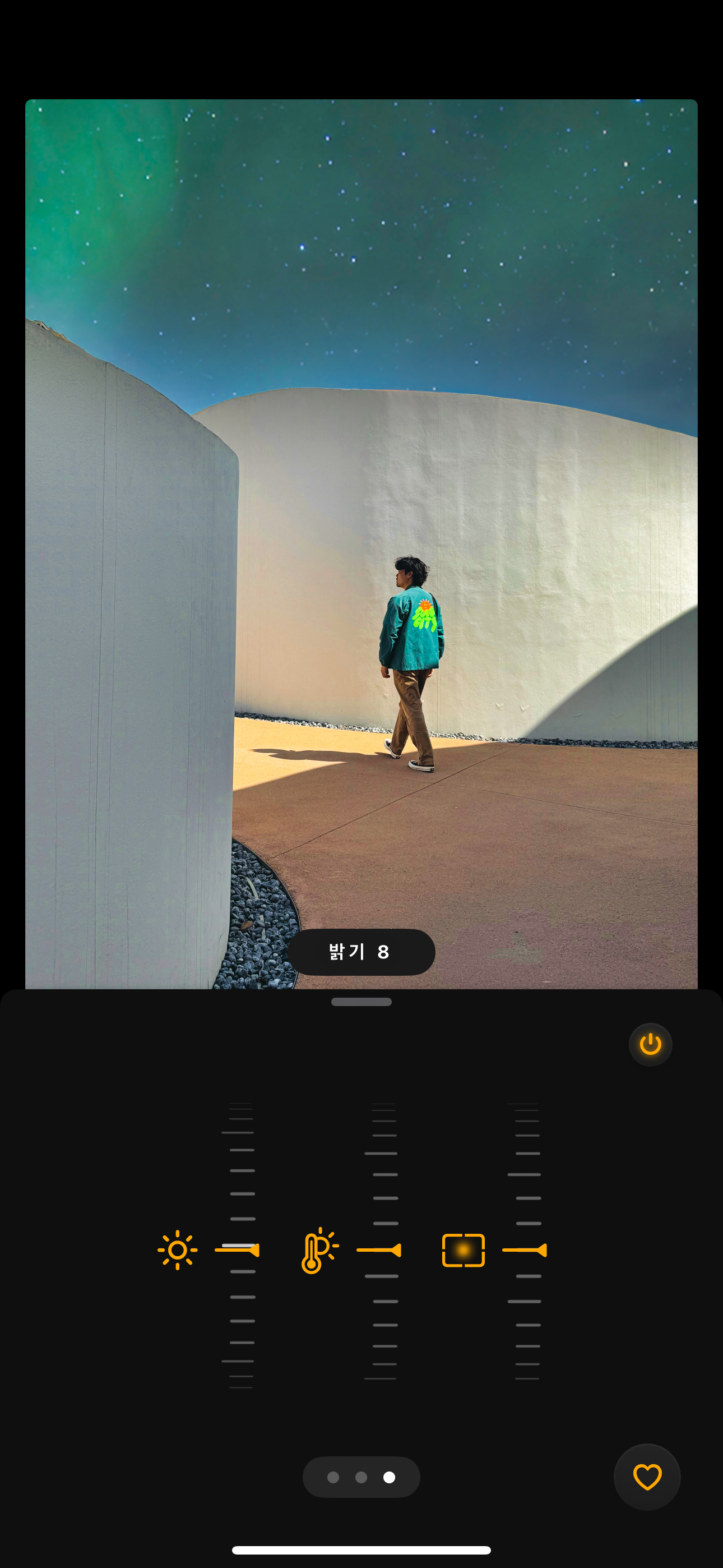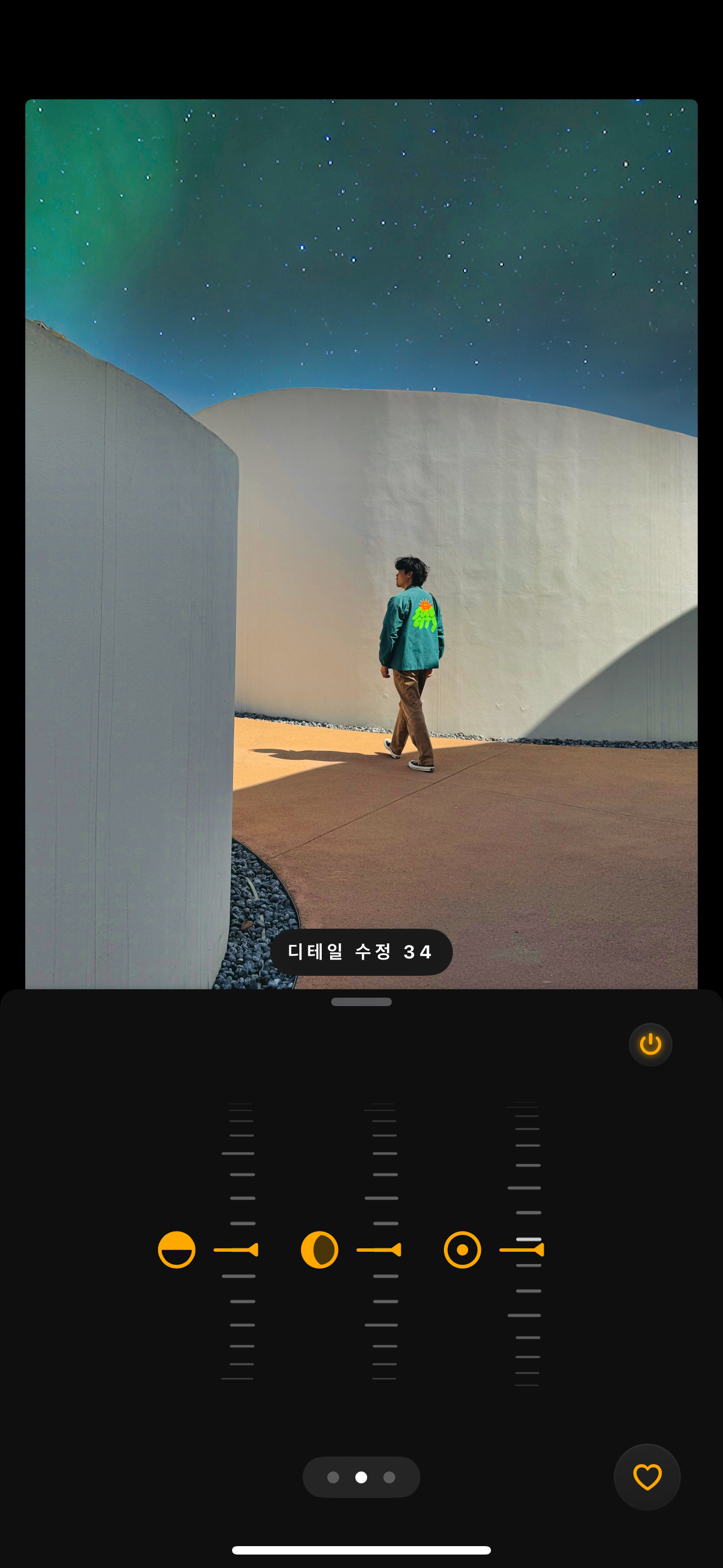 필터 효과는 PC용 루미나 네오의 기능을 가져온 것입니다. 상황, 피사체에 맞춘 프리셋을 제공하고 일부는 시네마틱한 느낌을 연출할 수 있는 설정값이 저장돼 있습니다. 사용법은 필름 효과와 동일합니다. 각 항목을 선택한 뒤 편집 화면에서 결과를 확인하고 0-100의 값을 설정하면 됩니다. 자주 사용하는 필터 효과는 하단의 하트 버튼을 눌러 즐겨찾기로 추가하면 편집 시간을 더 줄일 수 있습니다.