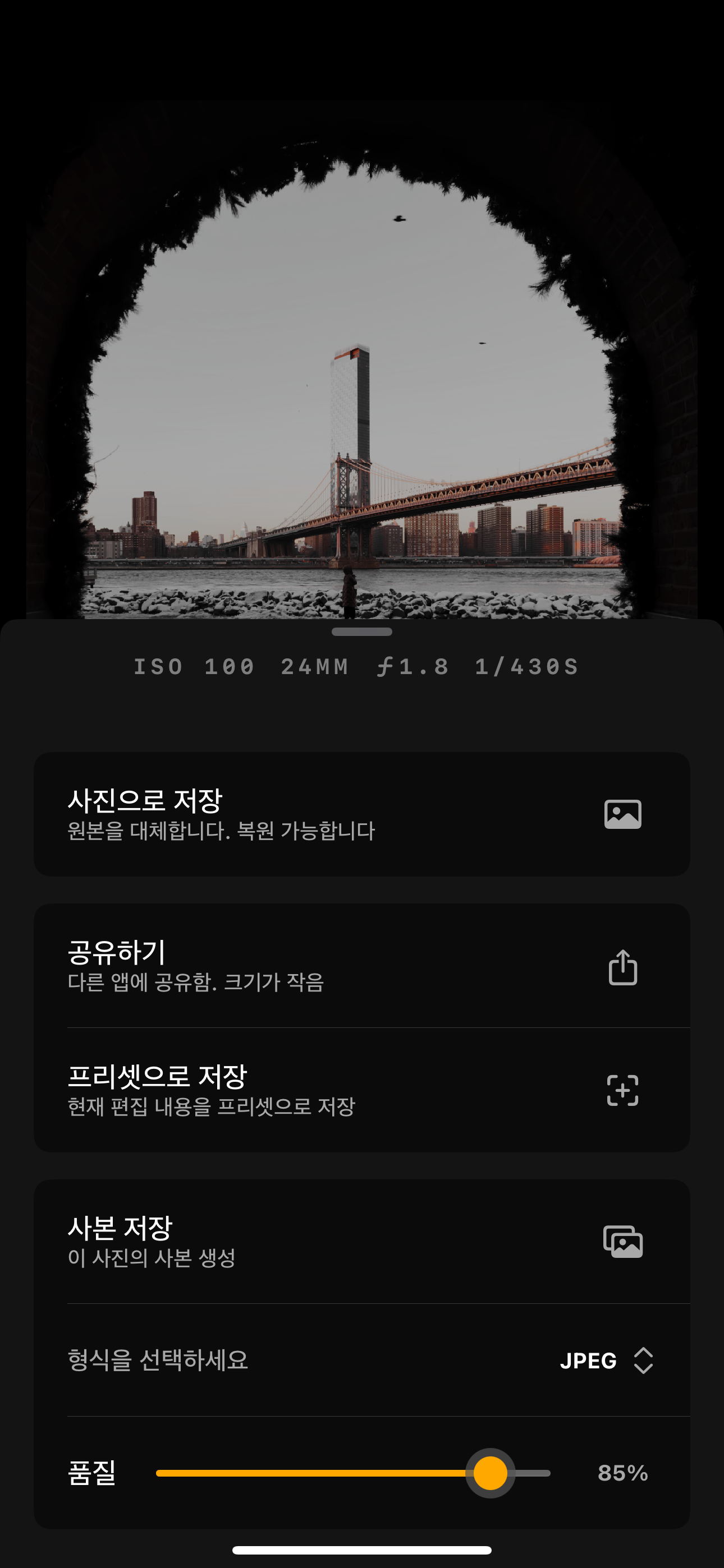 편집이 완료된 후에는 사진으로 저장/공유하기/사본 저장 메뉴로 결과물을 출력할 수 있습니다. 추천하는 것은 '사본 저장'입니다. 원본 이미지를 유지한 채 사본으로 추가 이미지를 생성하기 때문에 데이터 관리에 유리해요. 저장된 이미지는 사진 앱에서 확인할 수 있습니다. 2,3단계로 여행 사진이 눈에 띄게 달라지기 때문에 그간 촬영한 여행 사진들이 아쉬웠다면 한 번 써보셔도 좋겠어요.