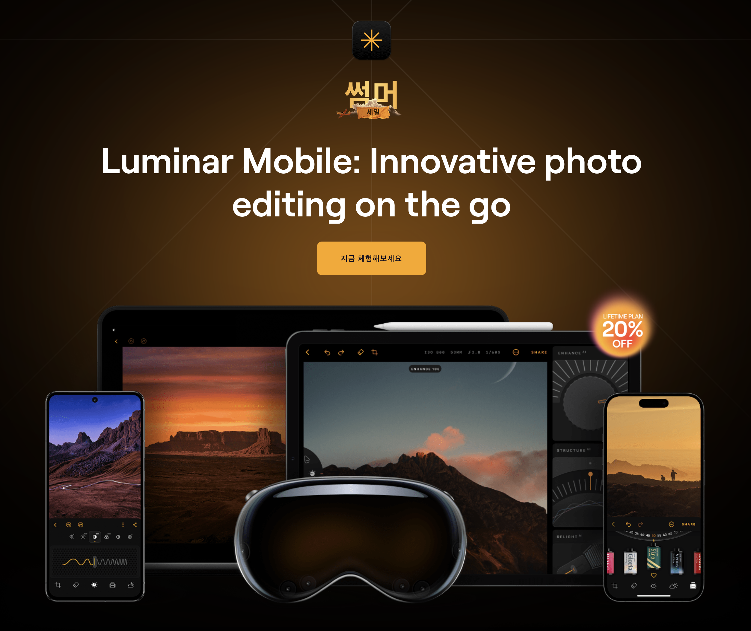 루미나 모바일은 PC용 루미나 네오의 기능들을 모바일 환경으로 구현한 것입니다. 덕분에 스마트폰과 태블릿 그리고 비전 프로까지 다양한 기기에서 AI 이미지 편집이 가능해졌습니다. 스마트폰으로 촬영한 이미지를 굳이 PC로 옮길 필요 없이 바로 편집, 공유가 가능해진 것이 강점입니다. 아이폰의 앱 스토어, 안드로이드 플레이스토어에서 설치할 수 있습니다.