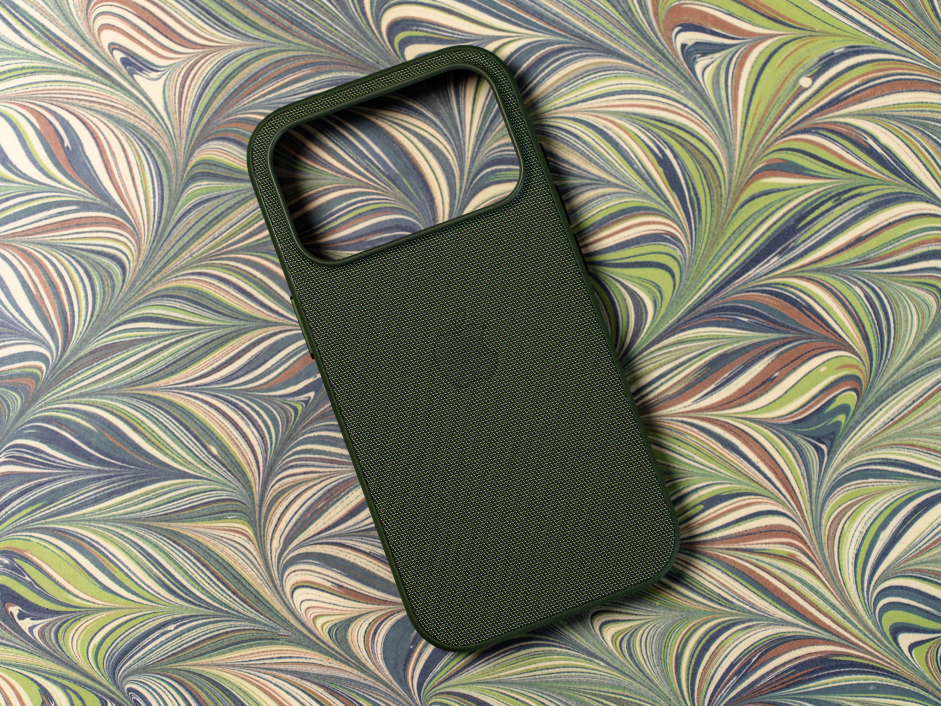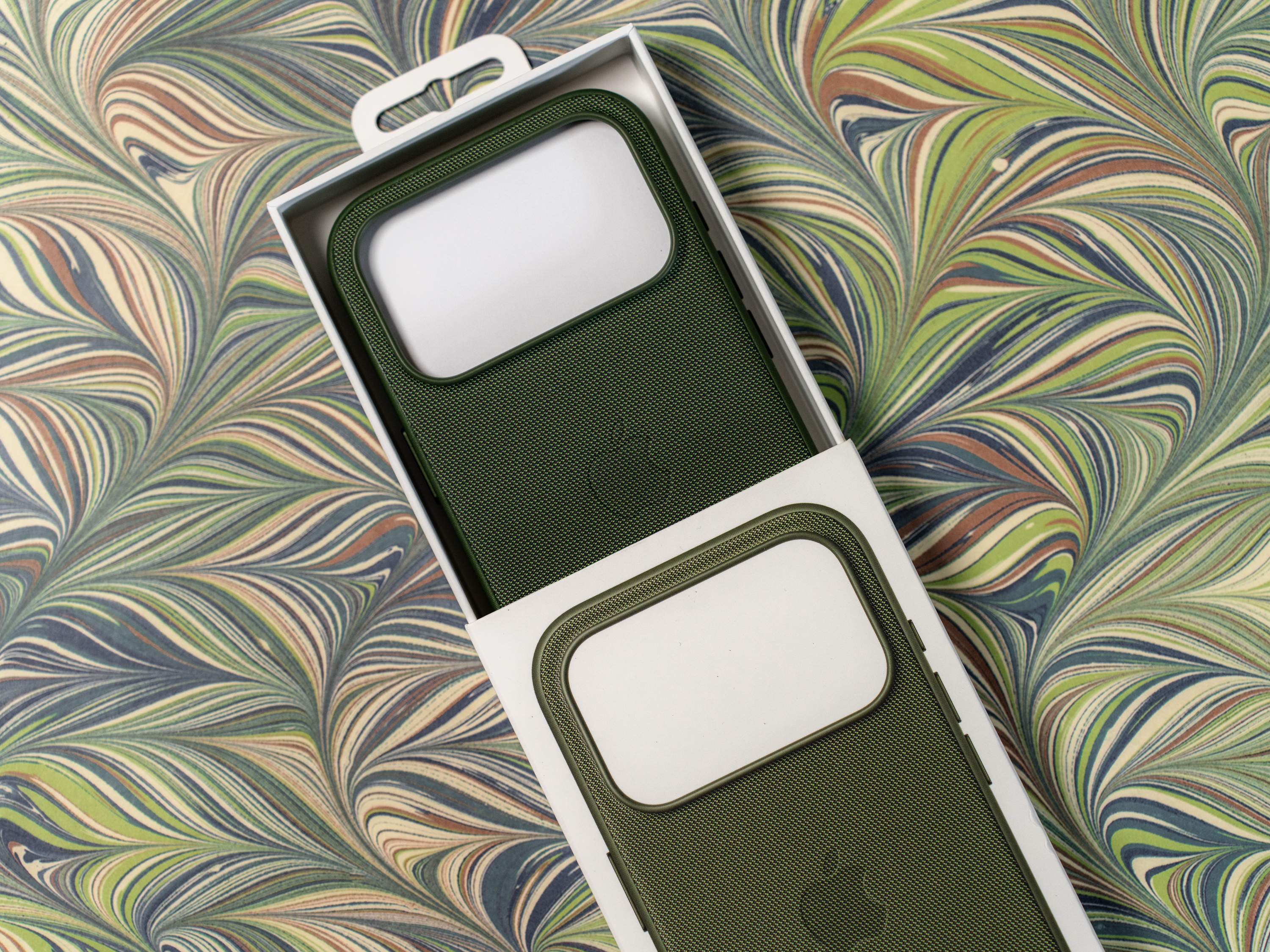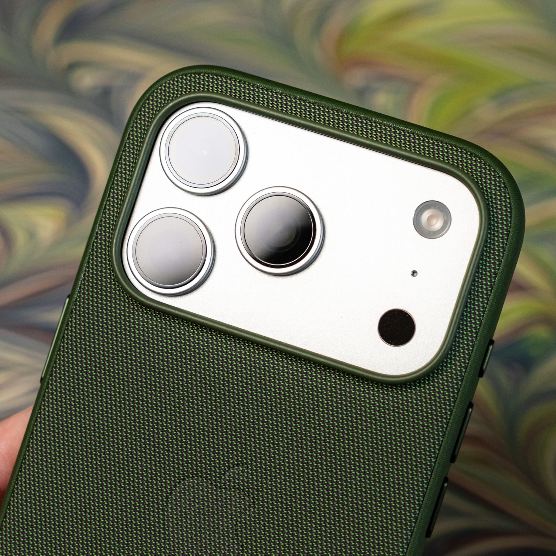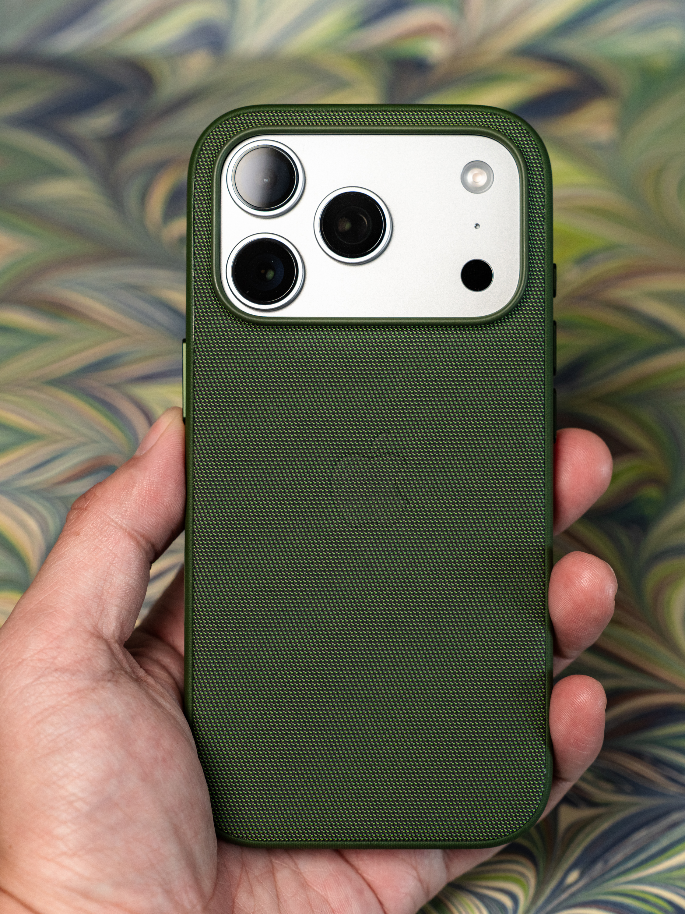 새로운 테크우븐 케이스는 파인우븐 시리즈의 문제가 해결됐다는 평이 많았어요. 사진으로 봤을 때 컬러도 제 맘에 들길래 폰과 함께 구매했습니다. 폰은 아이폰 17 프로 실버, 케이스는 그린입니다. 프로 모델용으로만 테크우븐 케이스가 출시됐다고 해요.