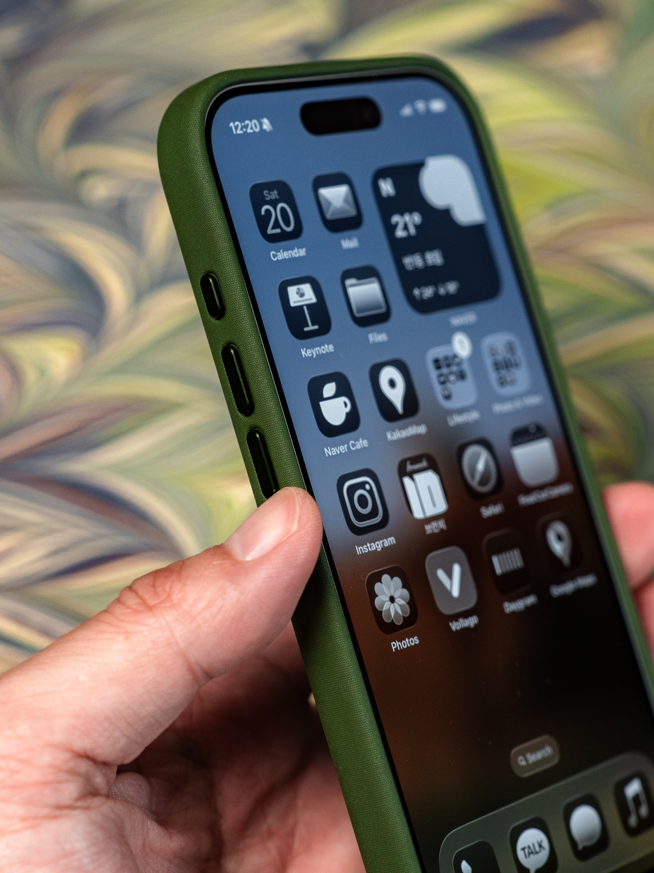 아이폰 17 프로에 장착한 모습. 오렌지, 다크 그린 색상을 고려했지만 케이스와의 조화를 고려하면 실버 모델이 가장 좋을 것 같았어요. 실버-그린 컬러는 역시 무난하게 어울립니다. 예전 골드-그린이 좀 더 좋지만.