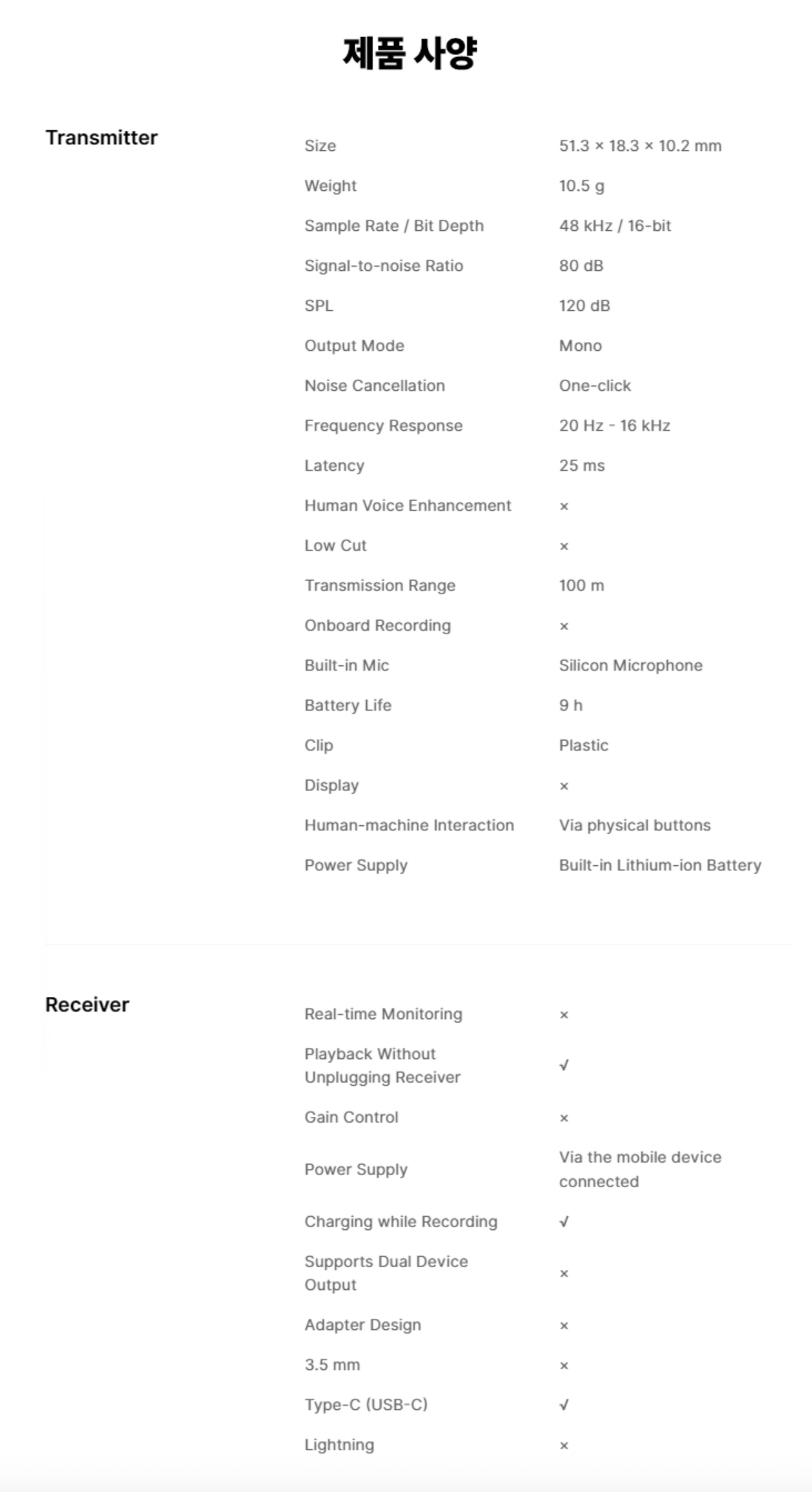 USB-C 연결을 지원하는 소형 무선 마이크입니다. USB-C 포트가 있는 스마트폰과 노트북, 카메라 등에서 사용할 수 있어요. 아이폰은 15 시리즈 이후 모델에 호환됩니다. 주요 사양은 48kHz, 16bit 녹음, 80dB의 신호대 잡음비, 최대 입력 120dB, 주파수 응답 20Hz-16kHz, 레이턴시 25ms 입니다. 기본적인 녹음 기능 외에도 송신기의 버튼으로 즉시 활성화 할 수 있는 노이즈 감소 기능이 내장돼 있습니다.