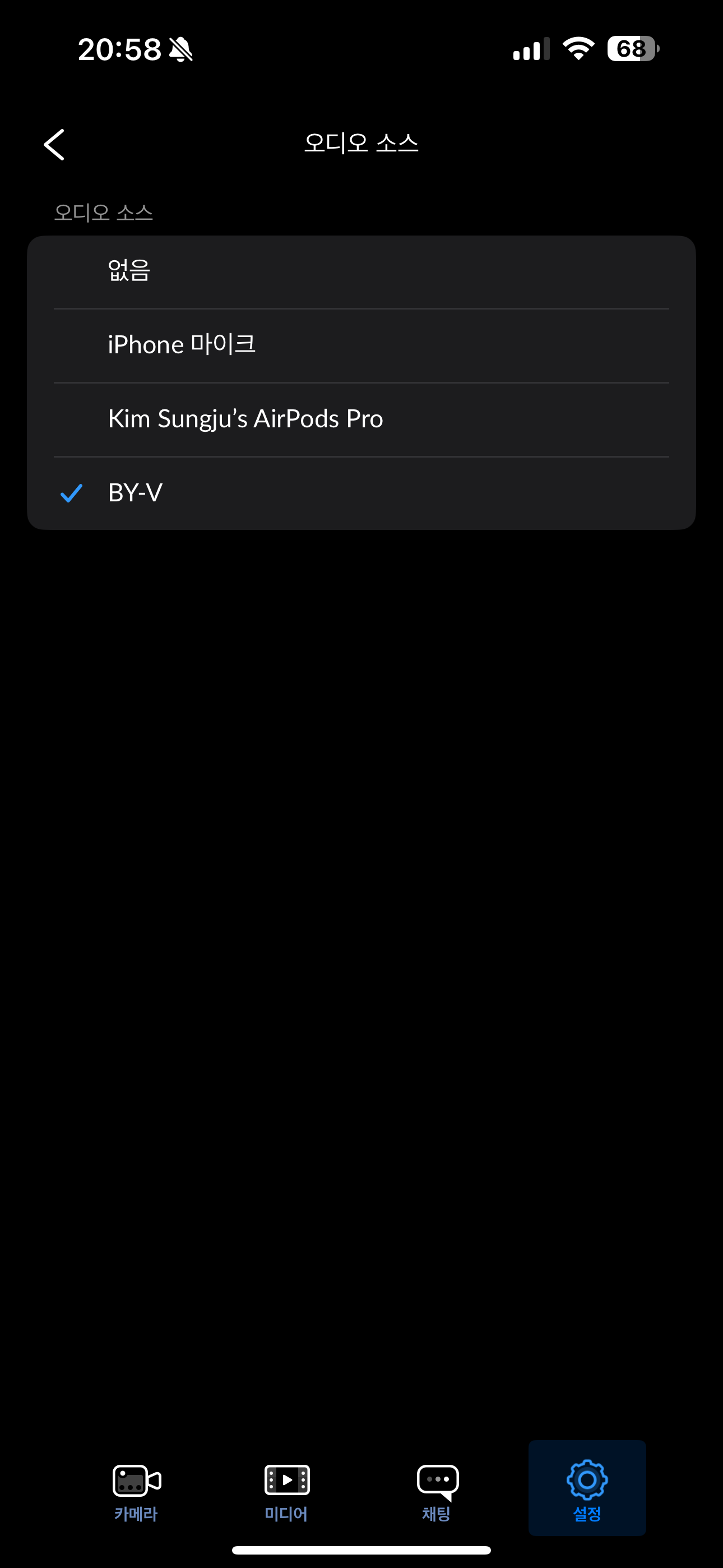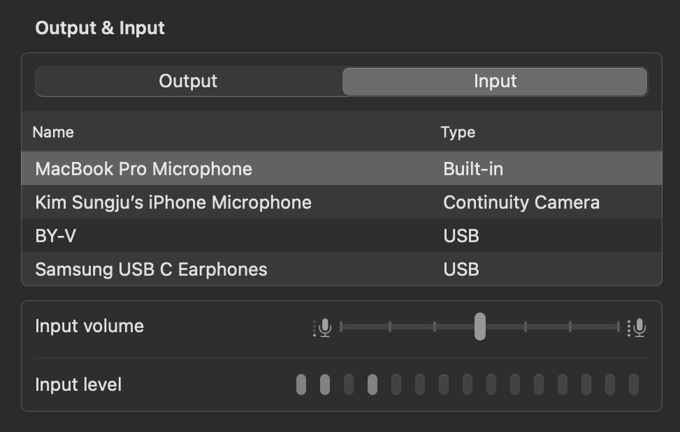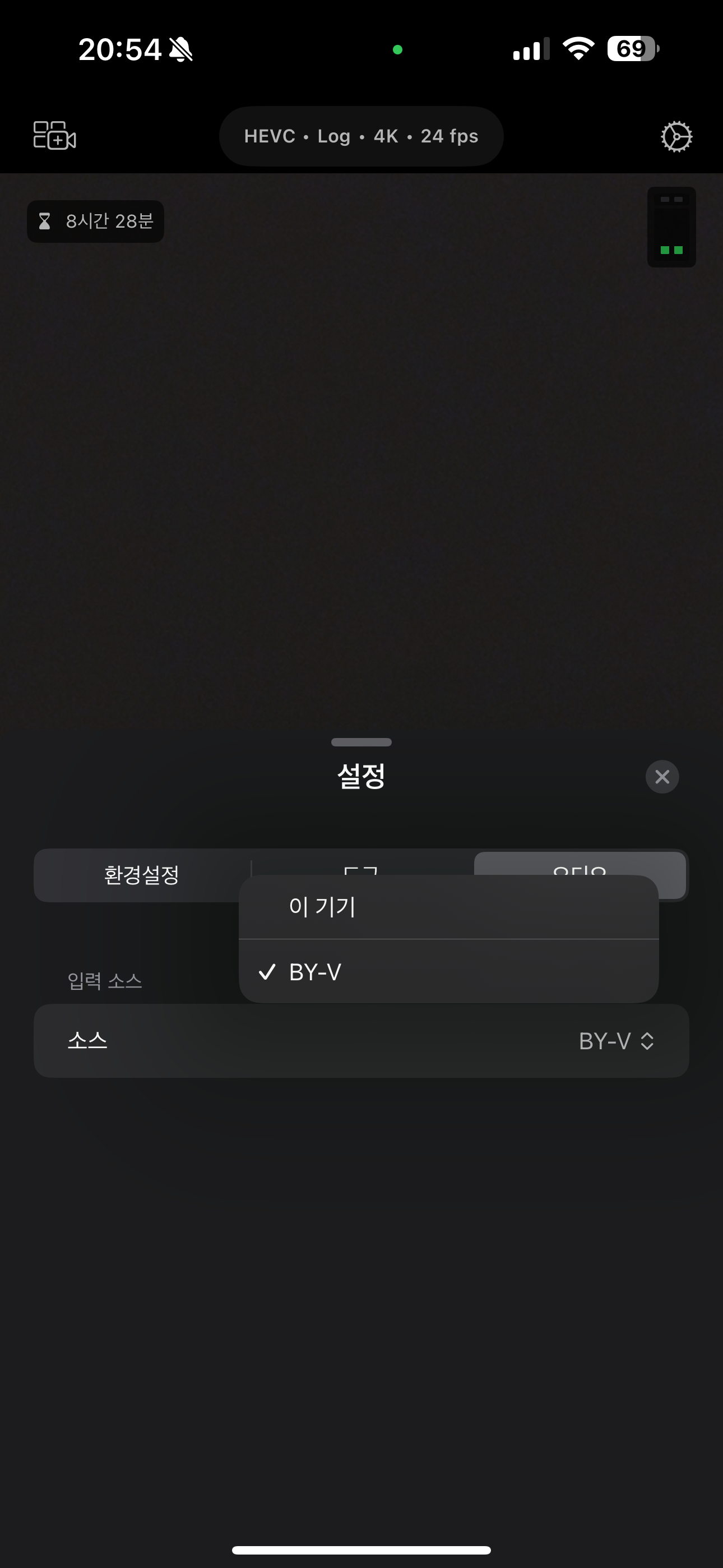 장비가 정상적으로 연결되고 녹음 준비가 끝나면 연결된 장치의 마이크 메뉴에서 BY-V 항목이 추가된 것을 확인할 수 있습니다. 대부분 자동으로 오디오 입력이 외부 마이크로 전환됩니다. 아이폰은 촬영 앱의 오디오 설정에서, 맥북은 설정-사운드&햅틱 메뉴에서 연결 및 동작 여부를 확인할 수 있습니다.