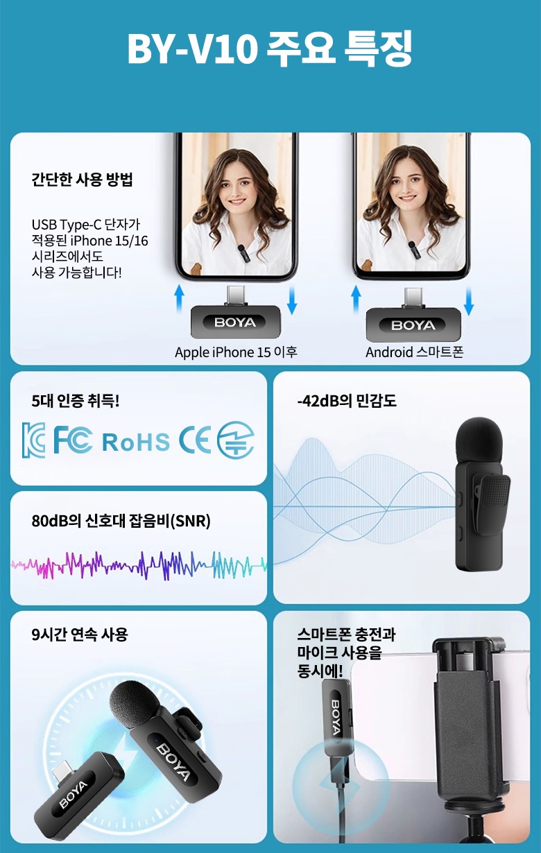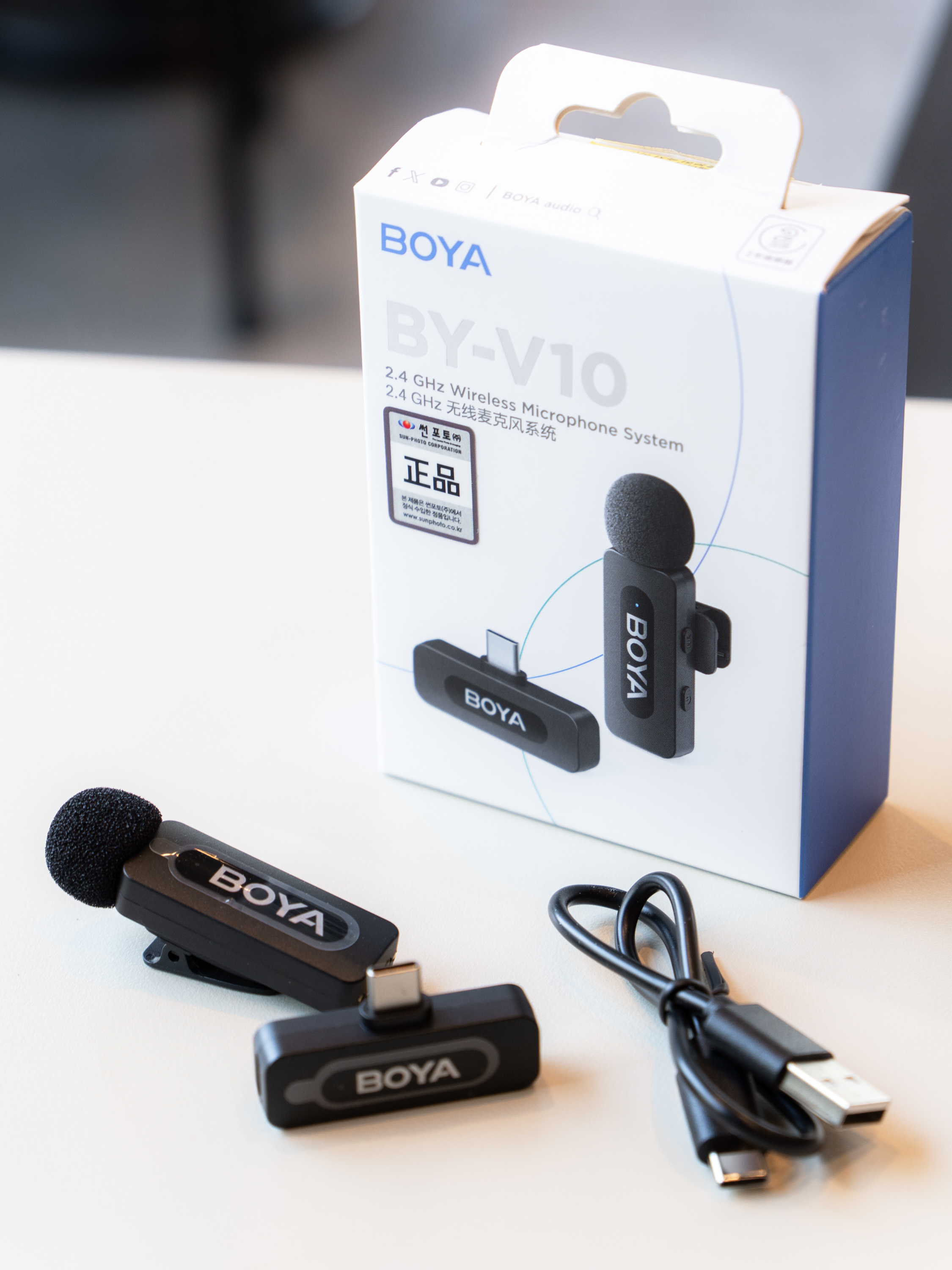 사진/영상 촬영용 액세서리 브랜드 보야에서 출시한 무선 마이크 BY-V10을 사용하고 있습니다. 5만원이 되지 않는 가격에 KC, FCC, CE, TELEC 인증, 신호대 잡음비 80dB, 최대 전송 거리 100m, 노이즈 감소 기능을 누릴 수 있는 제품입니다. 연결이 USB-C 방식으로 간편하며 한 번 충전에 최대 9시간까지 사용할 수 있어요. 보야 제품답게 가성비가 무척 뛰어납니다. 간편한 V-LOG 촬영부터 회의와 미팅, 라이브 커머스 등 하나 가지고 있으면 여기저기 쓸 수 있어요.