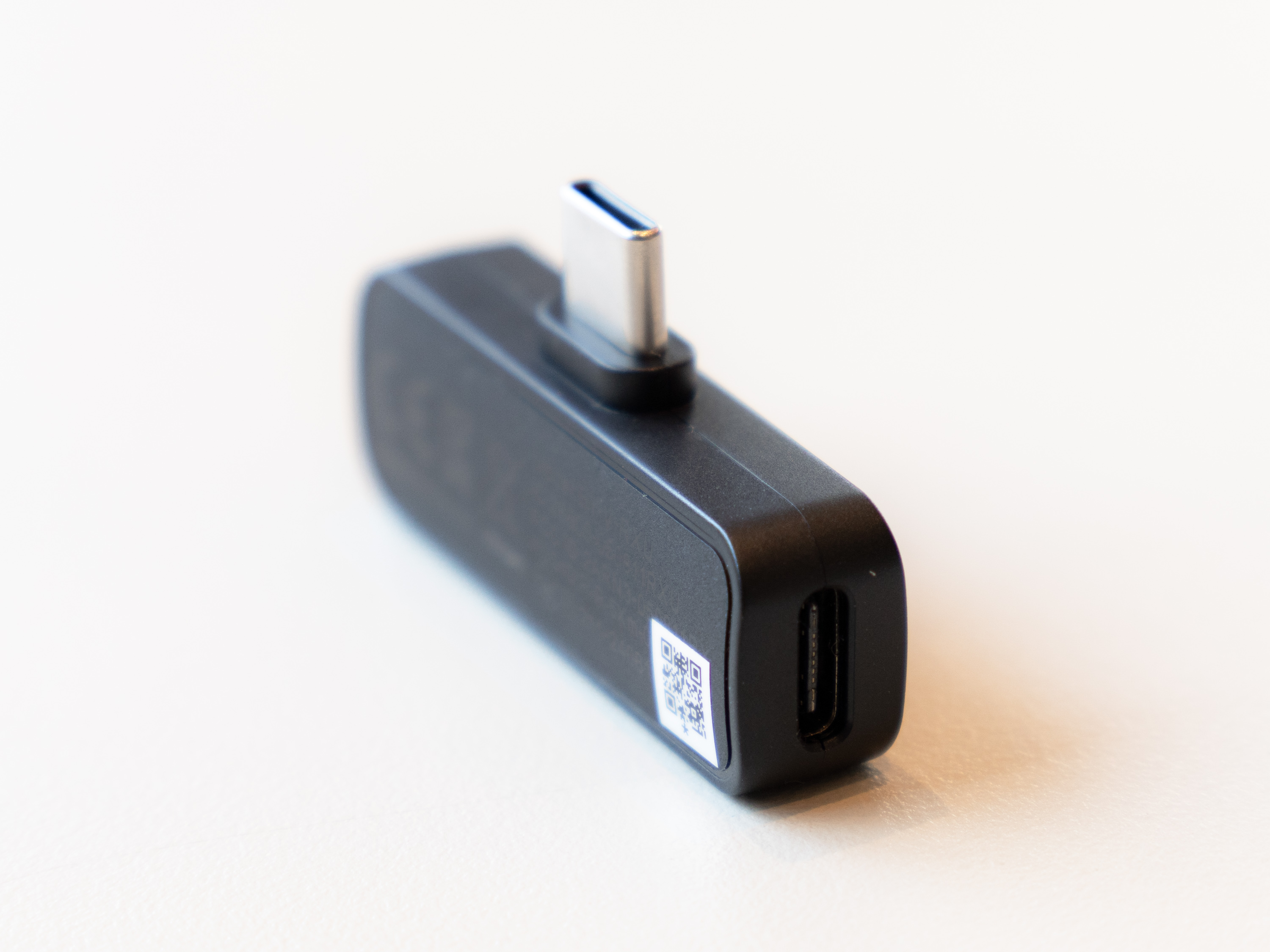 수신기는 송신기로부터 데이터를 받아 스마트폰, PC 등의 장치로 전송합니다. 송신기와 비슷한 형태로 USB-C 입/출력 포트가 각각 한개씩 있습니다. 상단 USB-C 출력 포트는 기기와 연결하는 데 사용하며 측면 USB-C 입력 포트는 패스 스루 충전에 사용됩니다. 충전 케이블을 연결하면 녹음과 스마트폰 충전이 동시에 이뤄지는 것이죠. 여행 V-LOG를 촬영하다 배터리 관리에 어려움을 겪어 본 분들이라면 이것이 매력적으로 느껴질 것입니다.