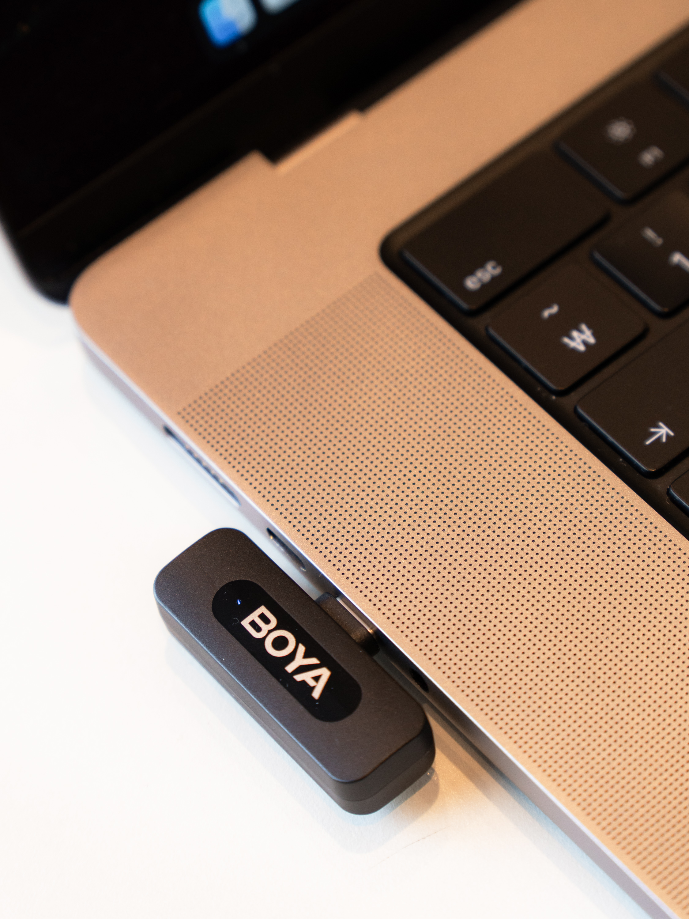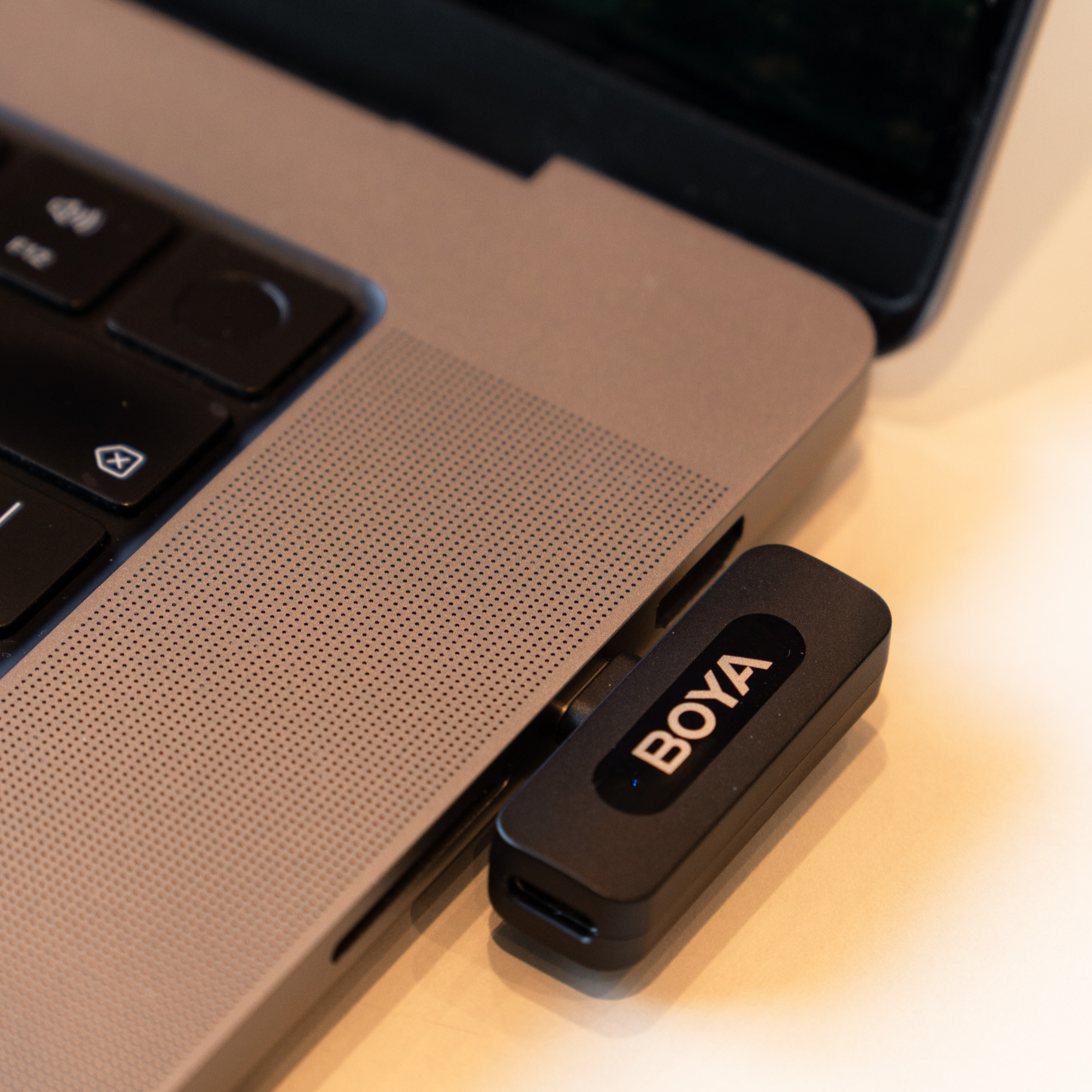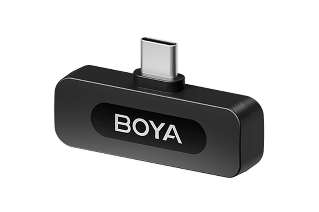 연결 방법이 이보다 더 간단할 수 없습니다. 수신기의 USB-C 출력 포트를 스마트폰, 태블릿, 노트북, 카메라의 포트에 끼우는 것으로 녹음 준비가 끝납니다. 기기와 수신기가 정상적으로 연결되면 BOYA 로고 왼쪽에 파란색 조명이 켜집니다.