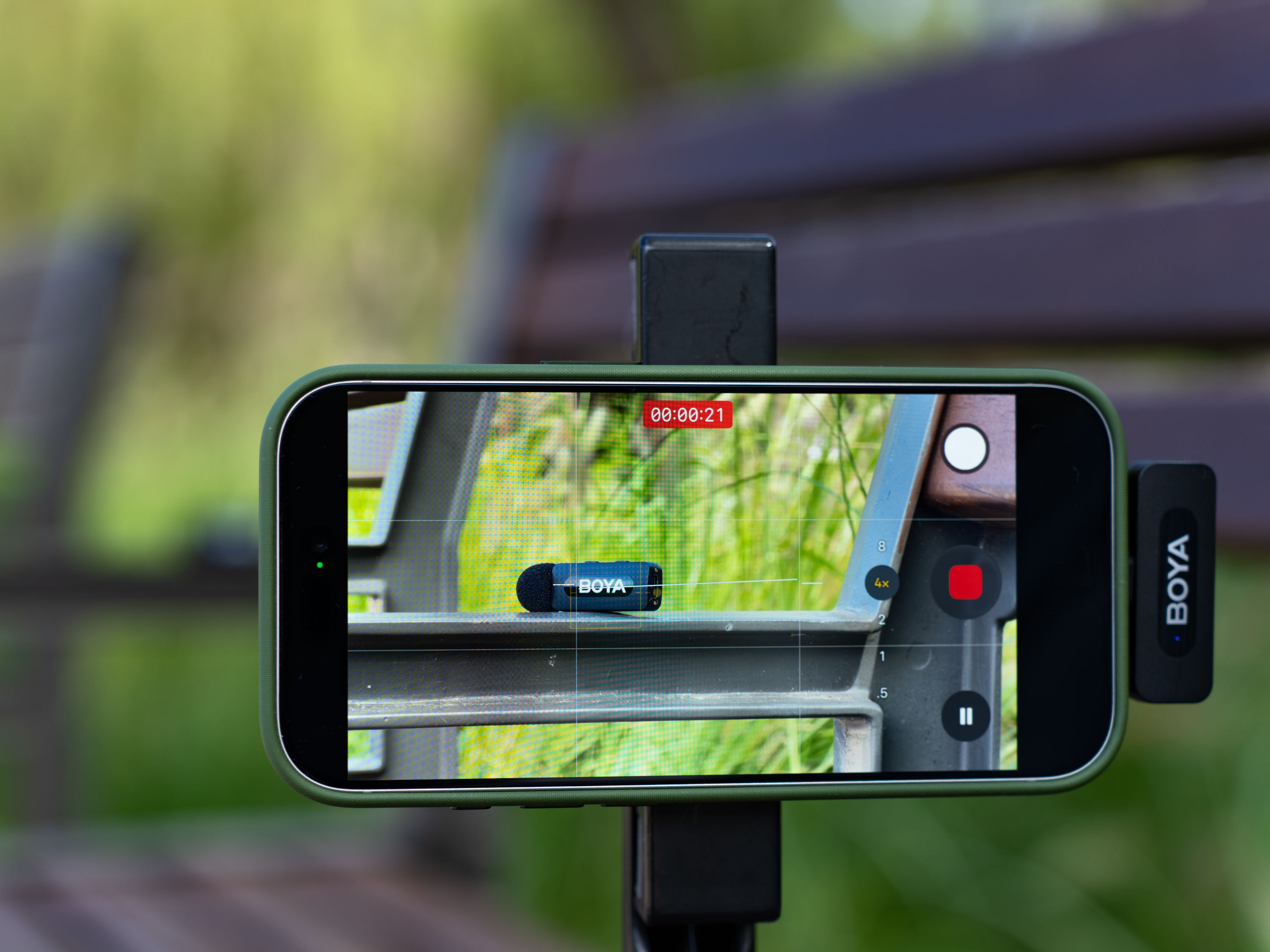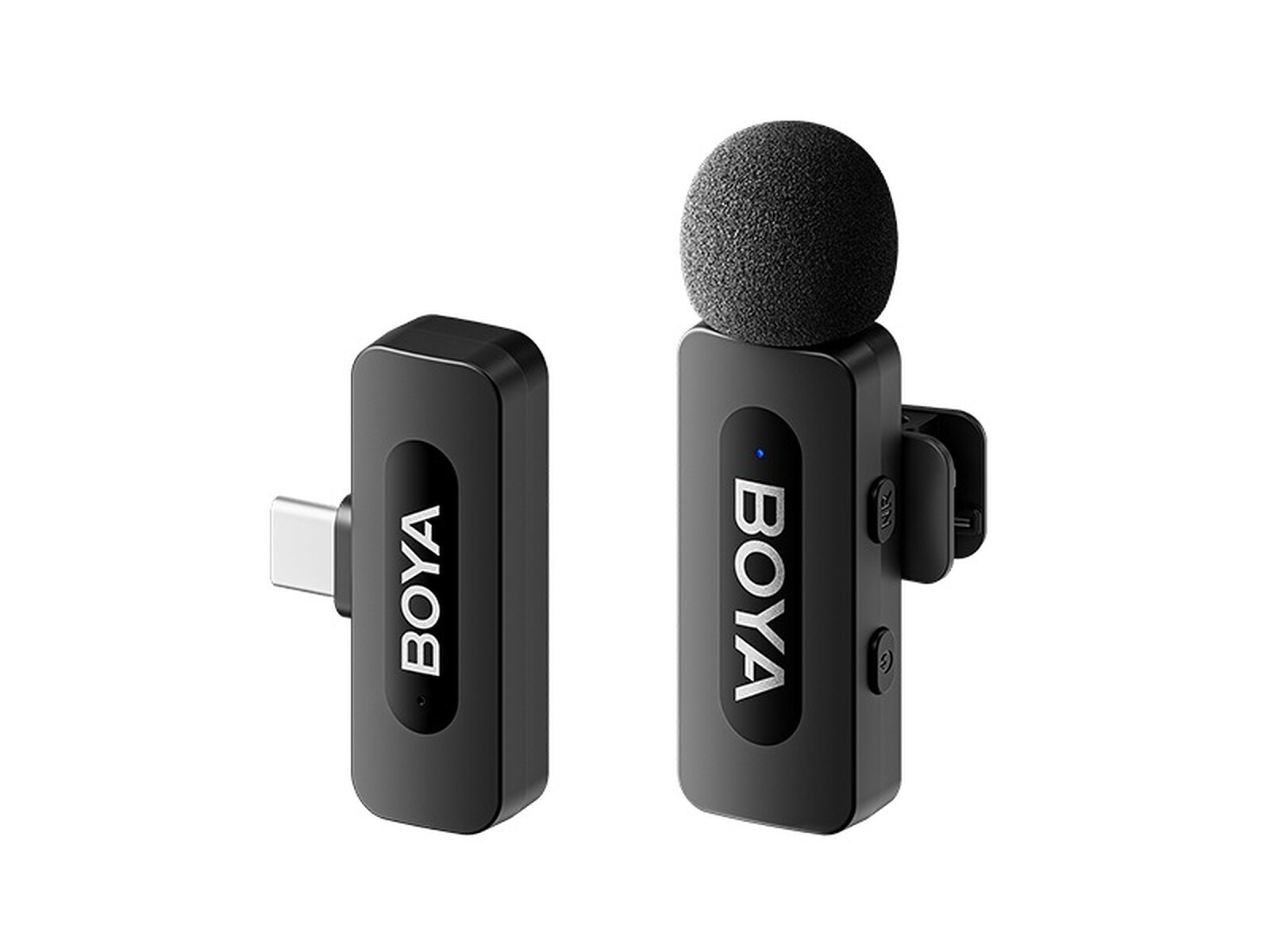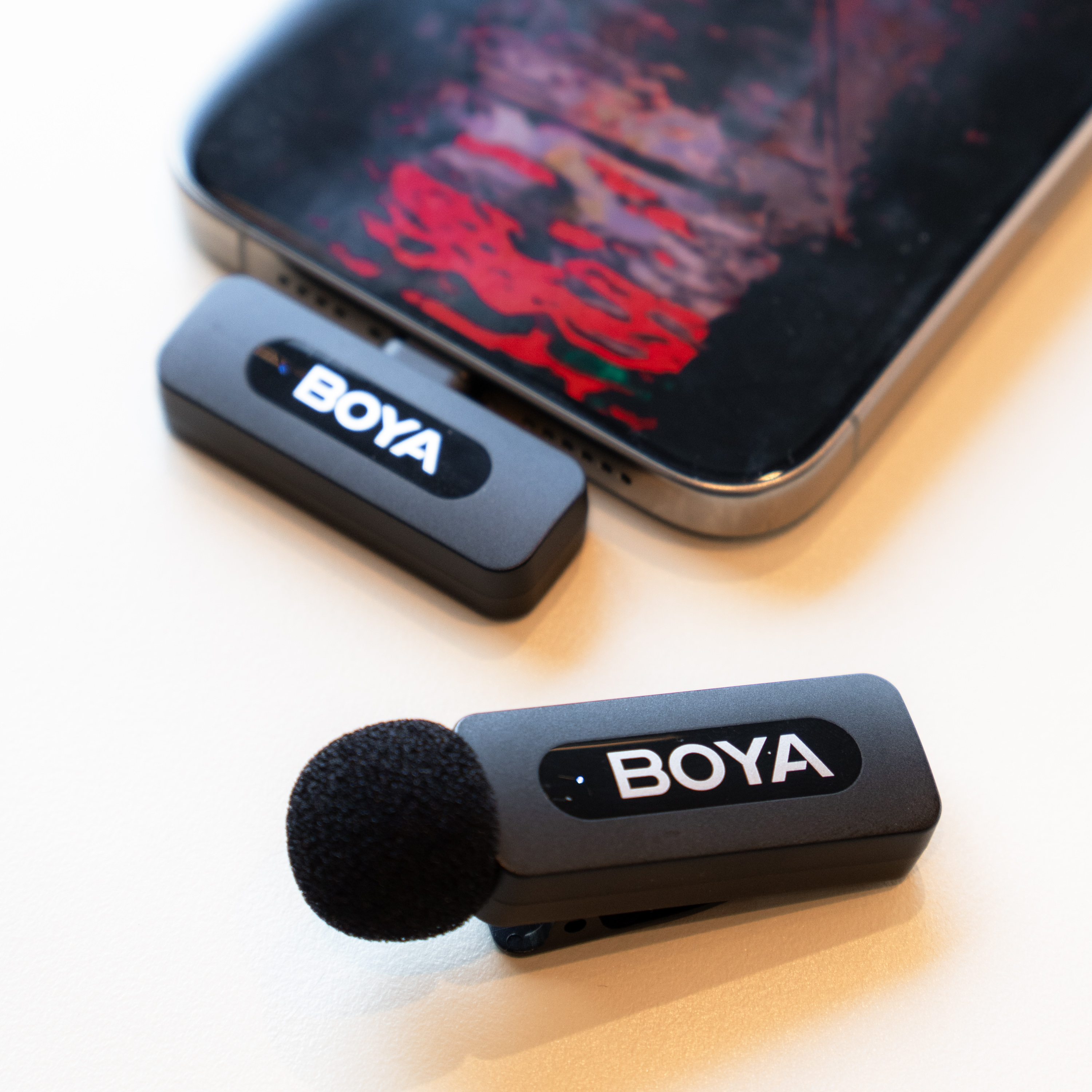 연결 방법이 이보다 더 간단할 수 없습니다. 수신기의 USB-C 출력 포트를 스마트폰, 태블릿, 노트북, 카메라의 포트에 끼우는 것으로 녹음 준비가 끝납니다. 기기와 수신기가 정상적으로 연결되면 BOYA 로고 왼쪽에 파란색 조명이 켜집니다.