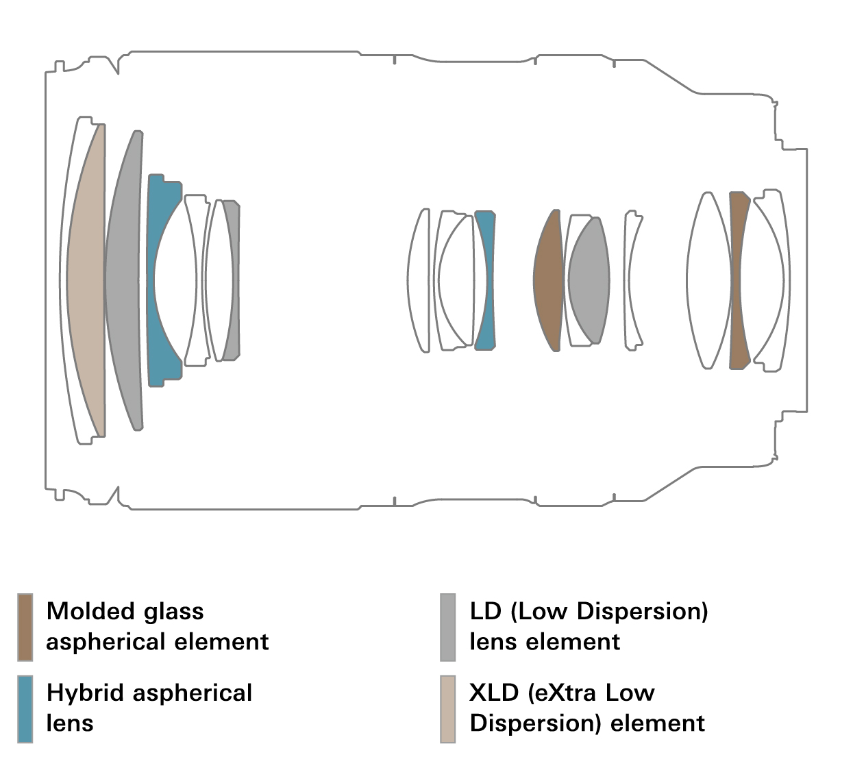 14군 18매 (유리 몰드 비구면 요소 2매, 저분산 렌즈 2매, 초저분산 렌즈 1매,하이브리드 비구면 렌즈 2매)