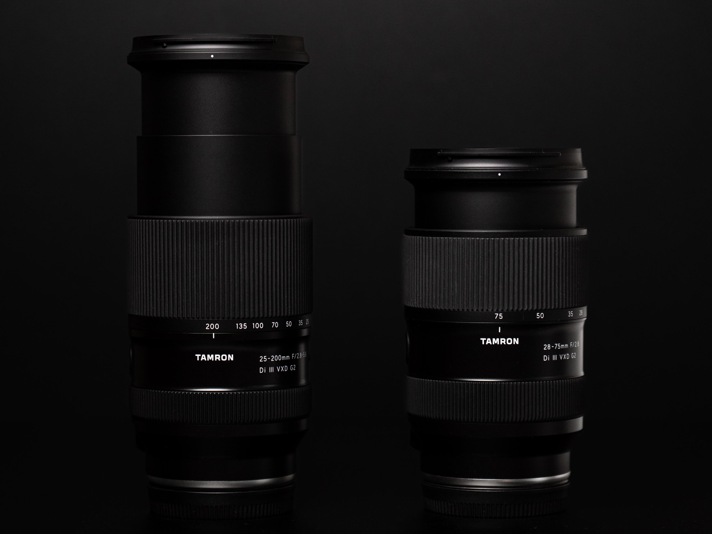 경통이 최대 돌출된 200mm, 75mm의 비교입니다. 25-200mm F/2.8-5.6 Di III VXD G2 렌즈의 경통은 2단으로 돌출됩니다. 최대 돌출시 길이는 각각 약 182mm, 145mm로 4cm 가량 차이 납니다. 둘을 직접 비교하면 28-75mm F2.8 Di III VXD G2 렌즈쪽이 F2.8 고정 조리개라는 큰 장점을 갖고 있지만 광학 8배 줌렌즈를 광학 약 3배 줌렌즈와 같은 크기로 만들었다는 것이 인상적입니다. 28-75mm F2.8 Di III VXD G2 렌즈 사용자도 별다른 이질감 없이 쓸 수 있다는 점도 마음에 들고요.