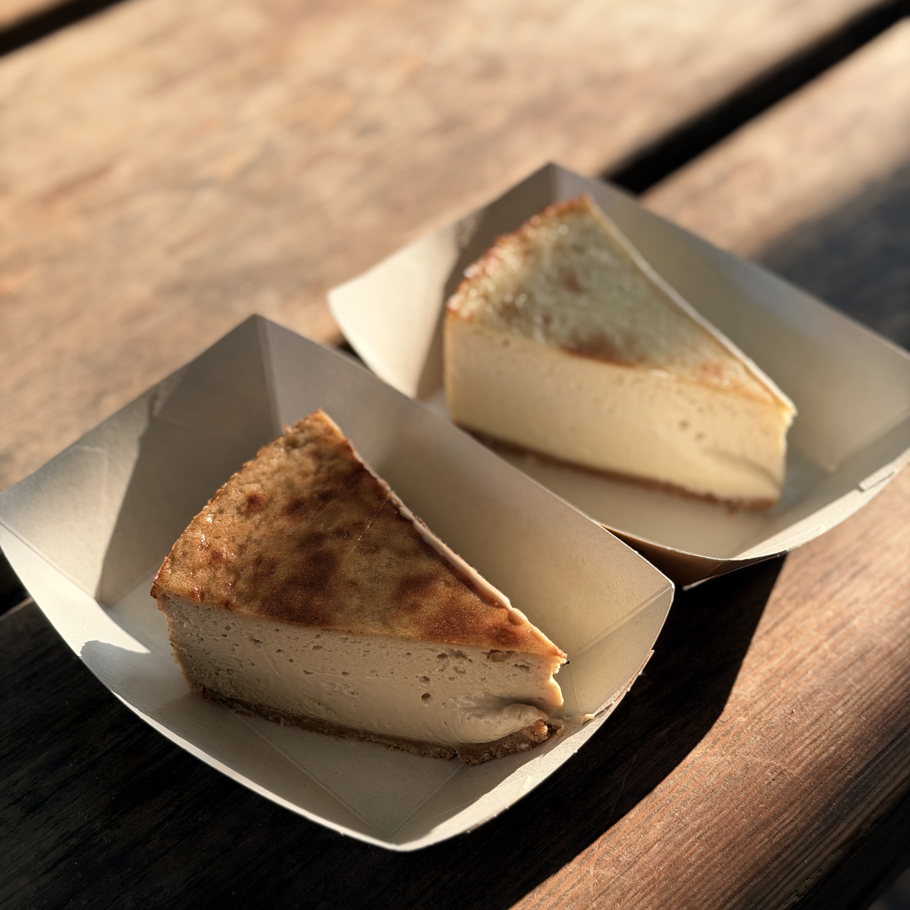 이날의 첫 손님. 특혜는 온전한 치즈케이크를 감상할 수 있다는 것입니다. 맘 같아선 저대로 들고 가고 싶지만 아쉽게도 여행 마지막 날이었습니다. 매장은 매우 좁고 앉아서 먹을 자리가 마땅치 않아요. 보통 포장 후 숙소나 근처 공원에서 먹는 것 같습니다. 매장 바로 앞 벤치에 앉아 먹어도 운치가 있을 것 같아요.