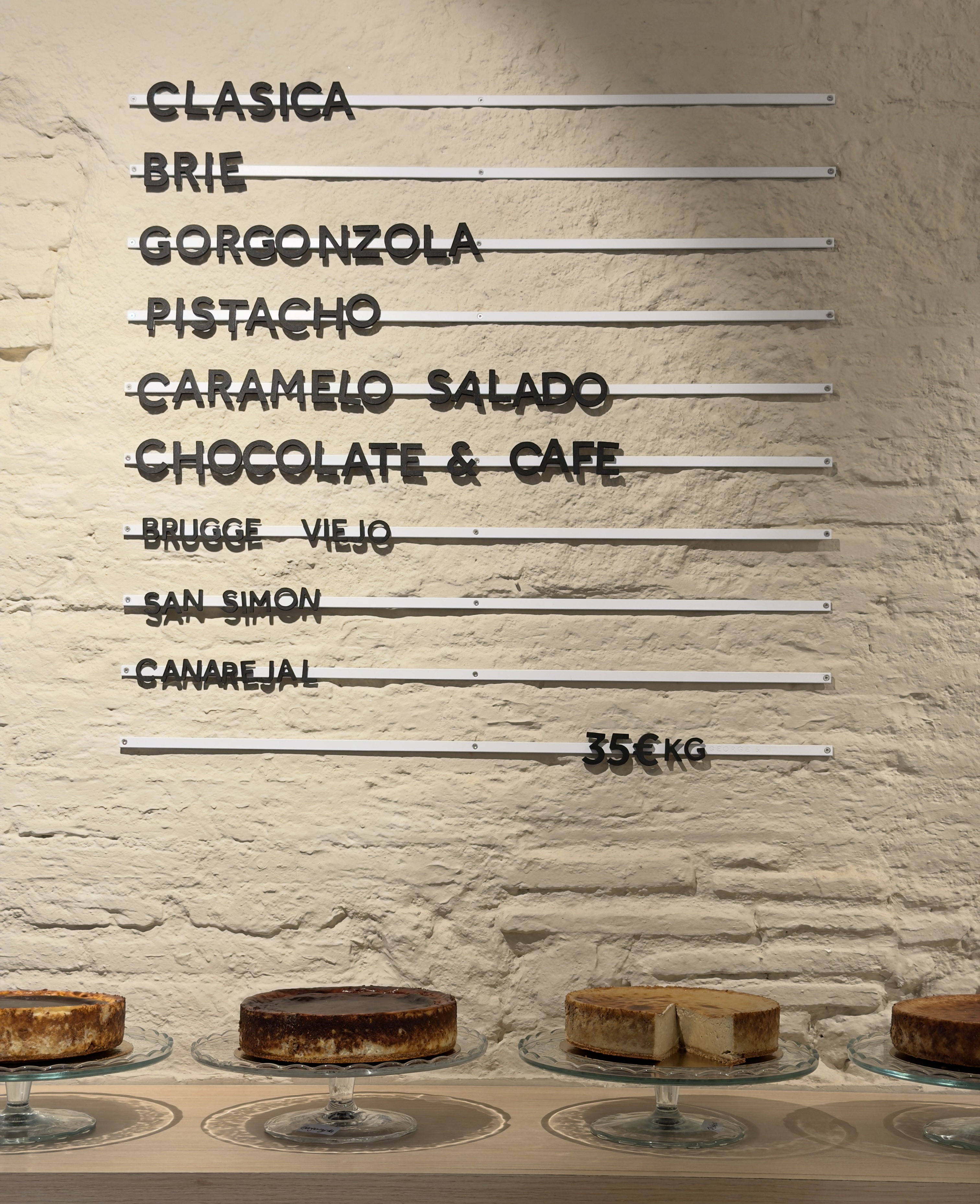 치즈케이크 종류는 클래식, 브리, 고르곤졸라, 피스타치오, 소금 캐러멜, 초콜릿 등입니다. 가격은 무게로 달아서 책정됩니다. 1kg에 35유로. 꽤 비싼 가격이죠. 조각으로 살 때는 나이프를 든 직원과 소통(?)하며 원하는 양을 결정하게 됩니다.