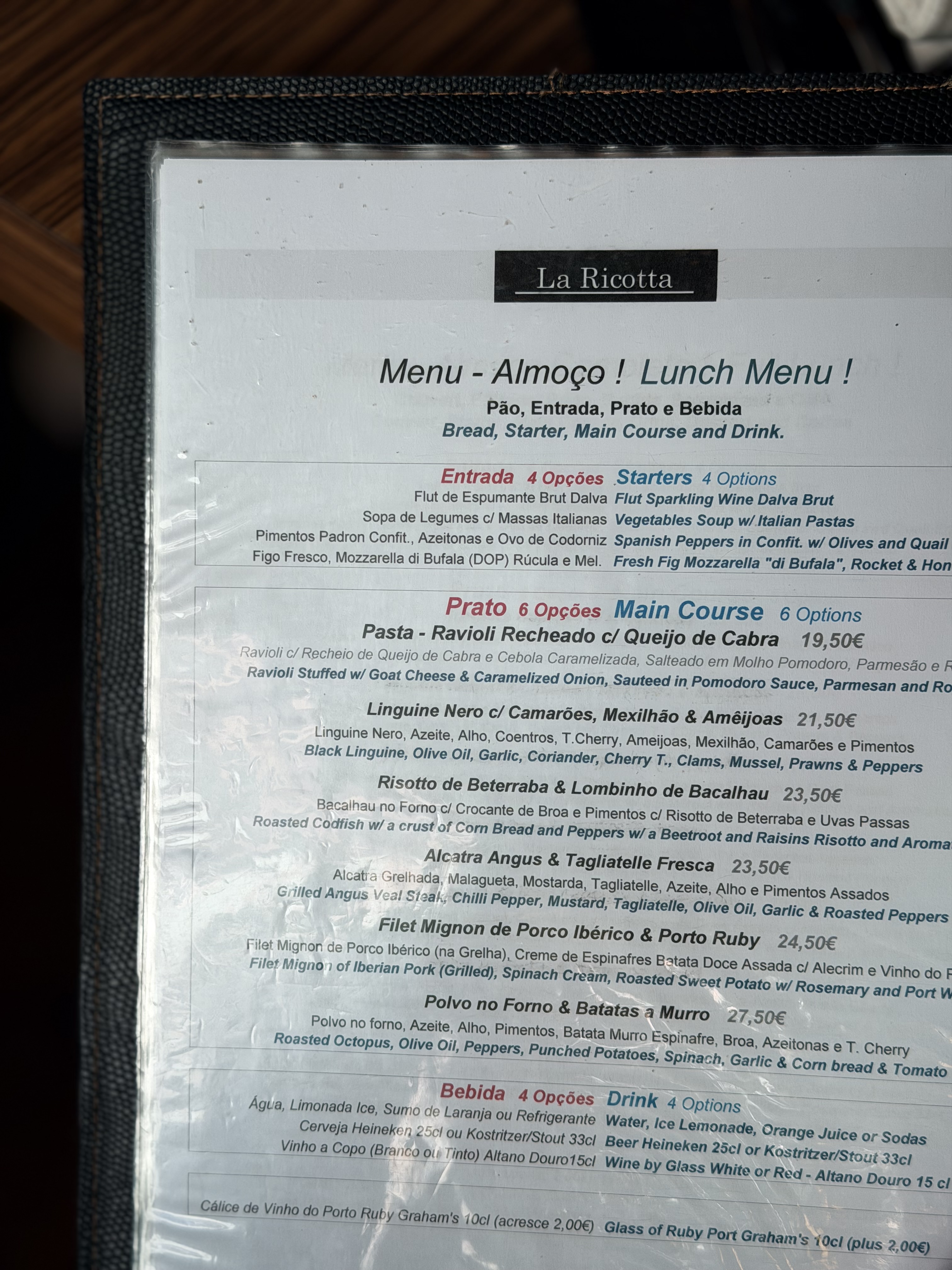 라 리코타는 런치 메뉴의 가성비가 좋습니다. 20-30유로에 스타터와 메인 코스 그리고 음료를 모두 즐길 수 있습니다. 메인 메뉴에 따라 가격이 다르고 저렴한 가격에 와인을 추가할 수도 있습니다. 포트 와인이 한 잔에 2유로! 과거보다 가격도 소폭 오르고 디저트 항목도 빠졌다지만 여전히 경쟁력이 있습니다.
