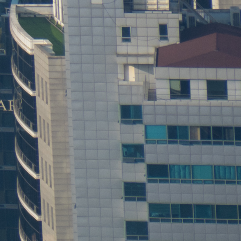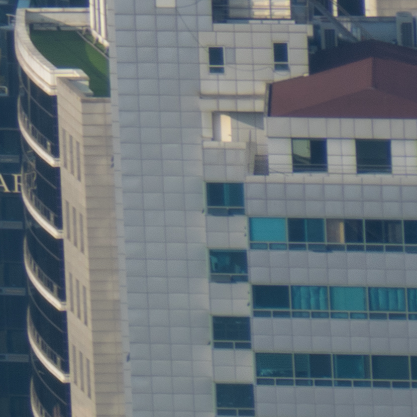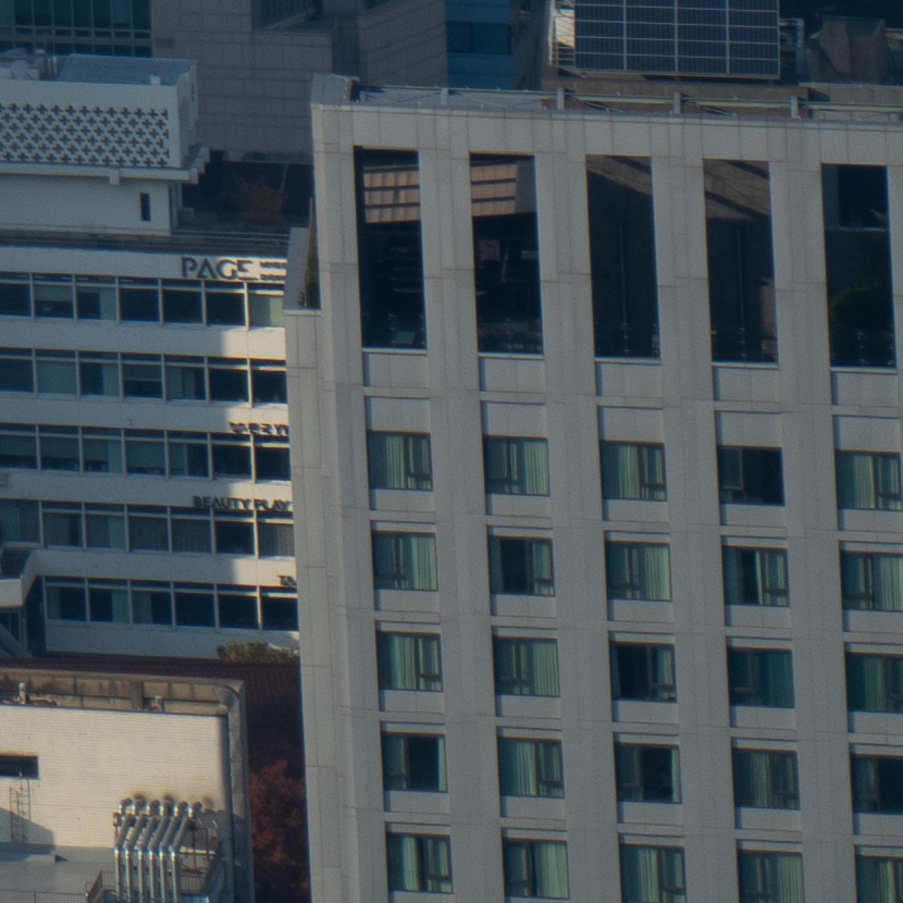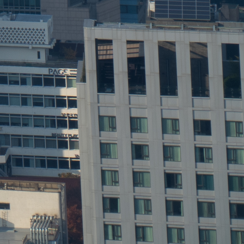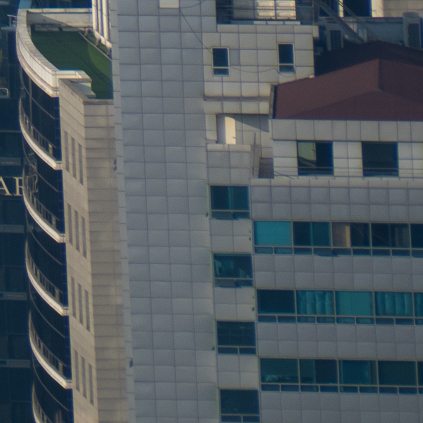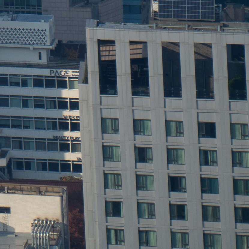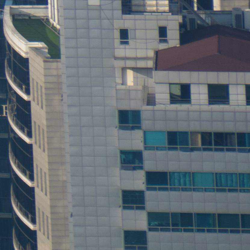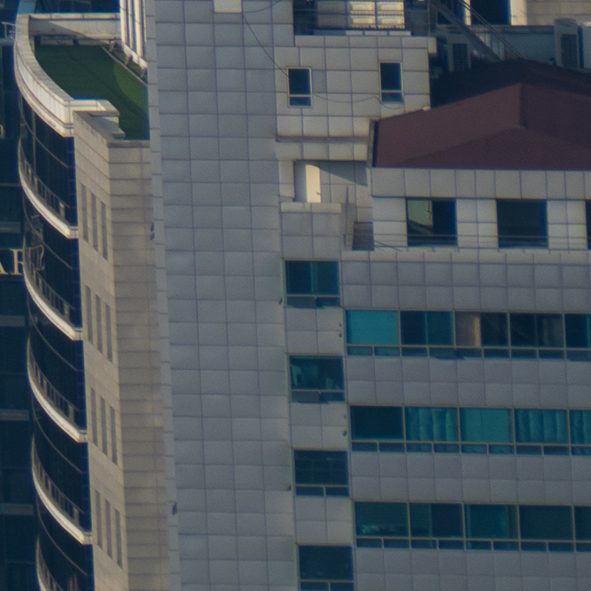 해상력은 합격점. 유의해야 할 것은 왜곡입니다. 광각에서는 가운데가 볼록한, 망원에서는 반대로 중앙이 오목한 형태의 왜곡이 보입니다. 카메라의 보정 옵션을 적용한 뒤 JPG로 촬영하거나 편집 소프트웨어에의 도움을 받는 게 좋겠어요. 원본은 직선, 건축 촬영에서 제법 신경이 쓰입니다.