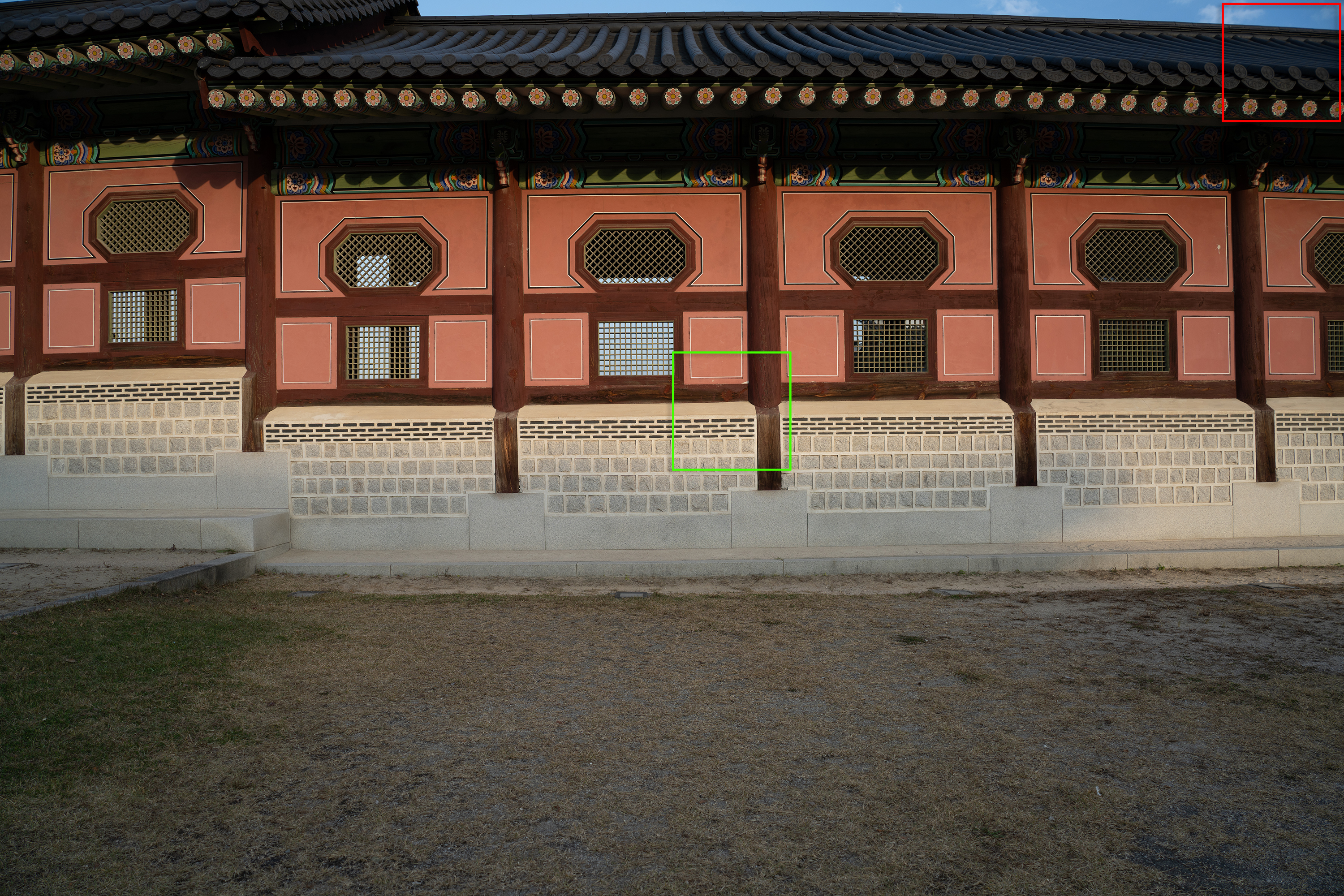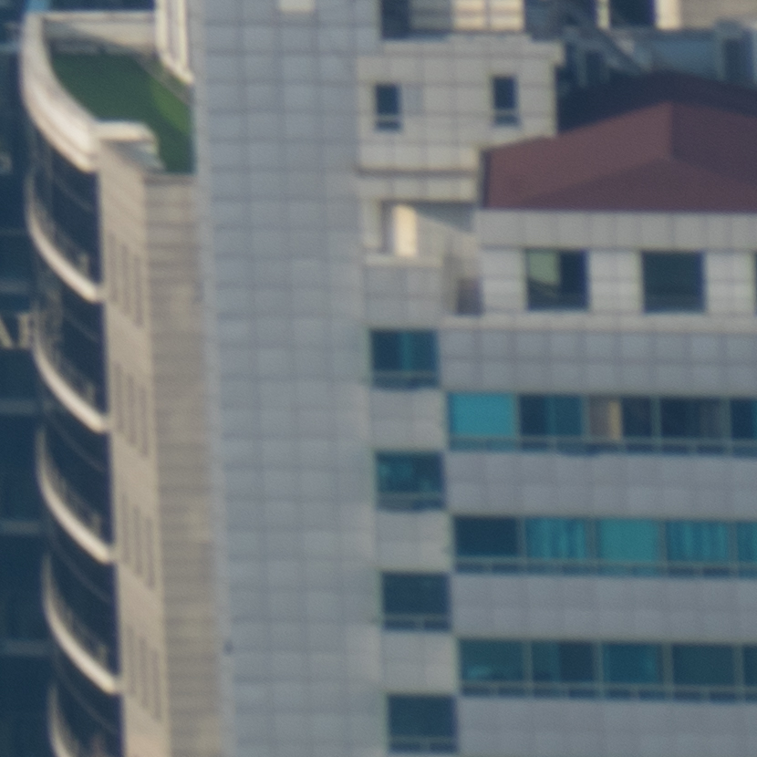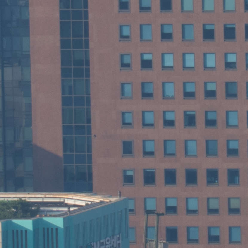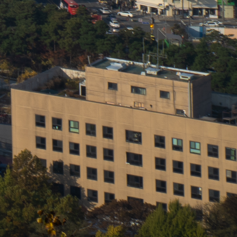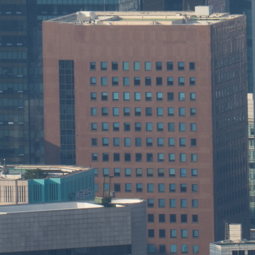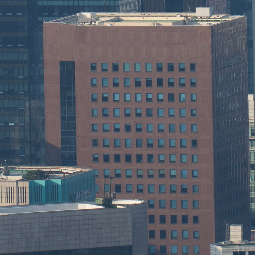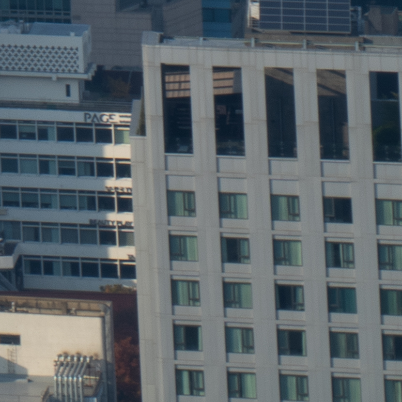 해상력은 합격점. 유의해야 할 것은 왜곡입니다. 광각에서는 가운데가 볼록한, 망원에서는 반대로 중앙이 오목한 형태의 왜곡이 보입니다. 카메라의 보정 옵션을 적용한 뒤 JPG로 촬영하거나 편집 소프트웨어에의 도움을 받는 게 좋겠어요. 원본은 직선, 건축 촬영에서 제법 신경이 쓰입니다.