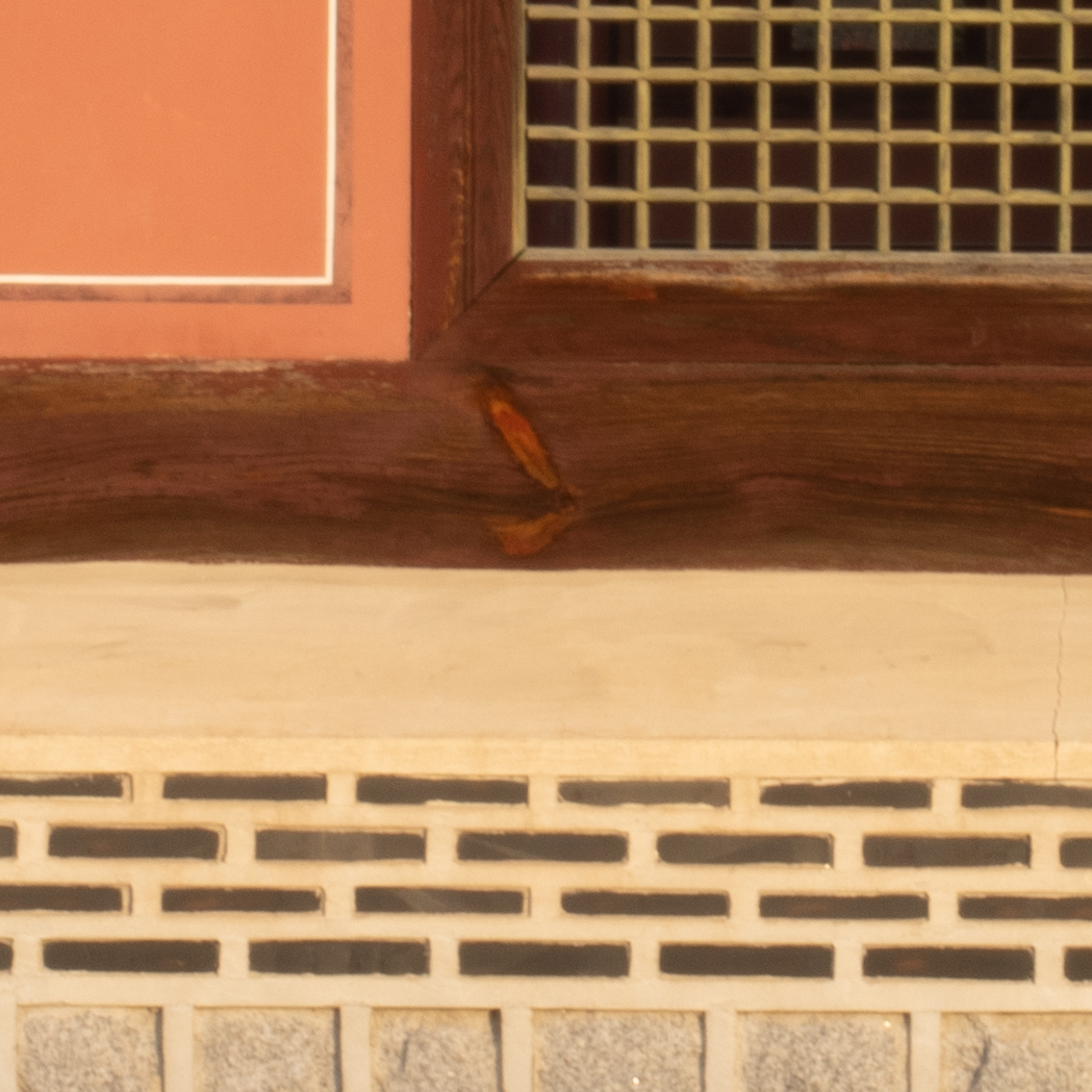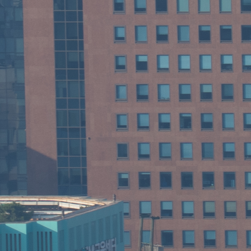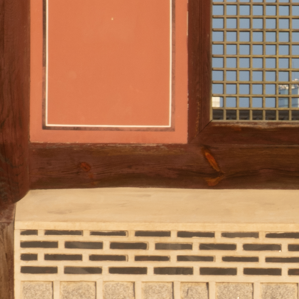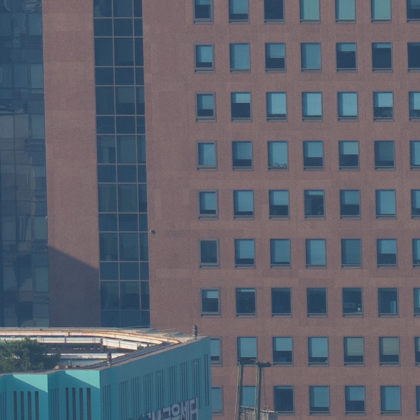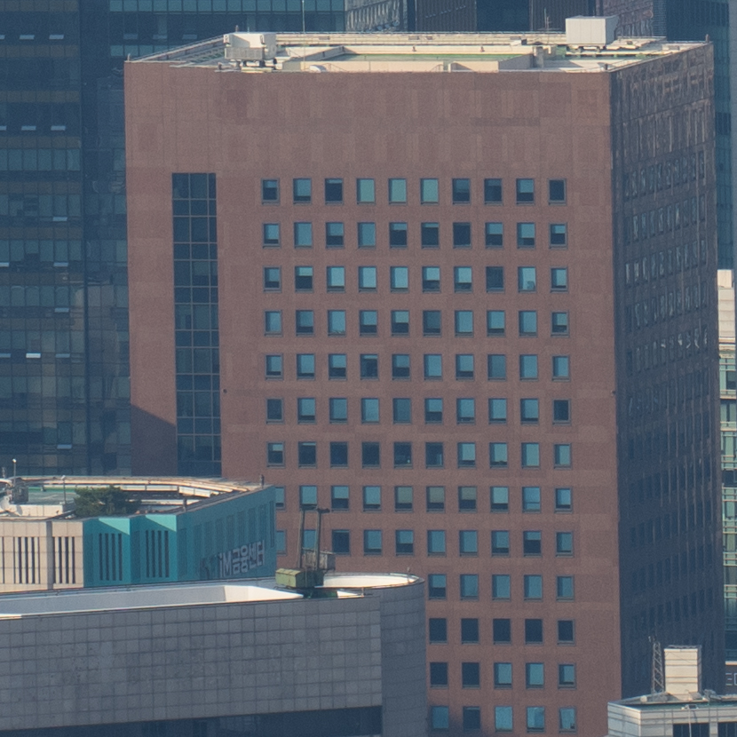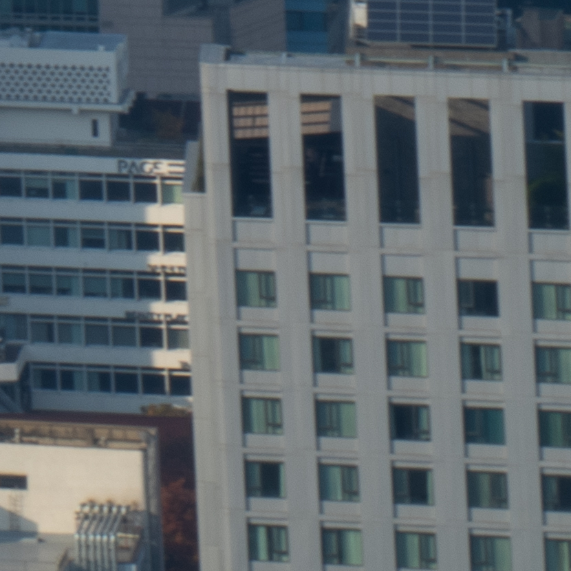 해상력은 합격점. 유의해야 할 것은 왜곡입니다. 광각에서는 가운데가 볼록한, 망원에서는 반대로 중앙이 오목한 형태의 왜곡이 보입니다. 카메라의 보정 옵션을 적용한 뒤 JPG로 촬영하거나 편집 소프트웨어에의 도움을 받는 게 좋겠어요. 원본은 직선, 건축 촬영에서 제법 신경이 쓰입니다.