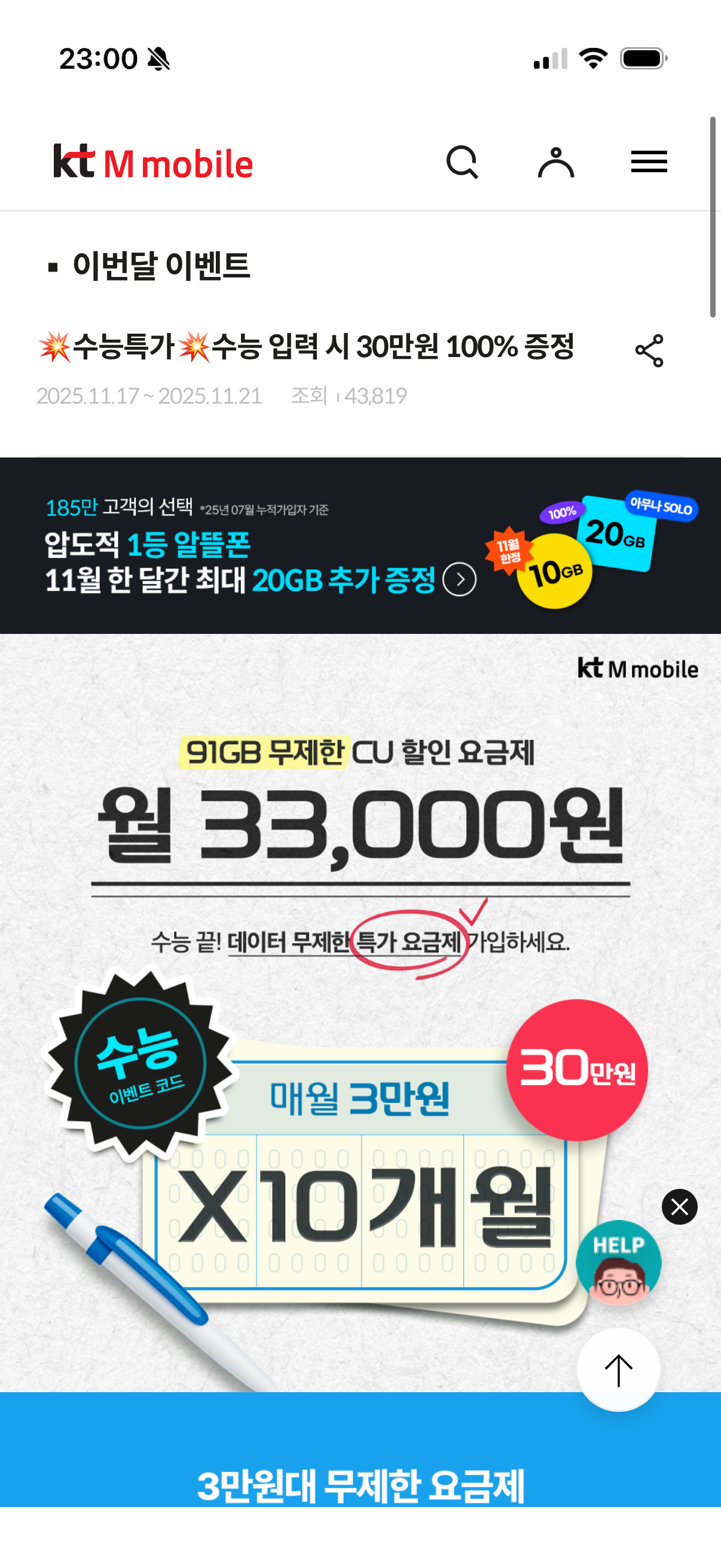 블프 할인 외에도 다양한 이벤트가 진행되고 있습니다. 역시 프로모션 요금제와 코드 입력 혜택을 받을 수 있어요. 대표적인 것이 수능 특가 이벤트입니다. 수능을 마친 수험생들을 위한 특가 요금제 그리고 ‘수능’ 코드로 총 30만 원의 M마켓 포인트를 받을 수 있어요. 이 외에도 요금제 환승, 타임 특가 등의 이벤트가 11월 21일까지 한정적으로 진행되니 확인해 보세요.