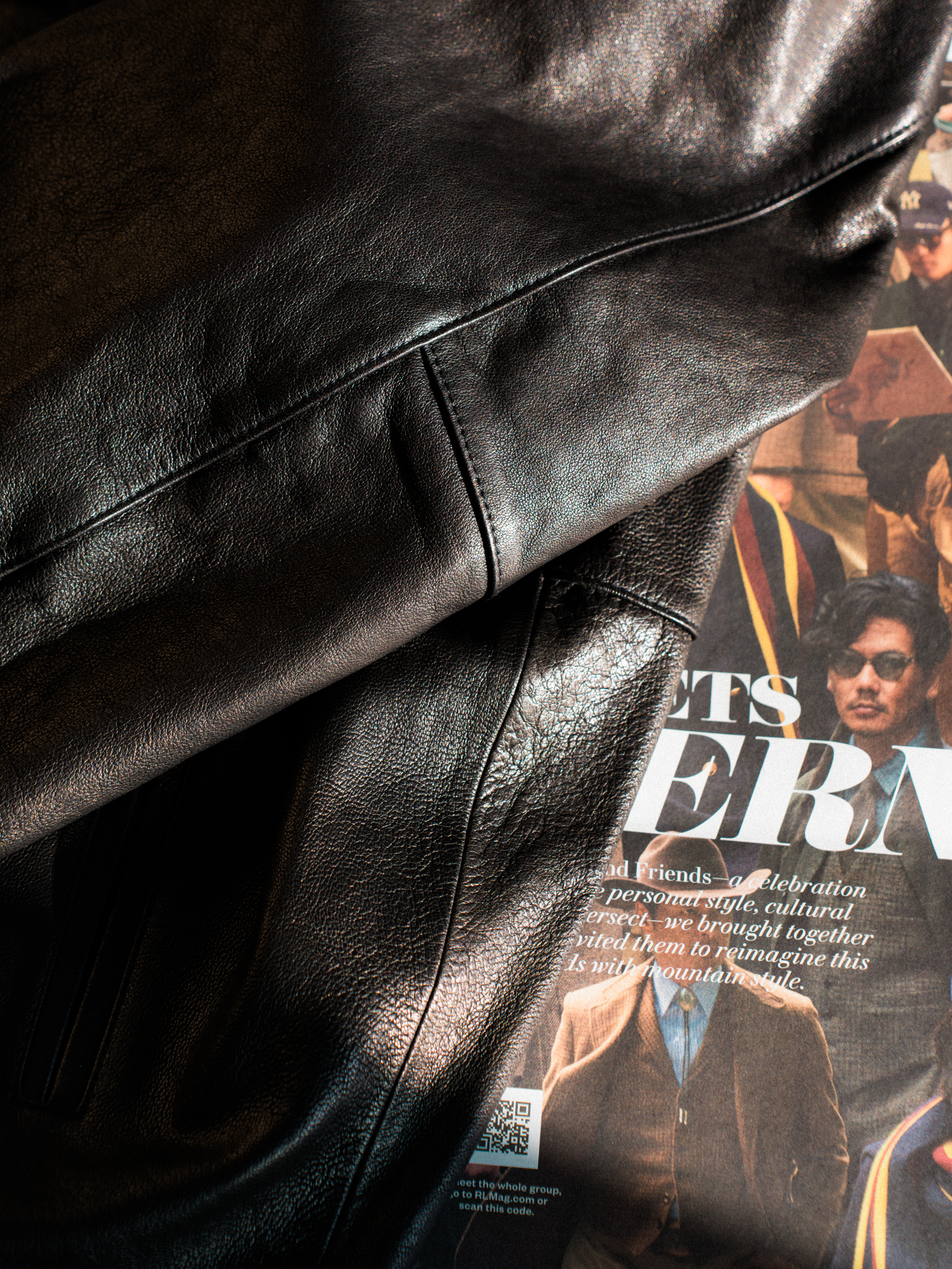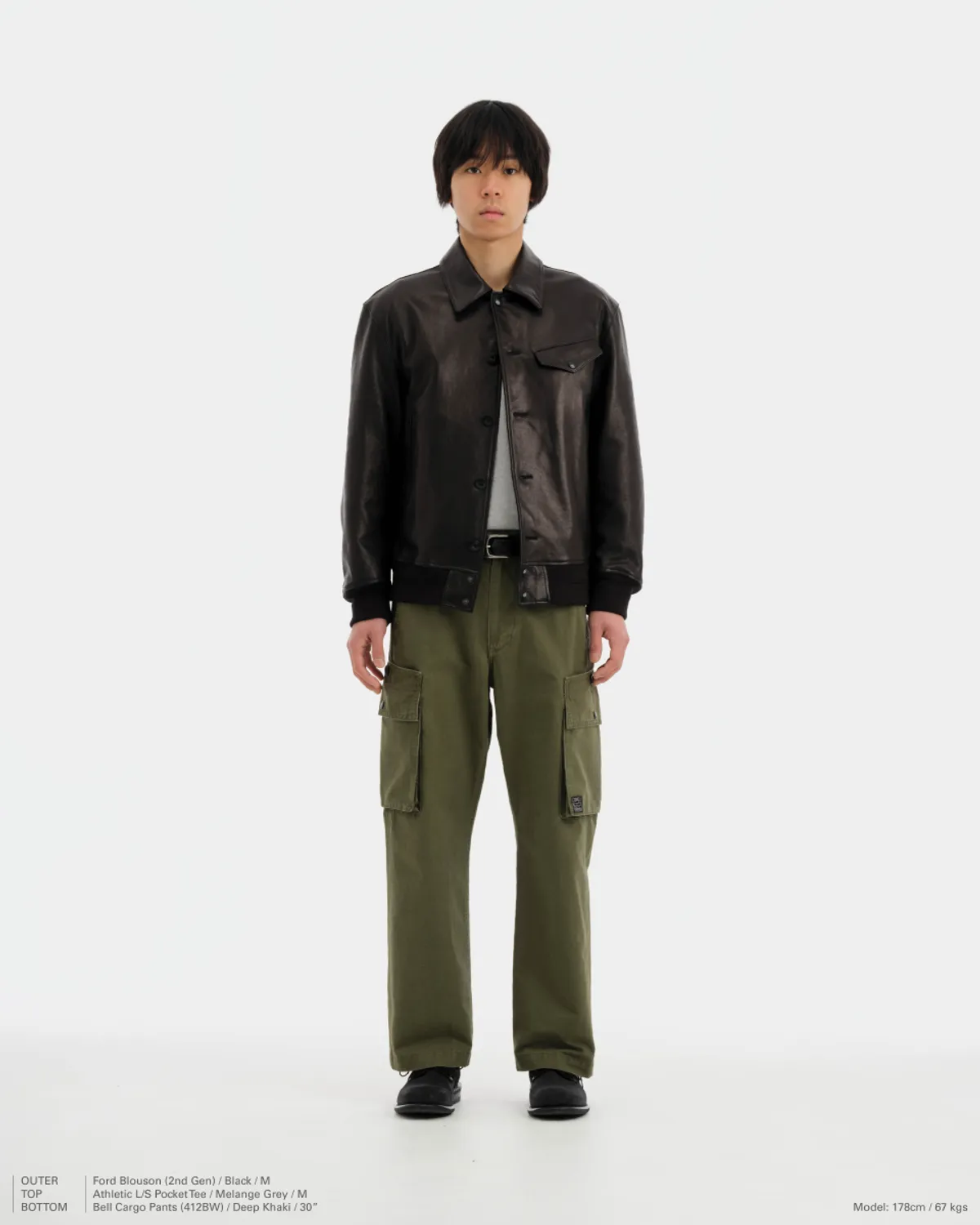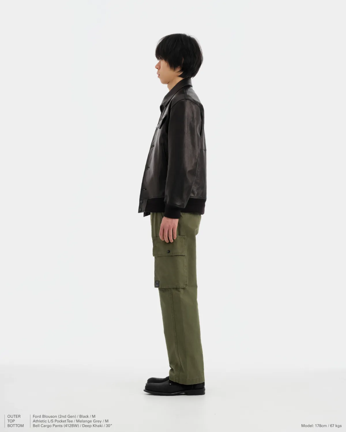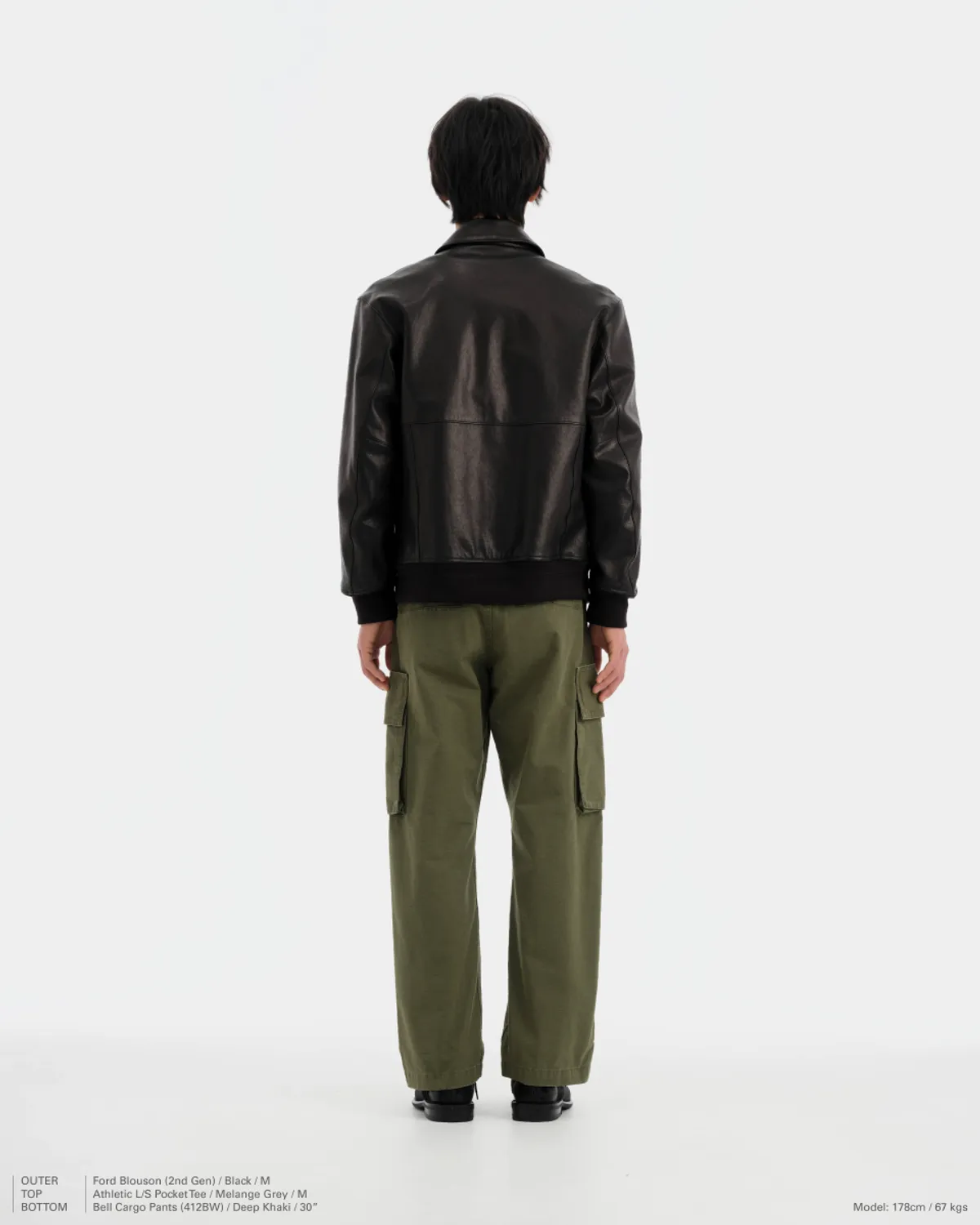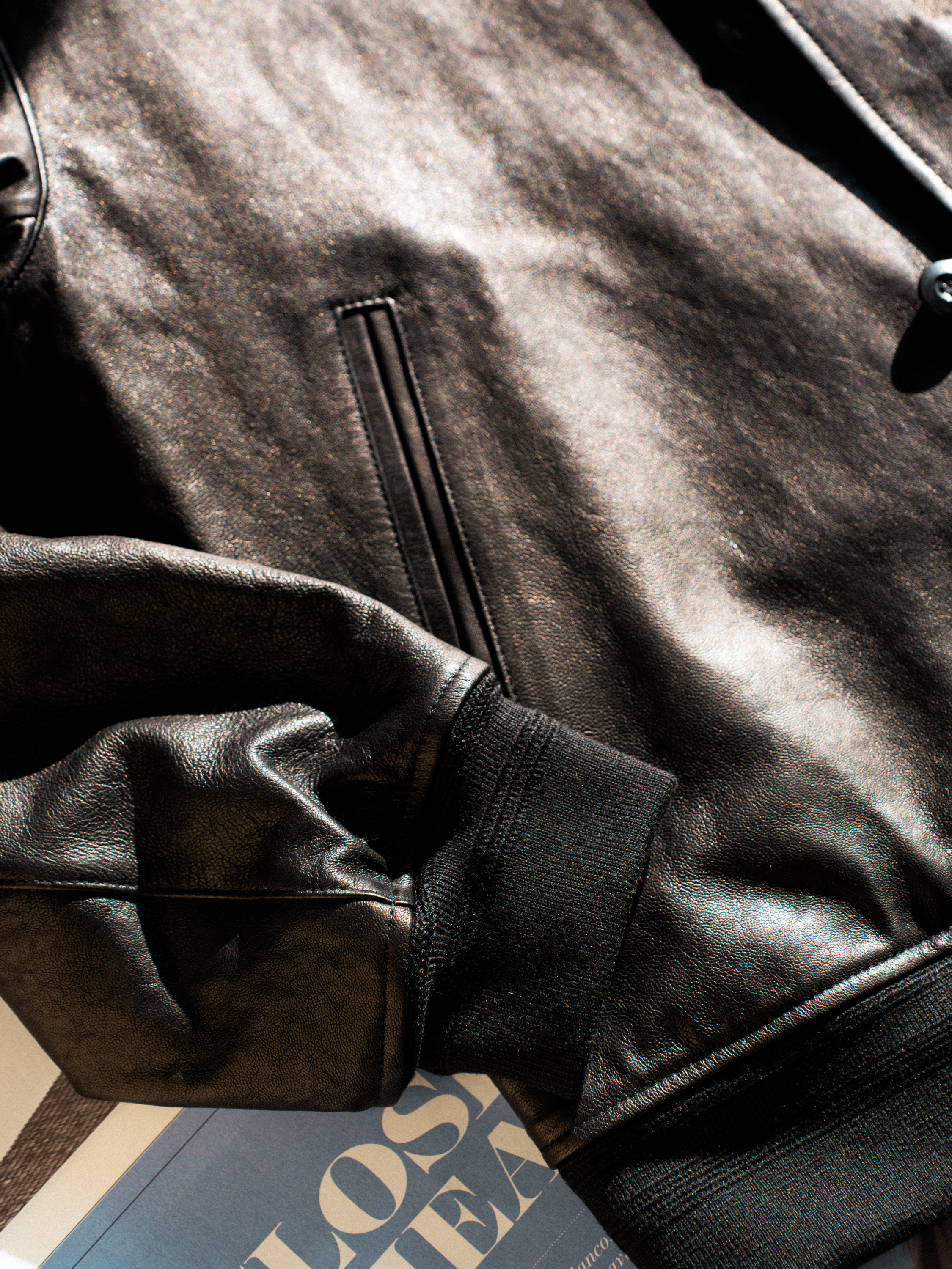 양가죽으로 만든 재킷입니다. 블랙 컬러지만 은은하게 갈색이 돌아서 제 취향에 잘 맞아요. 허리와 소매에 립(시보리)가 있는 블루종 재킷이며 목에는 칼라가 있습니다. 아래는 브랜드가 소개한 제품의 주요 사양입니다.