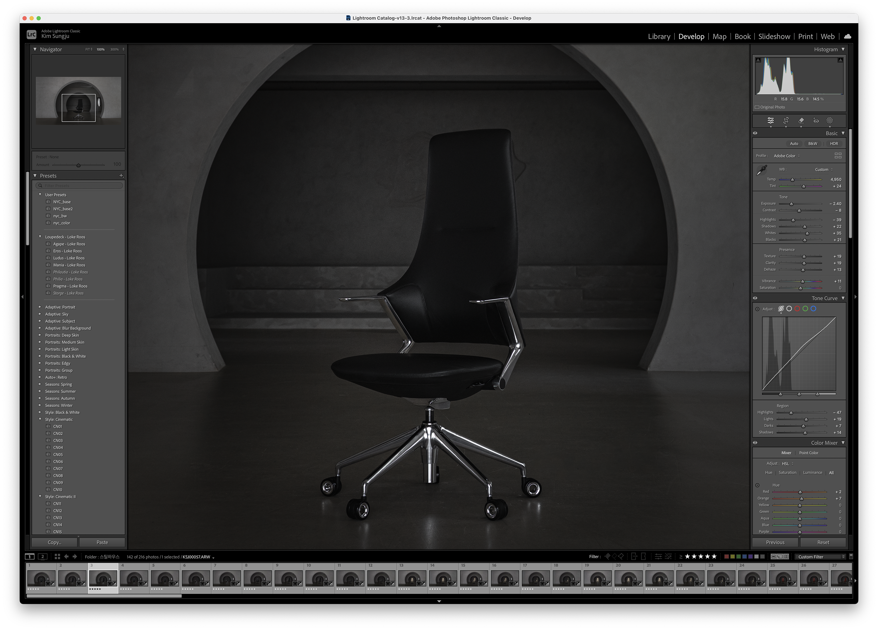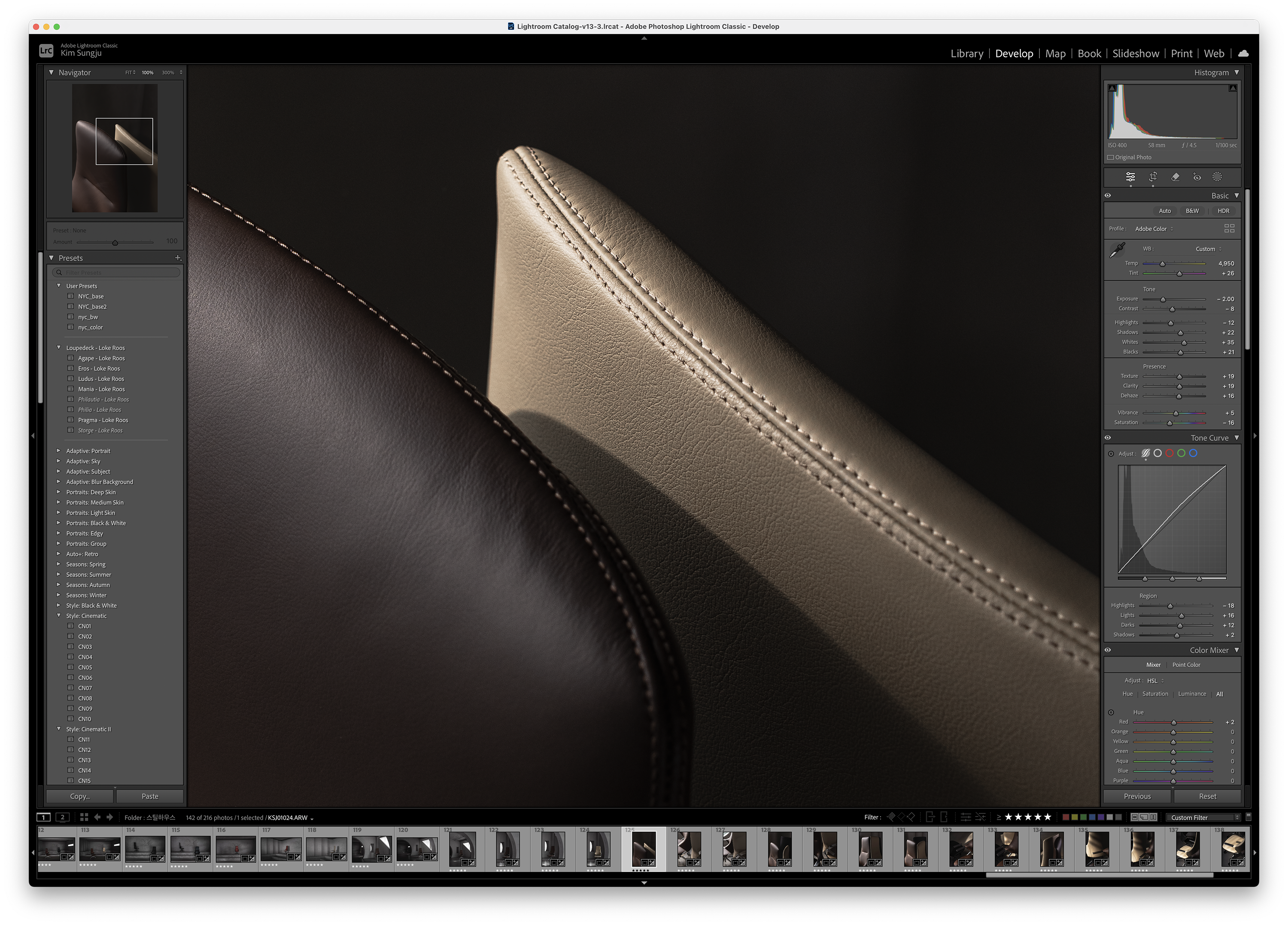 의자는 가죽의 색, 프레임 소재에 따라 총 8개가 있었습니다. 각 제품별로 대표 사진 몇 장만 촬영하기에도 시간이 꽤 필요하죠. 이럴 때는 줌렌즈가 확실히 수월합니다. 프레임을 바꾸기 위해 카메라를 들고 옮기는 수고만큼은 상당 부분 줄일 수 있으니까요. 렌즈를 바꾸는 번거로움도 그렇고. 이날은 35mm를 많이 사용했습니다.