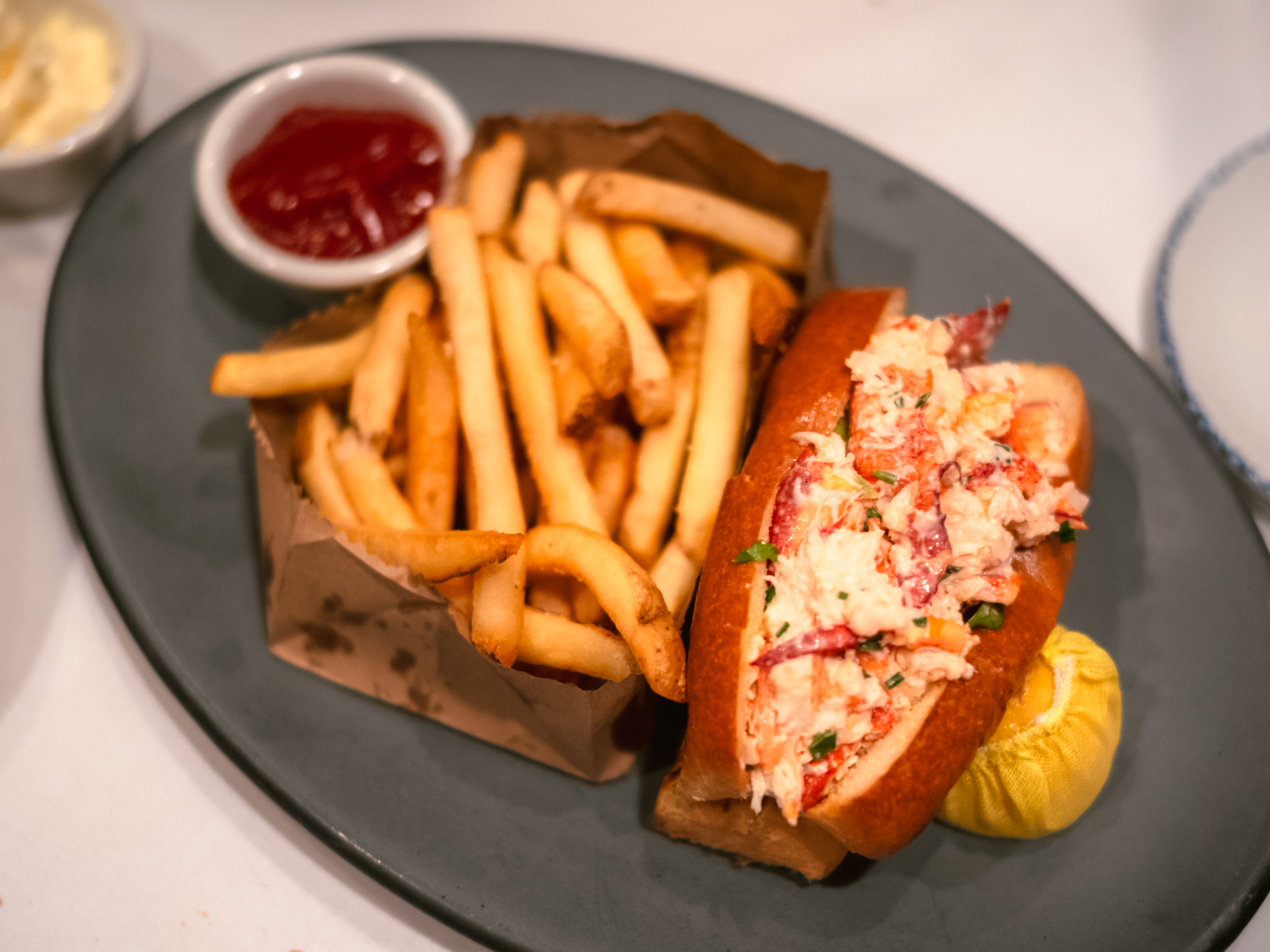혼자 먹었던 메인 랍스터 롤. 버터를 발라 겉바속촉으로 구운 브리오슈 번에 랍스터 살과 소스, 채소를 채워 넣은 메뉴입니다. 거기에 빵보다 양이 많은 감자 튀김이 함께 나옵니다. 왼쪽에 보이는 레몬을 랍스터 롤에 즙을 내 뿌리면 비린 내도 줄고 전체적인 향의 조화도 좋아집니다. 랍스터 요리에 관심이 없는 저도 뉴욕-보스턴 출장을 통틀어 기억에 남는 버거&샌드위치로 이집 랍스터 롤을 꼽을만큼 만족한 메뉴였어요. 특히 빵이 맛있더군요. 랍스터 롤을 먹으면서 빵맛부터 꼽는 저는 어쩔 수 없는 빵돌이입니다.