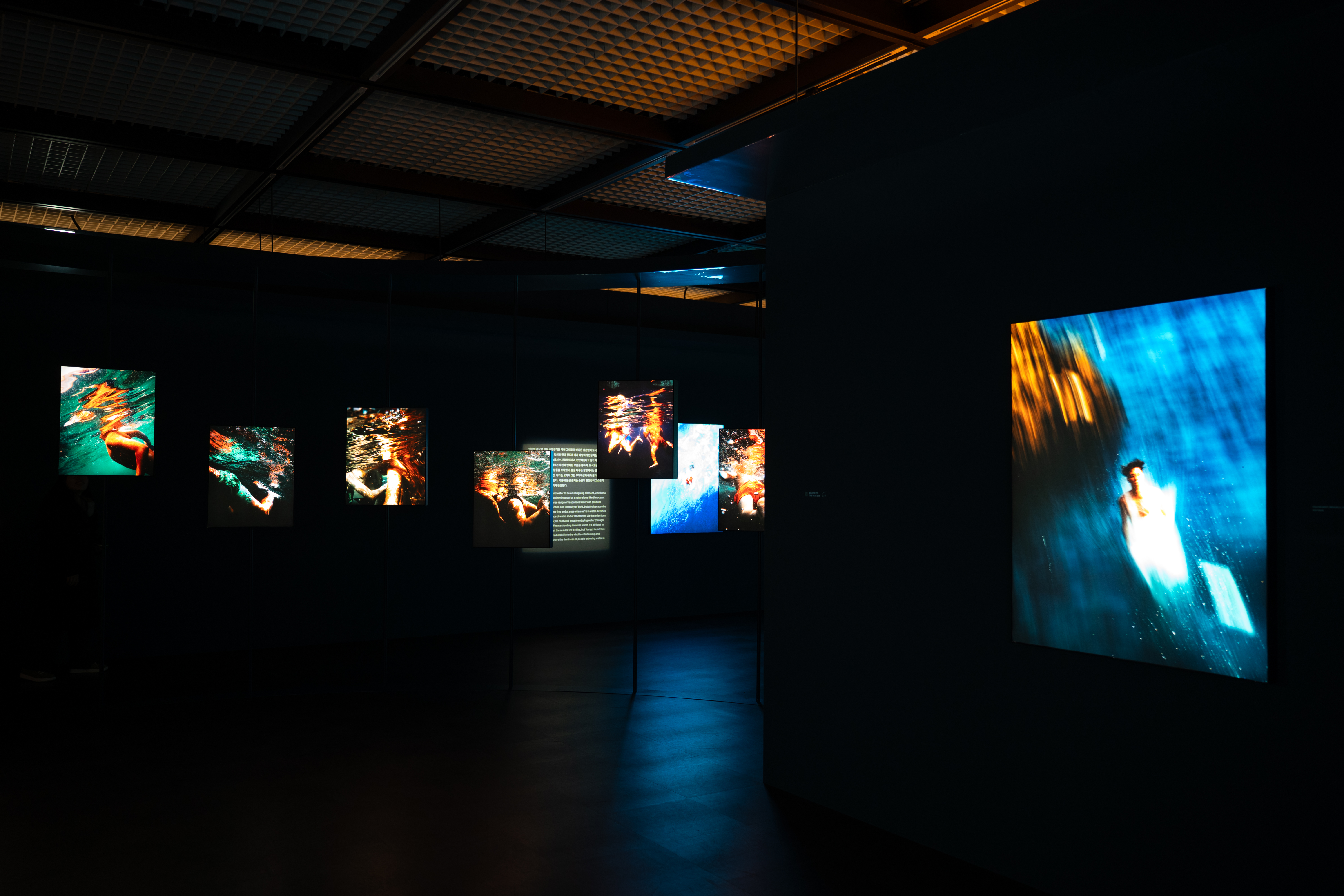 물을 주제로 한 사진들이 검은 공간에 떠 있습니다. 각 작품들은 조명으로 비춰 돋보이게 했고요. 수중 촬영 사진들이 꽤 많이 포함돼 있는데 그런 감각을 전달하기 위한 연출로 보였어요. 쉽게 찍고, 보기 힘든 사진들이라 흥미를 불러 일으켰습니다. 역시나 작가 특유의 익살스런 프레임, 절묘한 포착들이 보였고요. 요시고의 사진들은 어려운 테크닉을 사용하지 않아서 보기에 편합니다. 하지만 한 컷 한 컷 인내와 순발력이 느껴져서 역시 사진가구나 하는 생각도 동시에 들어요.