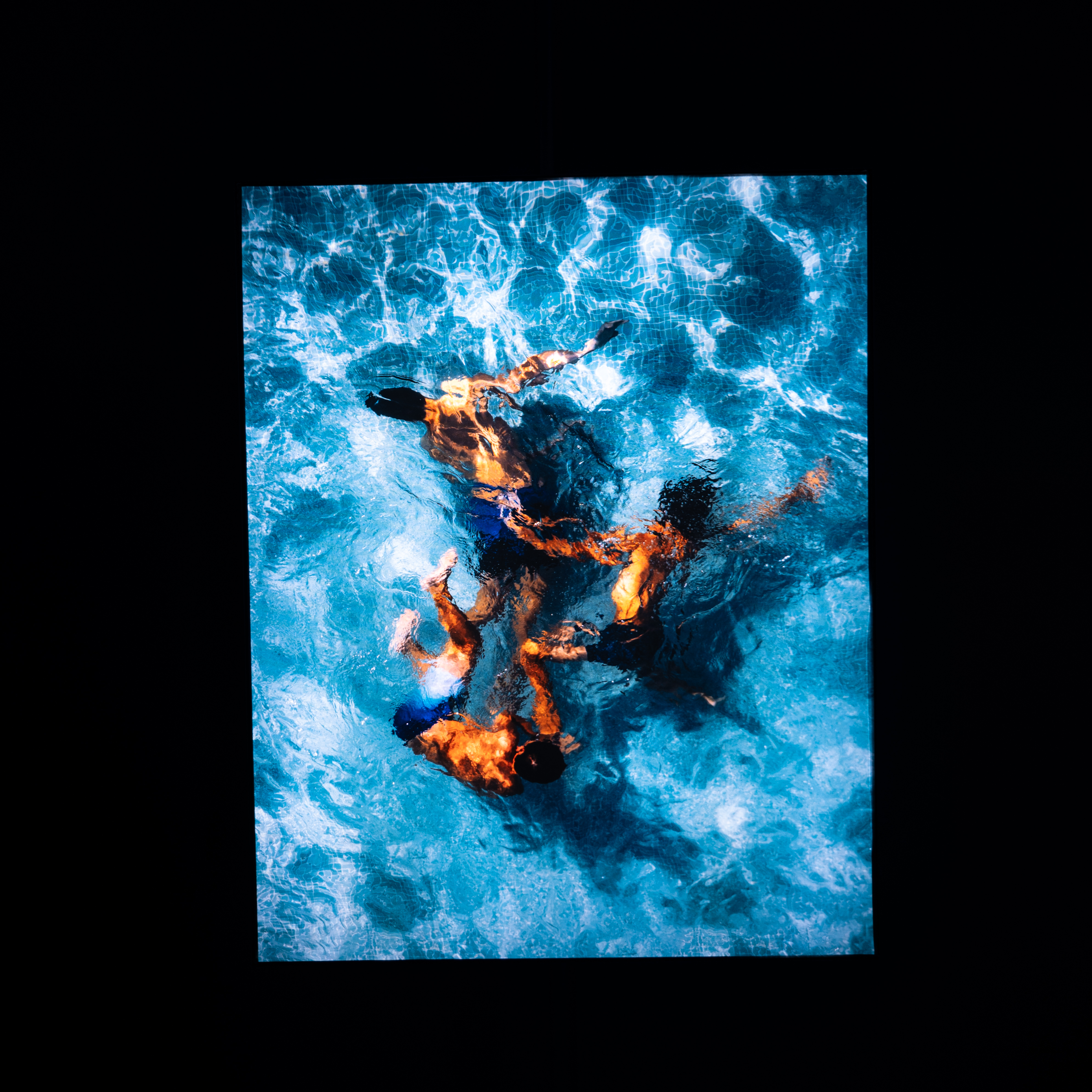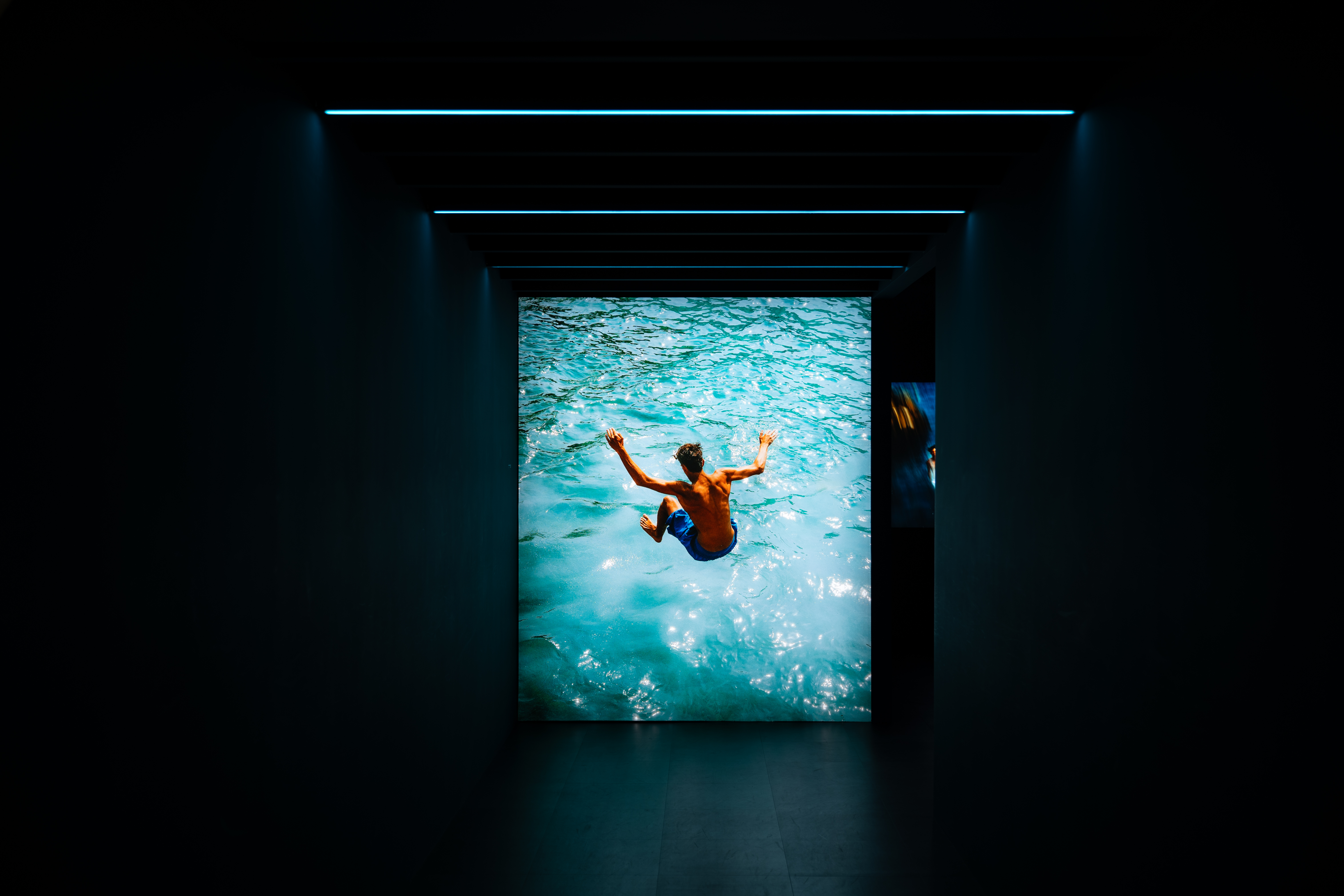 물을 주제로 한 사진들이 검은 공간에 떠 있습니다. 각 작품들은 조명으로 비춰 돋보이게 했고요. 수중 촬영 사진들이 꽤 많이 포함돼 있는데 그런 감각을 전달하기 위한 연출로 보였어요. 쉽게 찍고, 보기 힘든 사진들이라 흥미를 불러 일으켰습니다. 역시나 작가 특유의 익살스런 프레임, 절묘한 포착들이 보였고요. 요시고의 사진들은 어려운 테크닉을 사용하지 않아서 보기에 편합니다. 하지만 한 컷 한 컷 인내와 순발력이 느껴져서 역시 사진가구나 하는 생각도 동시에 들어요.
