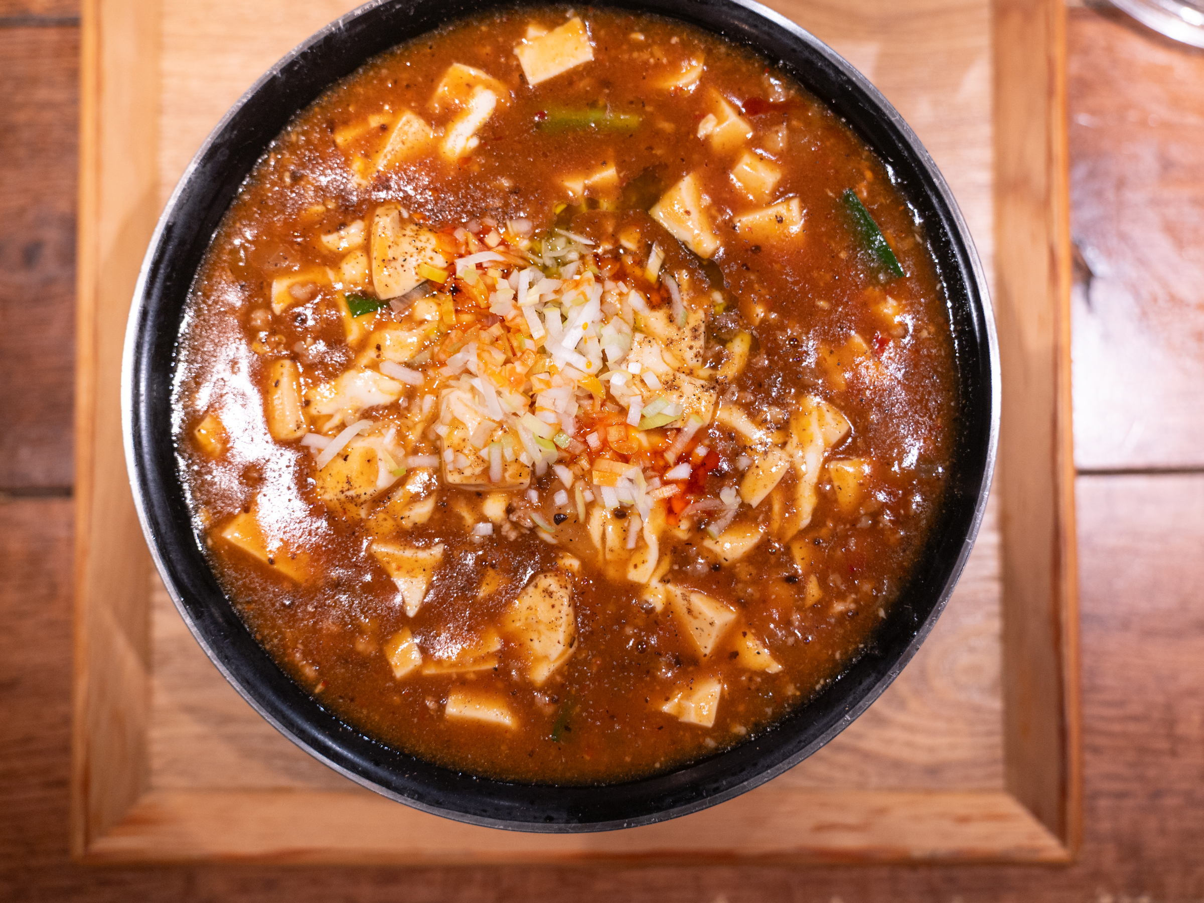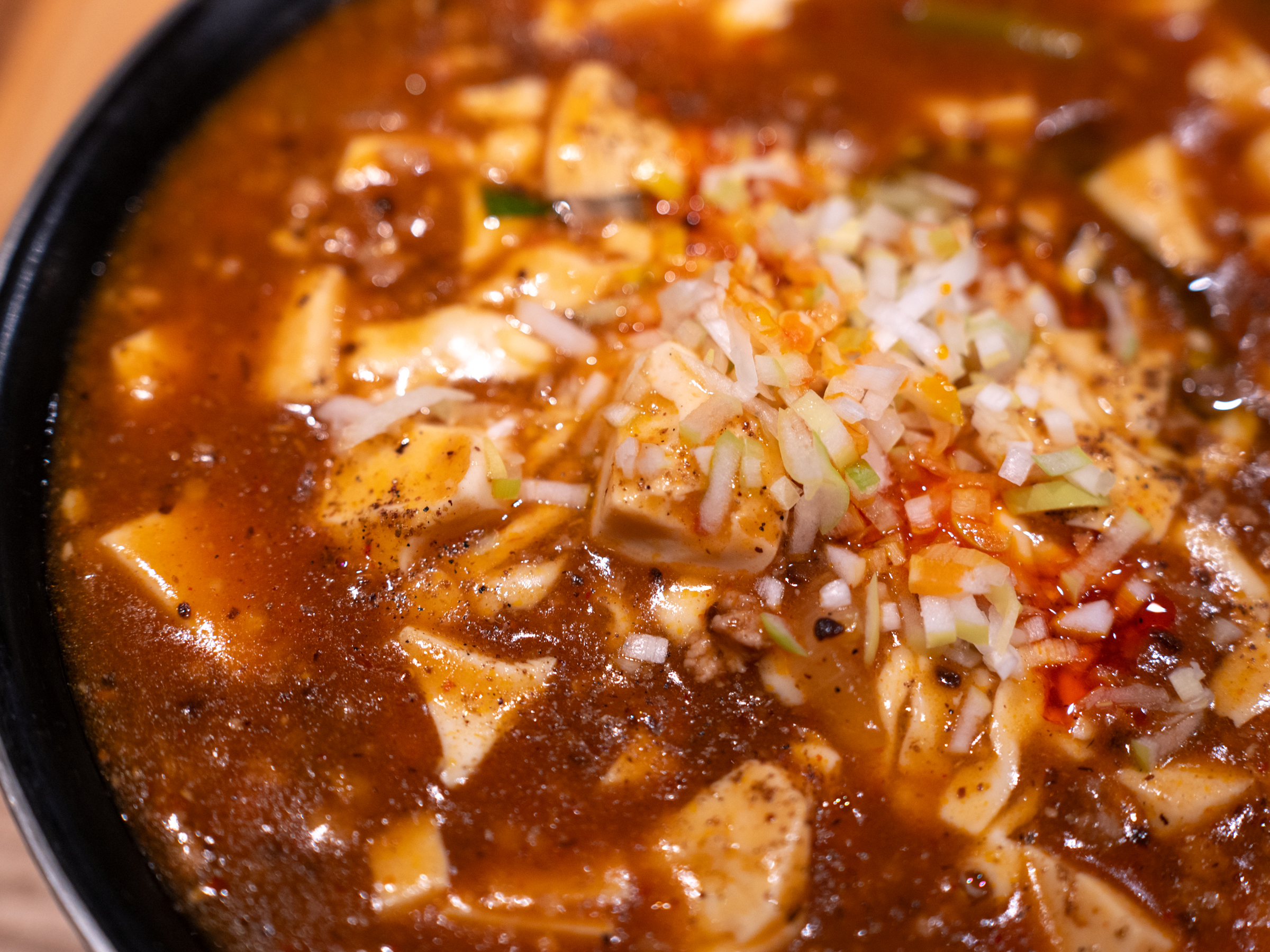 흔히 알고 있는 마파두부와 비슷하지만 면요리에 맞춰 농도를 조절했습니다. 울면 등 전분을 넣은 면요리와 비슷하게요. 면은 중면을 사용했는데 자극적인 마파두부의 맛과 어울려요. 얇은 면은 소스의 농도와도 어울리지 않았을 것 같습니다.