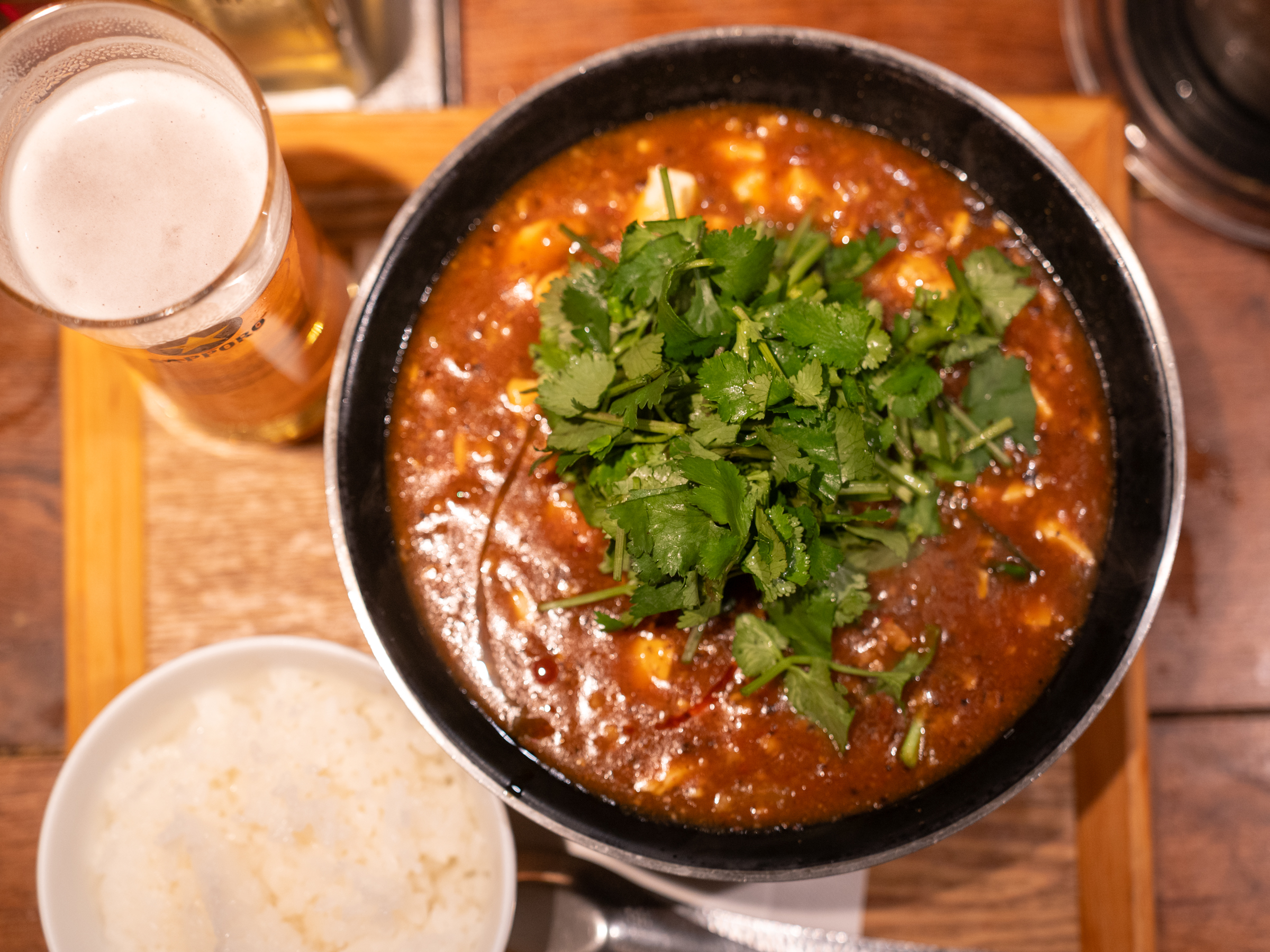 첫 방문때 주문한 마파두부멘. 거기에 밥과 고수를 추가했습니다. 먼저 다녀간 사람들의 후기에 고수 추천이 꽤 있었거든요. 밥을 추가해 마파두부 덮밥을 함께 먹을 수 있다는 얘기도. 그리고 당연히 나마비루까지.