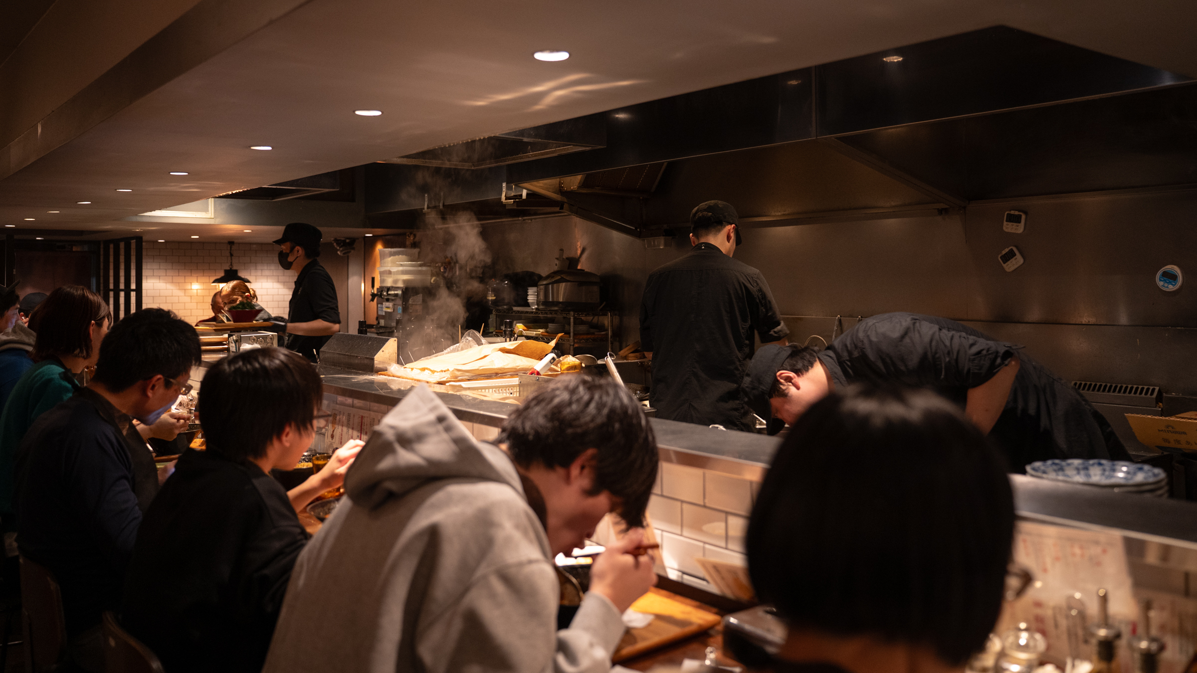 두 번 방문했는데 첫 번째는 평일이고 식사 시간을 피해서인지 줄 서지 않고 바로 입장할 수 있었어요. 하지만 주말 방문에선 삼십 분 이상 줄을 섰습니다. 식사 시간을 피해 방문하는 것이 좋겠습니다. 좌석은 긴 바와 테이블로 구성돼 있습니다. 혼자 방문한 저는 당연히 바에 앉았고요. 주방에서 음식이 만들어지는 모습을 볼 수 있어서 평소에도 이 자리를 좋아합니다.