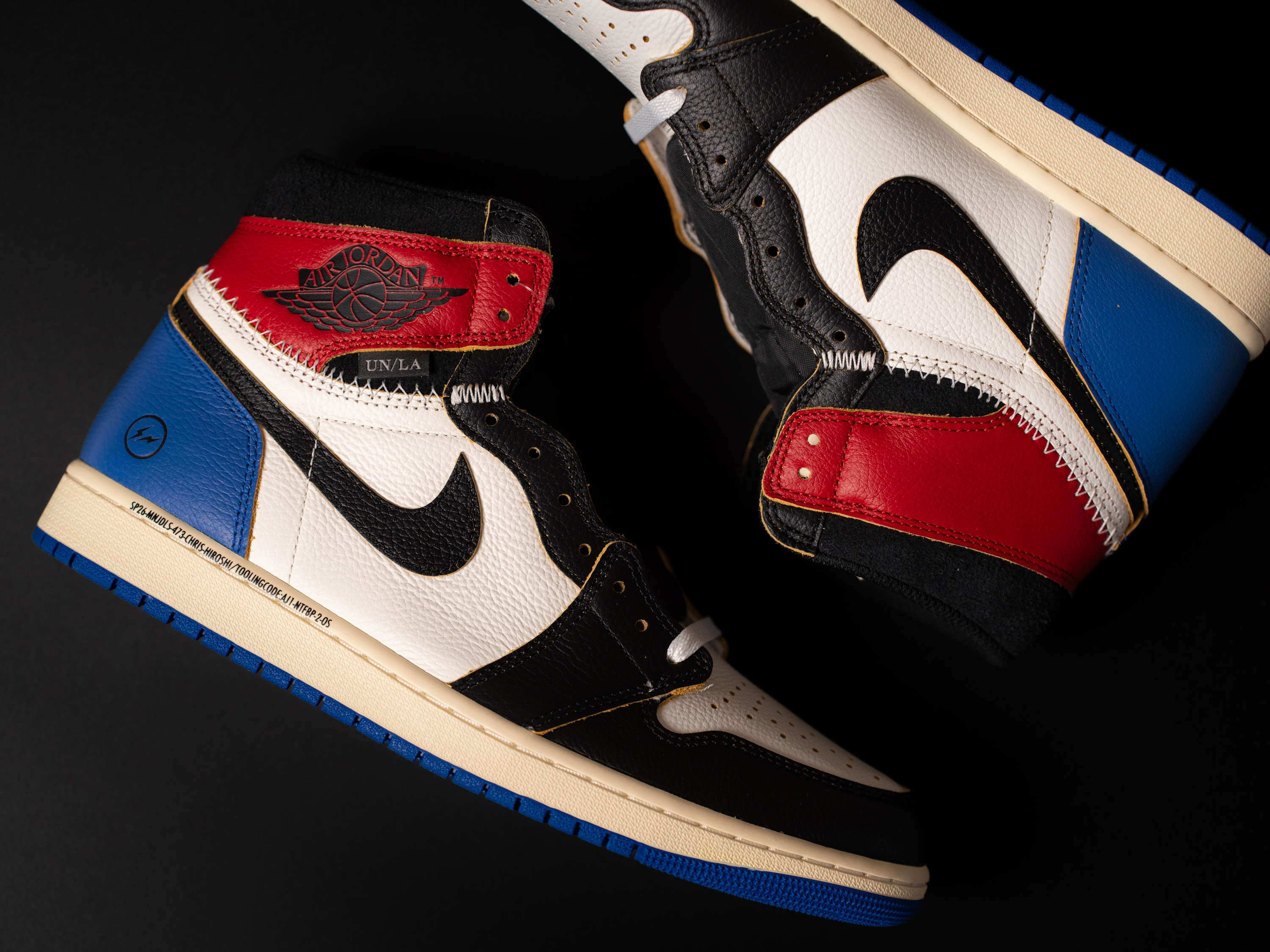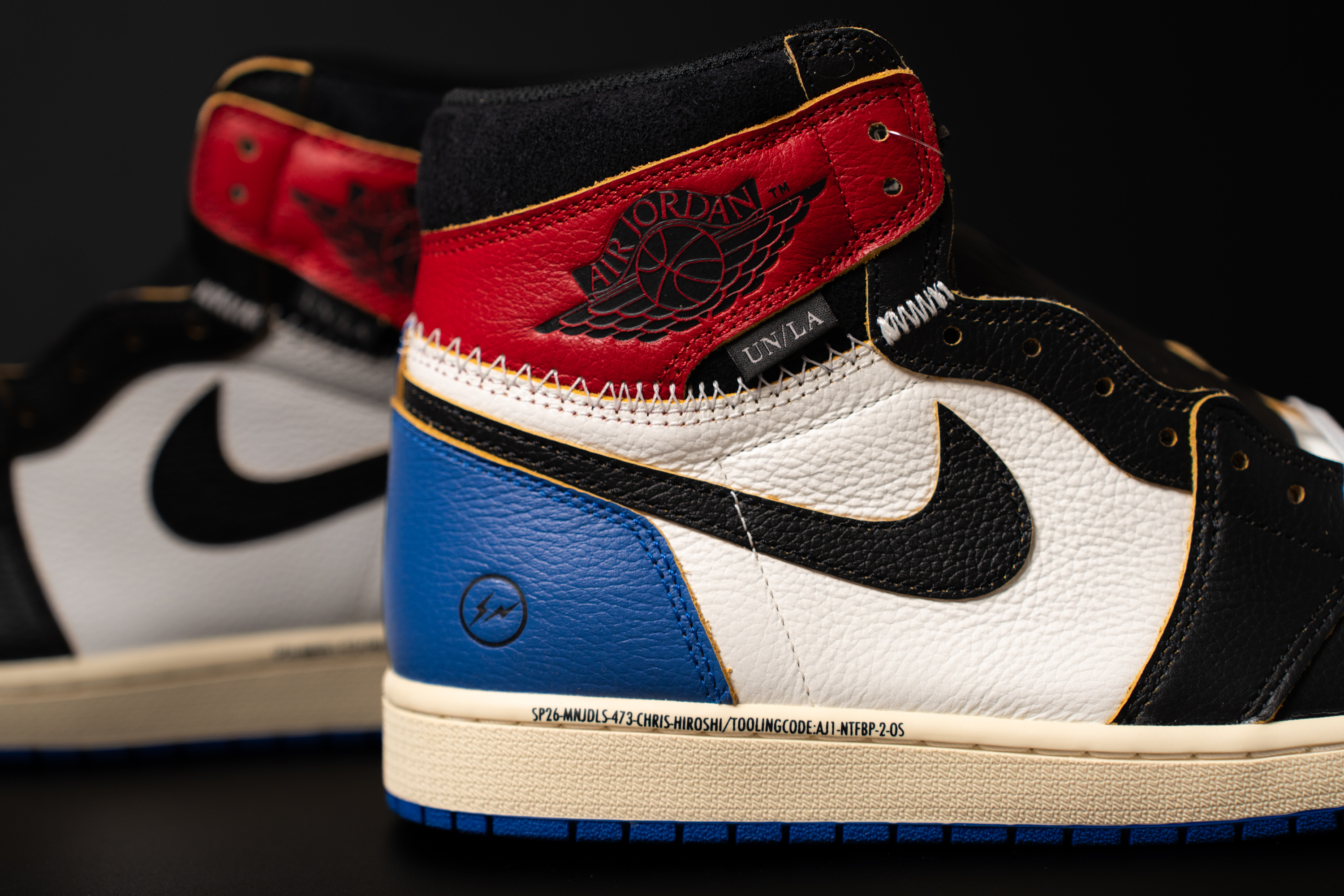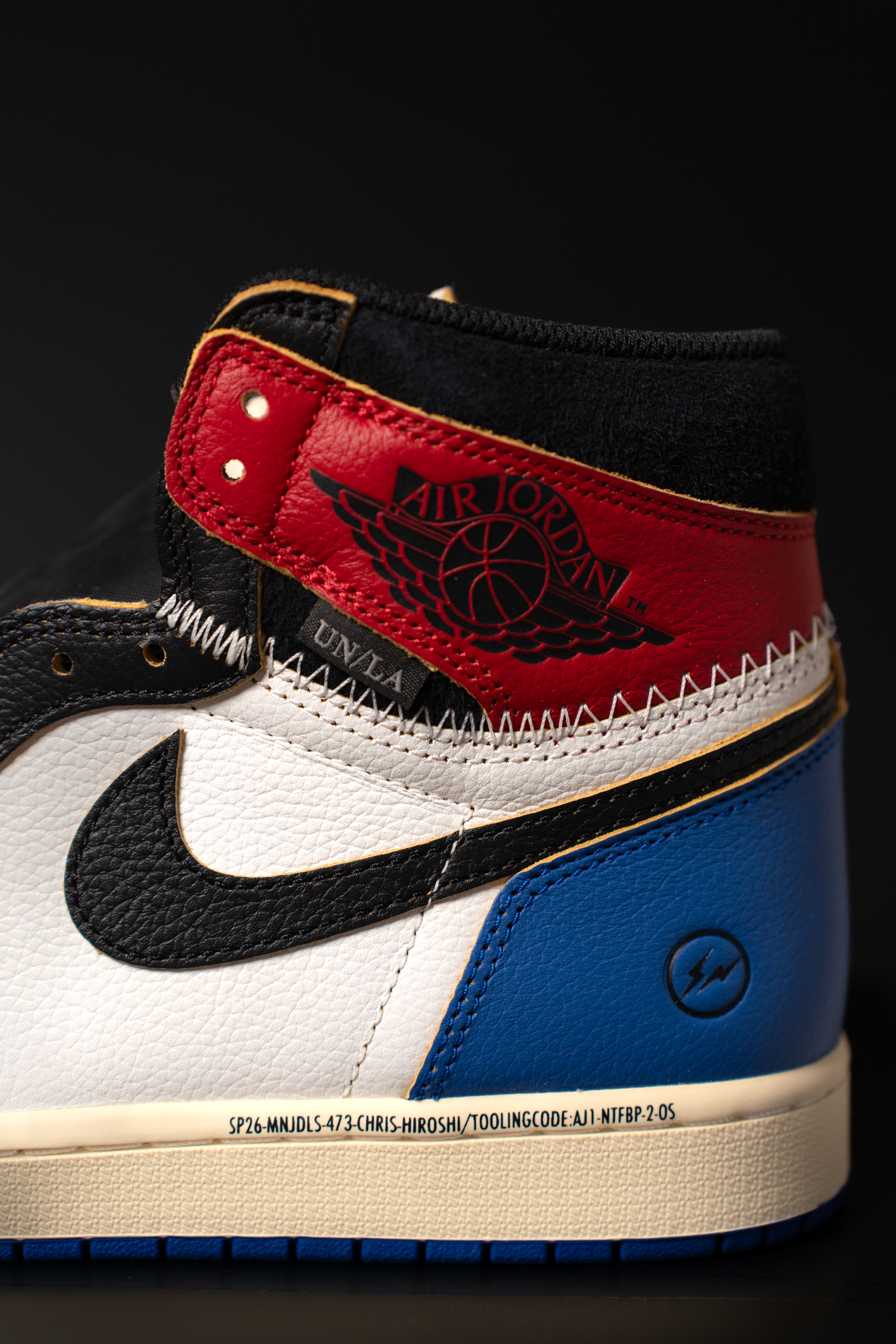 3자 협업의 정체성을 볼 수 있는 사진입니다. 발목쪽엔 유니온 LA 협업의 상징인 UN/LA 탭과 스티치가 있어요. 마치 다른 신발의 파츠를 가져 와 짜깁기 한 듯한 디테일입니다. 아랫쪽엔 프라그먼트 디자인의 번개 로고 그리고 SP26으로 시작되는 문구가 있습니다.