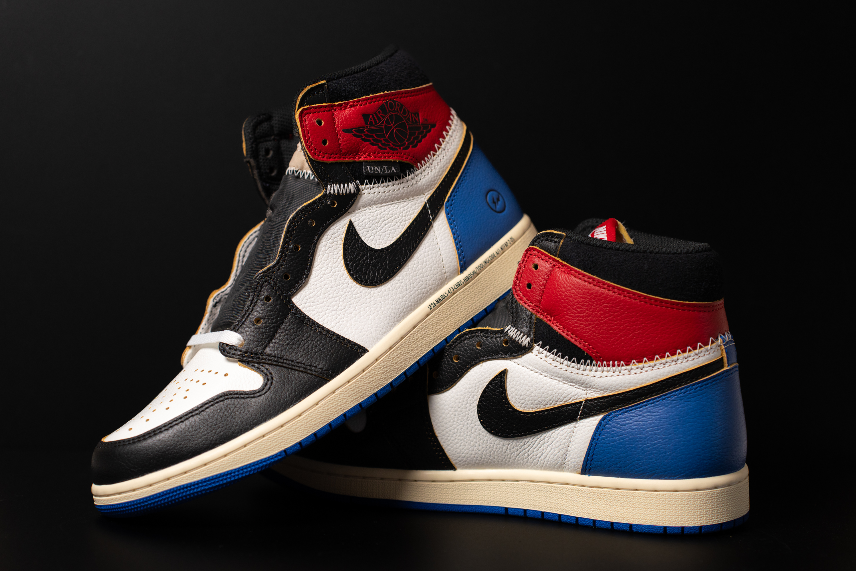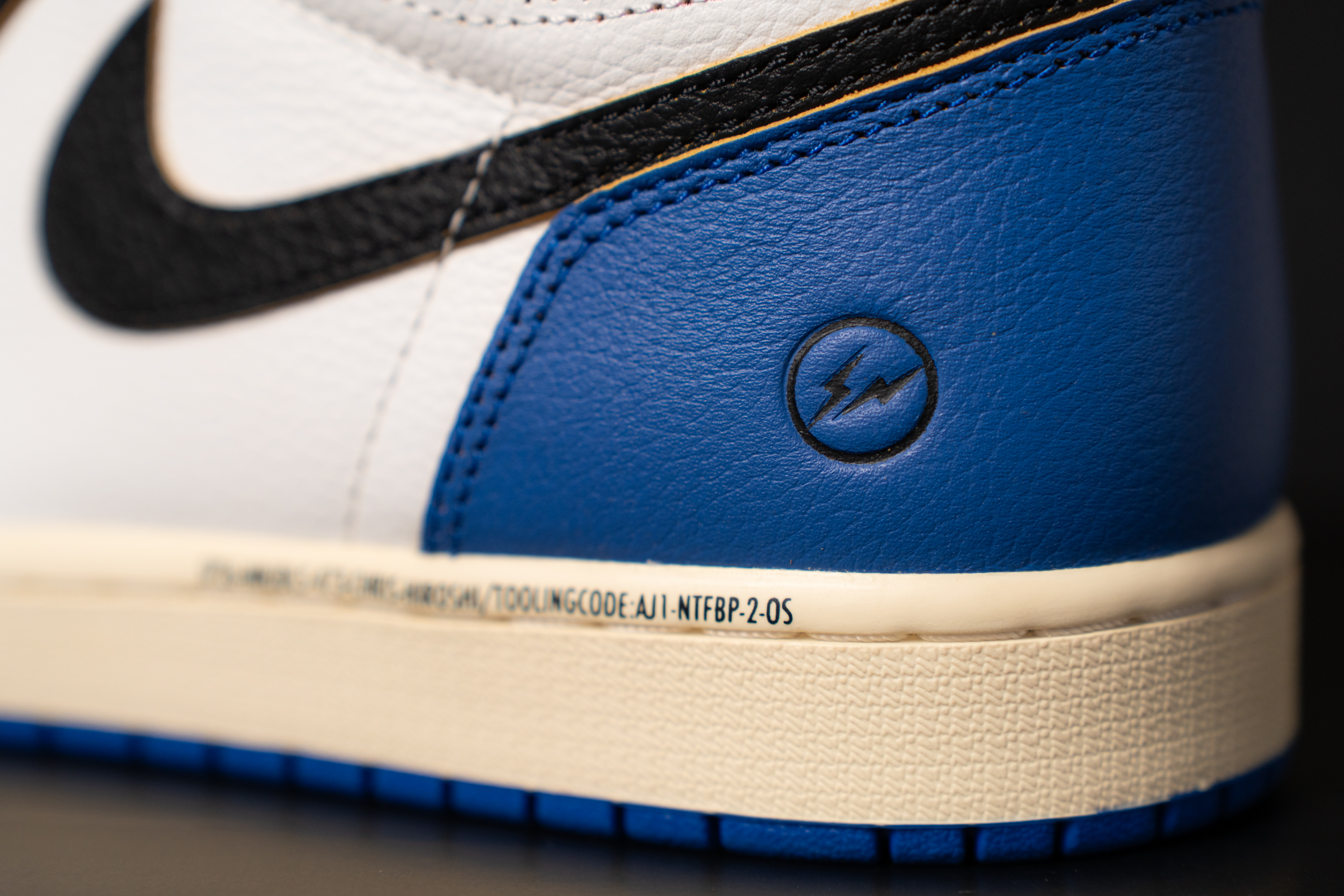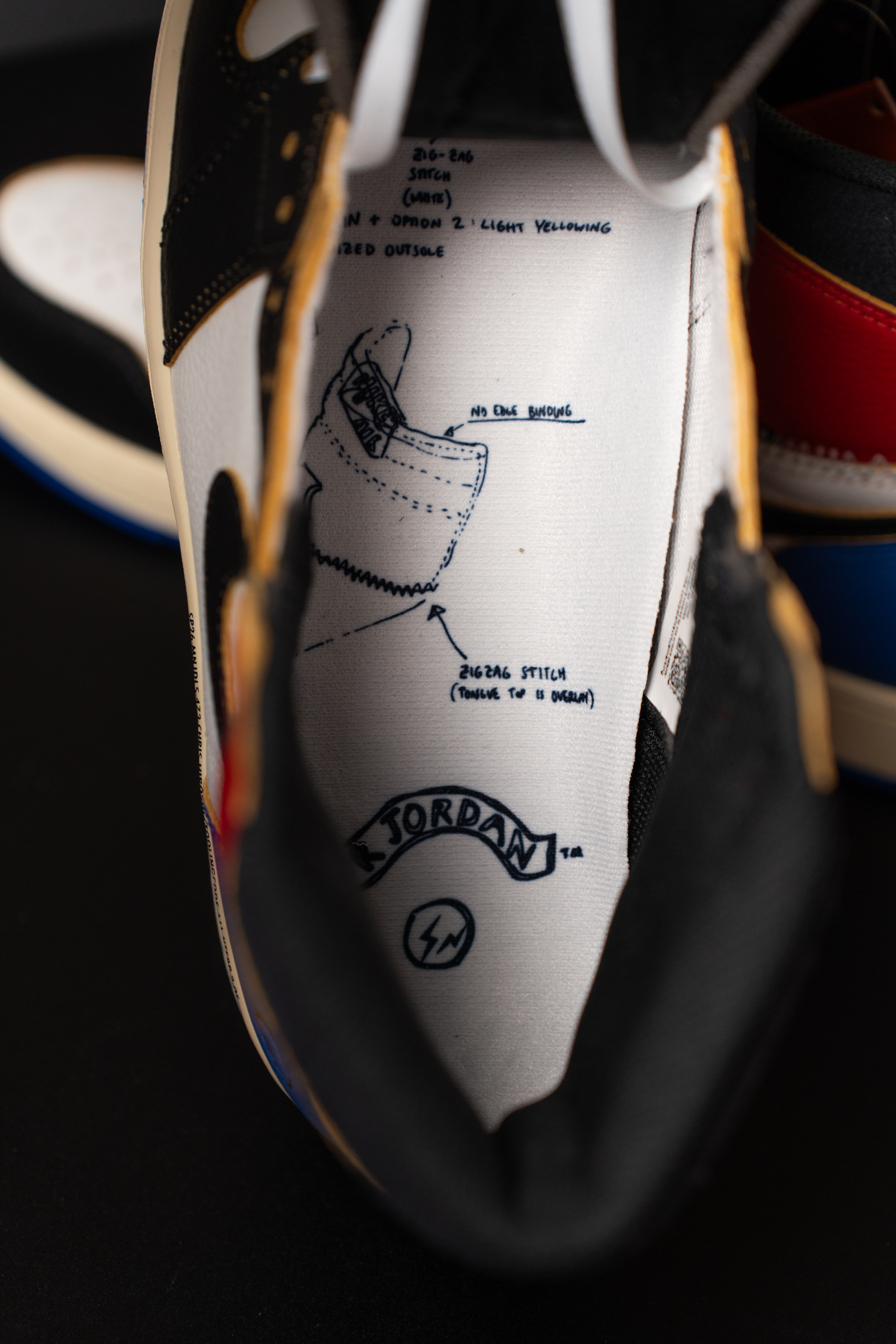 3자 협업의 정체성을 볼 수 있는 사진입니다. 발목쪽엔 유니온 LA 협업의 상징인 UN/LA 탭과 스티치가 있어요. 마치 다른 신발의 파츠를 가져 와 짜깁기 한 듯한 디테일입니다. 아랫쪽엔 프라그먼트 디자인의 번개 로고 그리고 SP26으로 시작되는 문구가 있습니다.