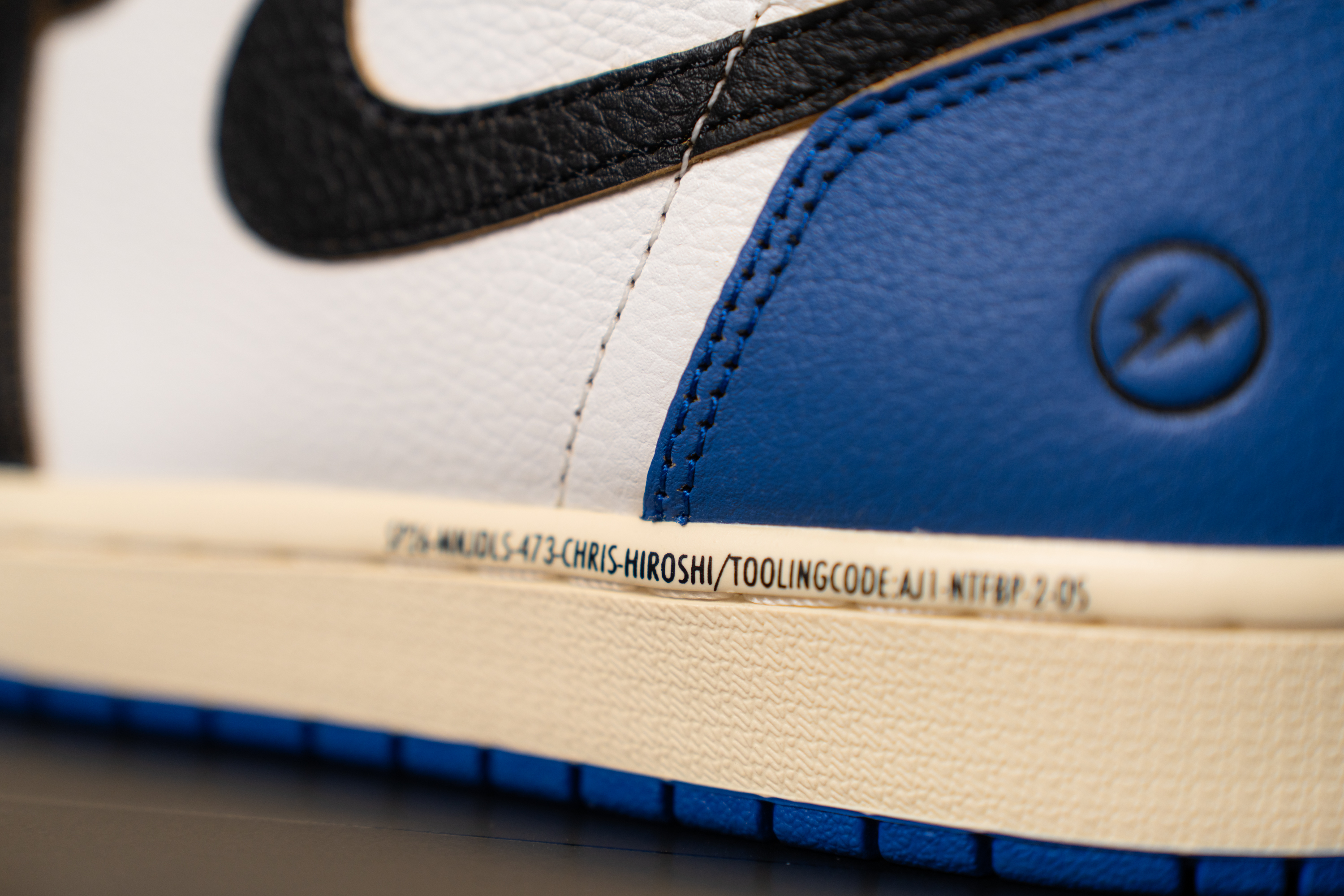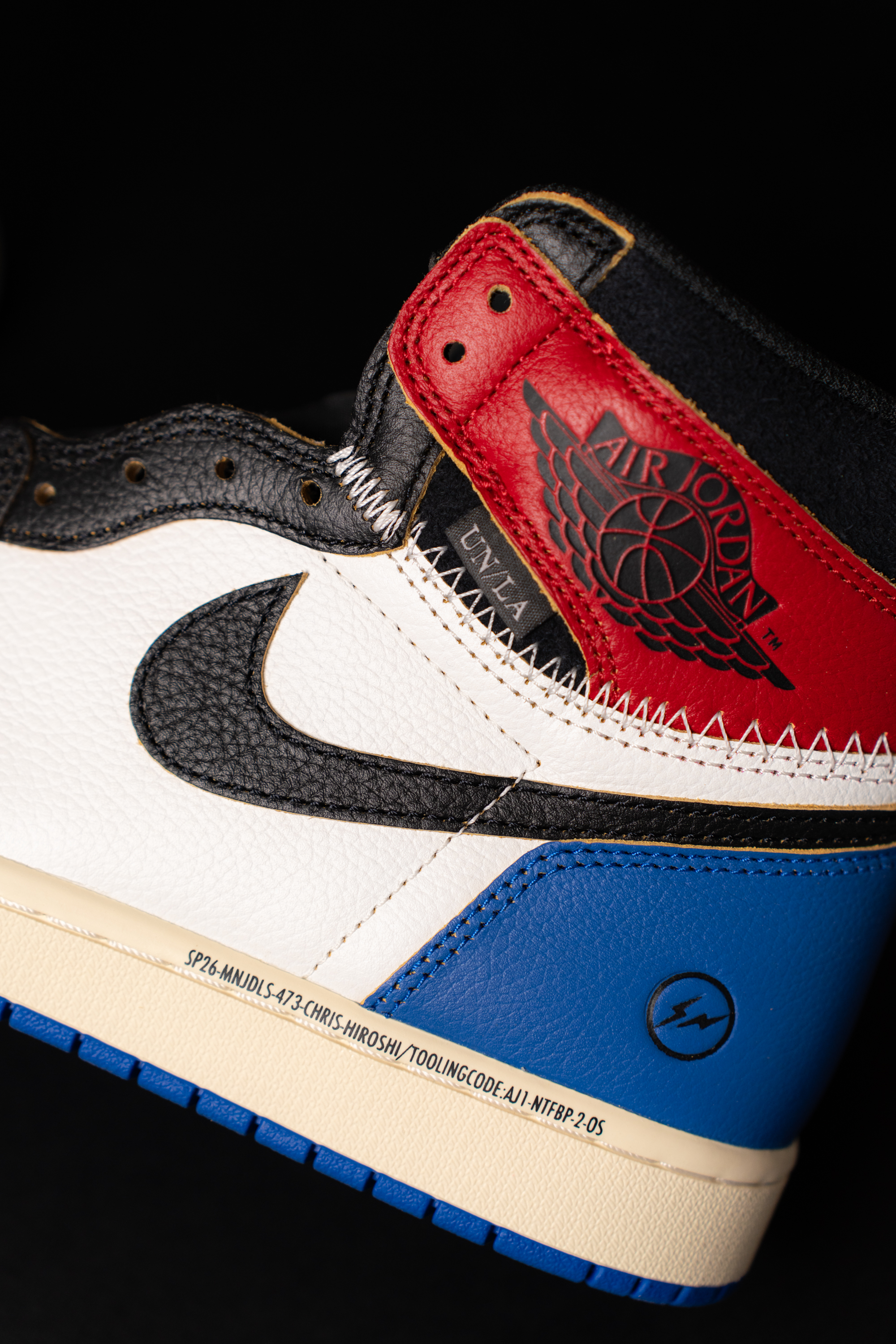 3자 협업의 정체성을 볼 수 있는 사진입니다. 발목쪽엔 유니온 LA 협업의 상징인 UN/LA 탭과 스티치가 있어요. 마치 다른 신발의 파츠를 가져 와 짜깁기 한 듯한 디테일입니다. 아랫쪽엔 프라그먼트 디자인의 번개 로고 그리고 SP26으로 시작되는 문구가 있습니다.
