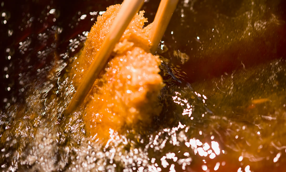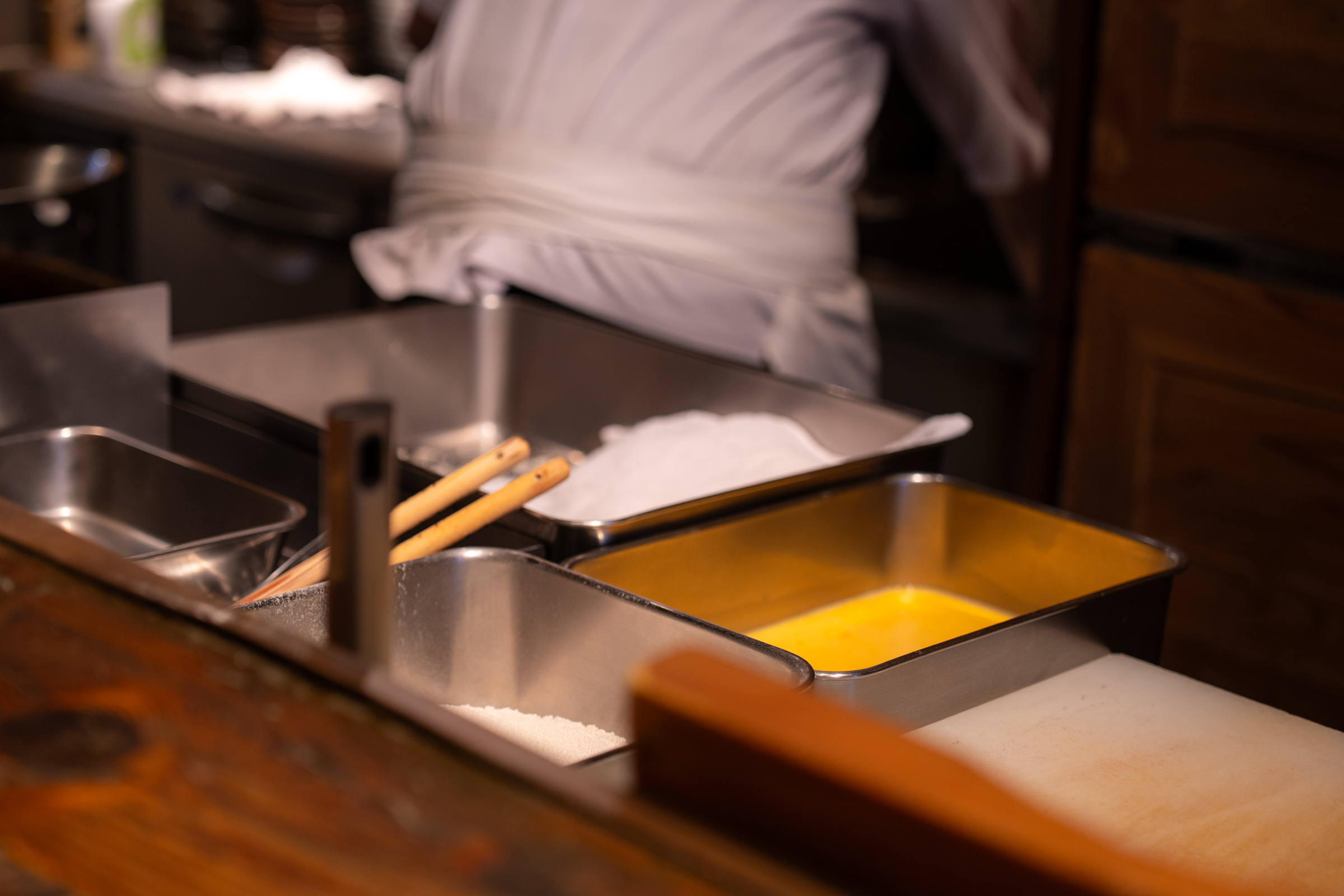 "카츠요시는 닌교초의 뒷골목에 자리 잡고 있습니다. 전통 가옥을 개조한 가게 내부는 재활용 목재를 사용하여 레트로한 분위기를 자아냅니다. 주방에는 구리 냄비 두 개가 놓여 있는데, 주인 겸 셰프는 돈까스를 튀길 때 요리에 따라 뜨거운 기름과 차가운 기름을 번갈아 사용합니다. 가리비와 왕새우 같은 해산물 튀김도 인기 메뉴입니다. 카운터석에 앉으면 고기 손질부터 시작되는 셰프의 조리 과정을 직접 볼 수 있습니다."