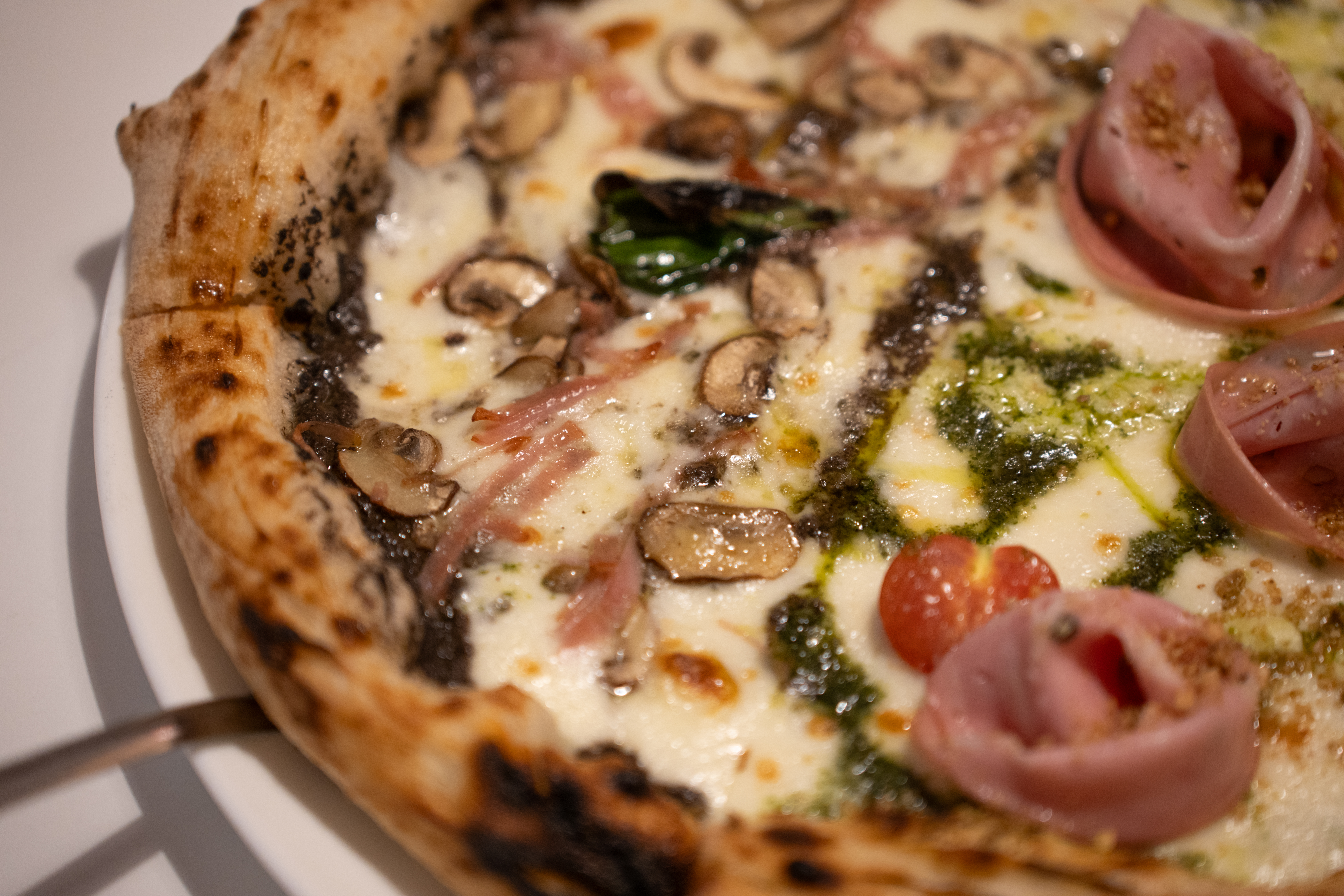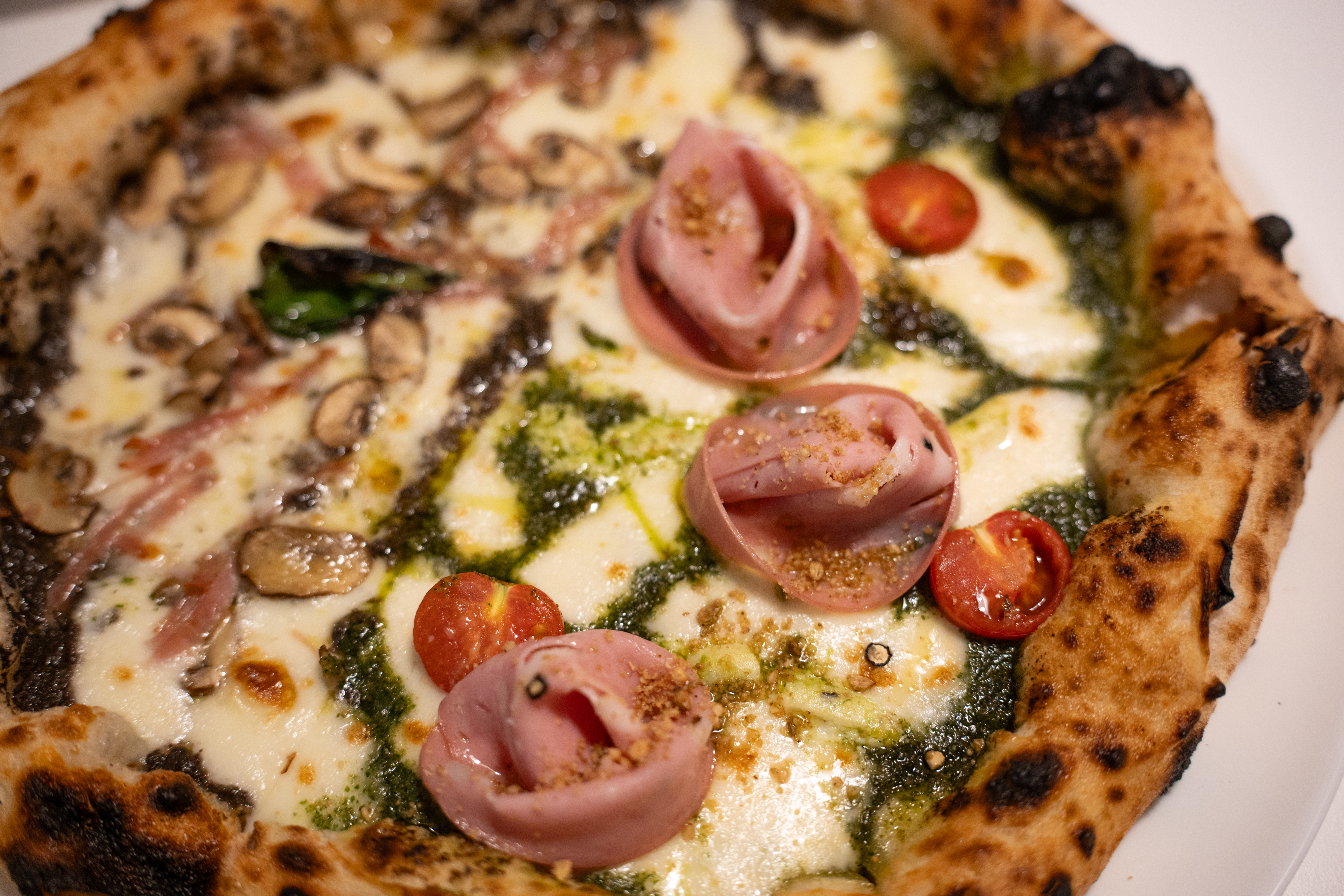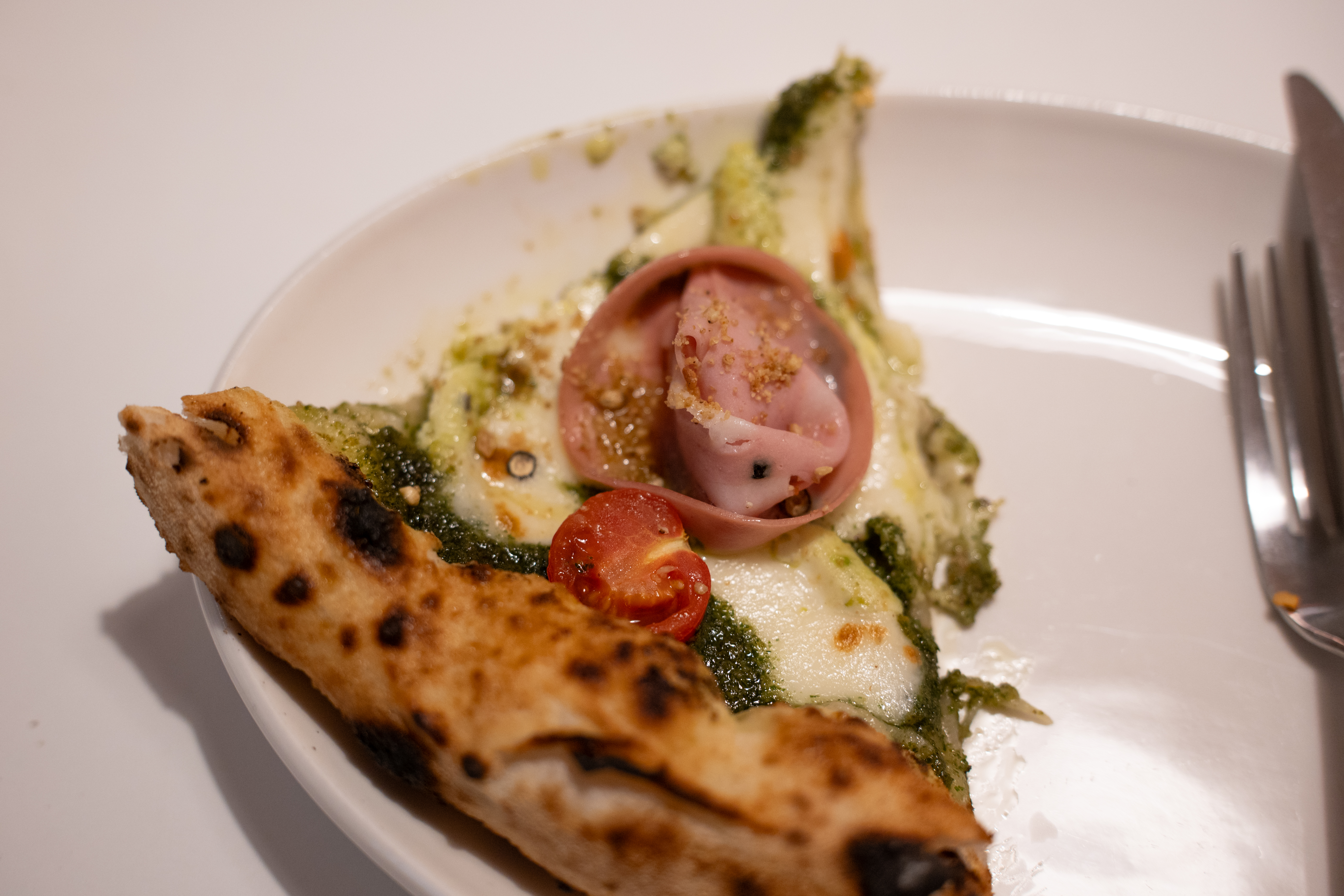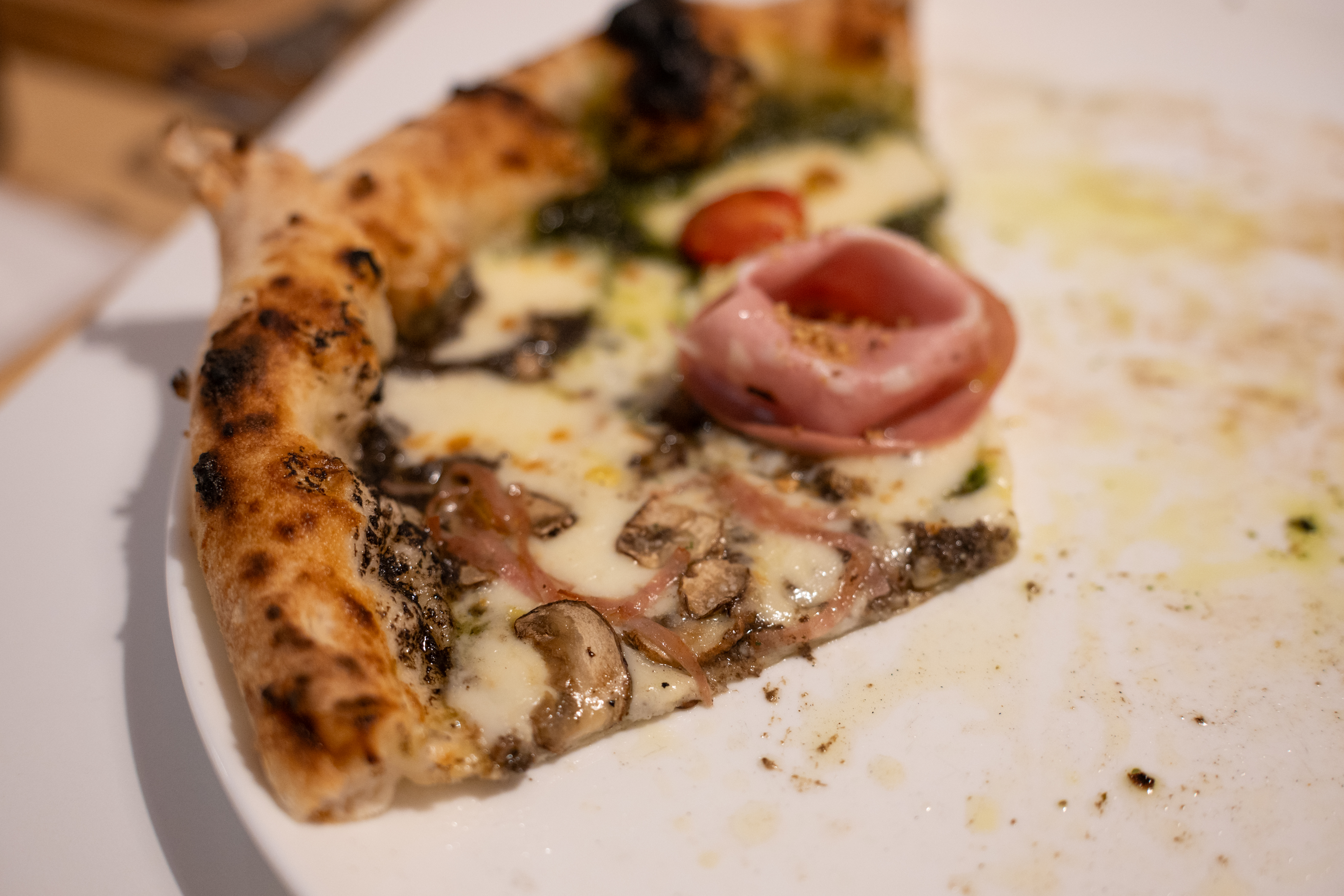 두 피자 모두 모짜렐라 치즈와 그라나파다노 치즈가 기본입니다. 바질 페스토 피자는 이름처럼 바질 페스토를 뿌렸고 체리 토마토와 모르타델라 햄을 올렸습니다. 그래서 고소한 맛과 향이 강한 편이에요. 피자지만 샌드위치를 먹는 느낌이 드는 이유입니다. 도우의 식감이 쫄깃쫄깃한 것이 토핑 없는 크러스트만 먹어도 맛이 있습니다. 잘하는 피자집은 도우가 맛있다죠. 테이블에 올리브 오일이 있으면 크러스트에 뿌려 먹기 좋았을텐데 그게 아쉽습니다.