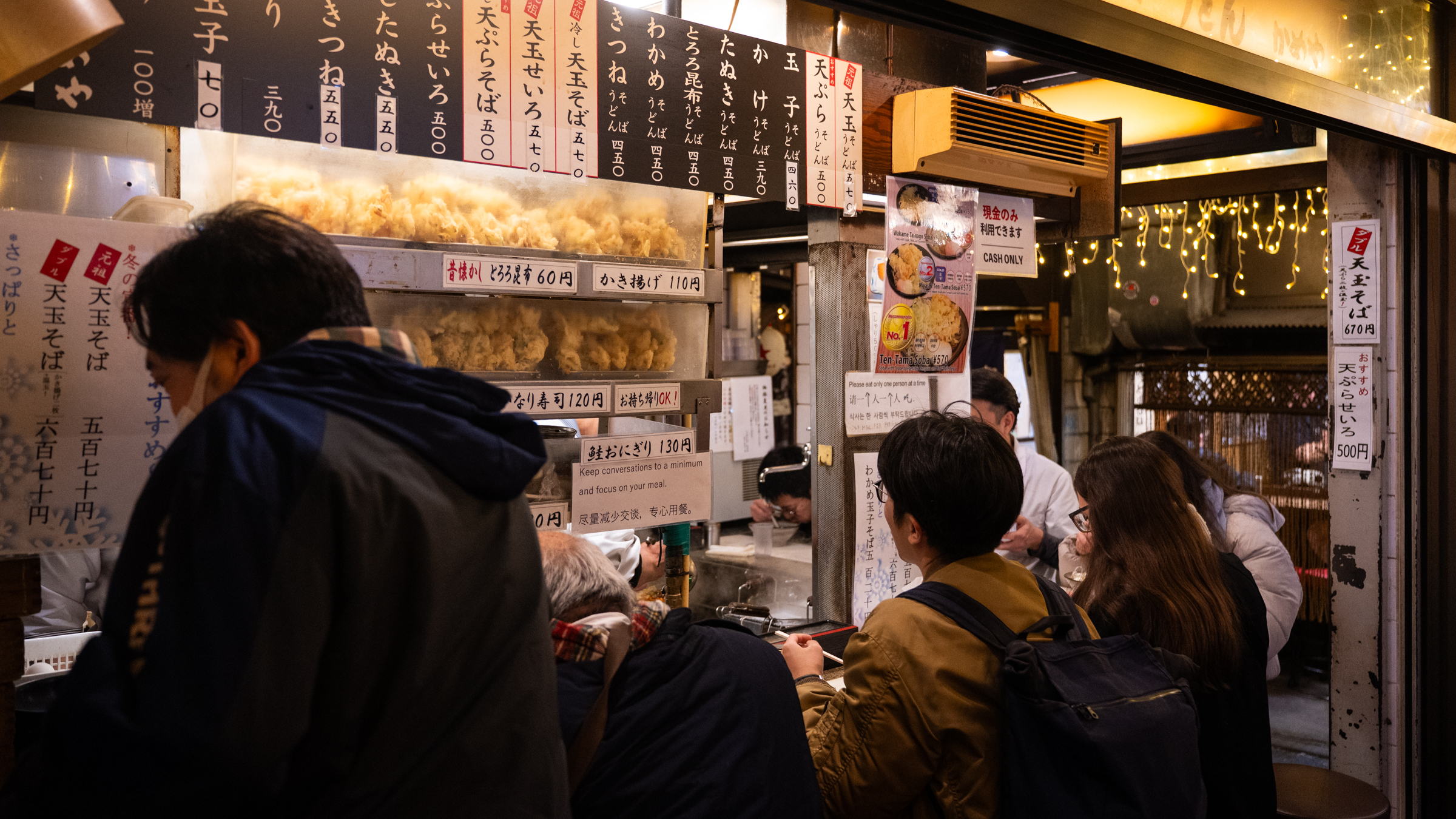 좀처럼 갈 곳을 정하지 못하고 있는데 코너에 있는 식당이 마음에 들었습니다. 바 테이블에 사람들이 다닥 다닥 앉아 있는 것이 눈길을 끌더군요. 자리에 할아버지들이 많이 앉아있는 것을 보아 맛집인 것이 분명했습니다. 메뉴판을 보고 있으니 때마침 자리가 하나 나서 얼른 앉았습니다. 메뉴는 튀김을 얹은 소바. 맛이 없기가 힘들죠. 구글맵 검색 없이 찾은 첫 번째 식당이었고 이제야 이름을 찾아 봤습니다. 상호명은 카메야.