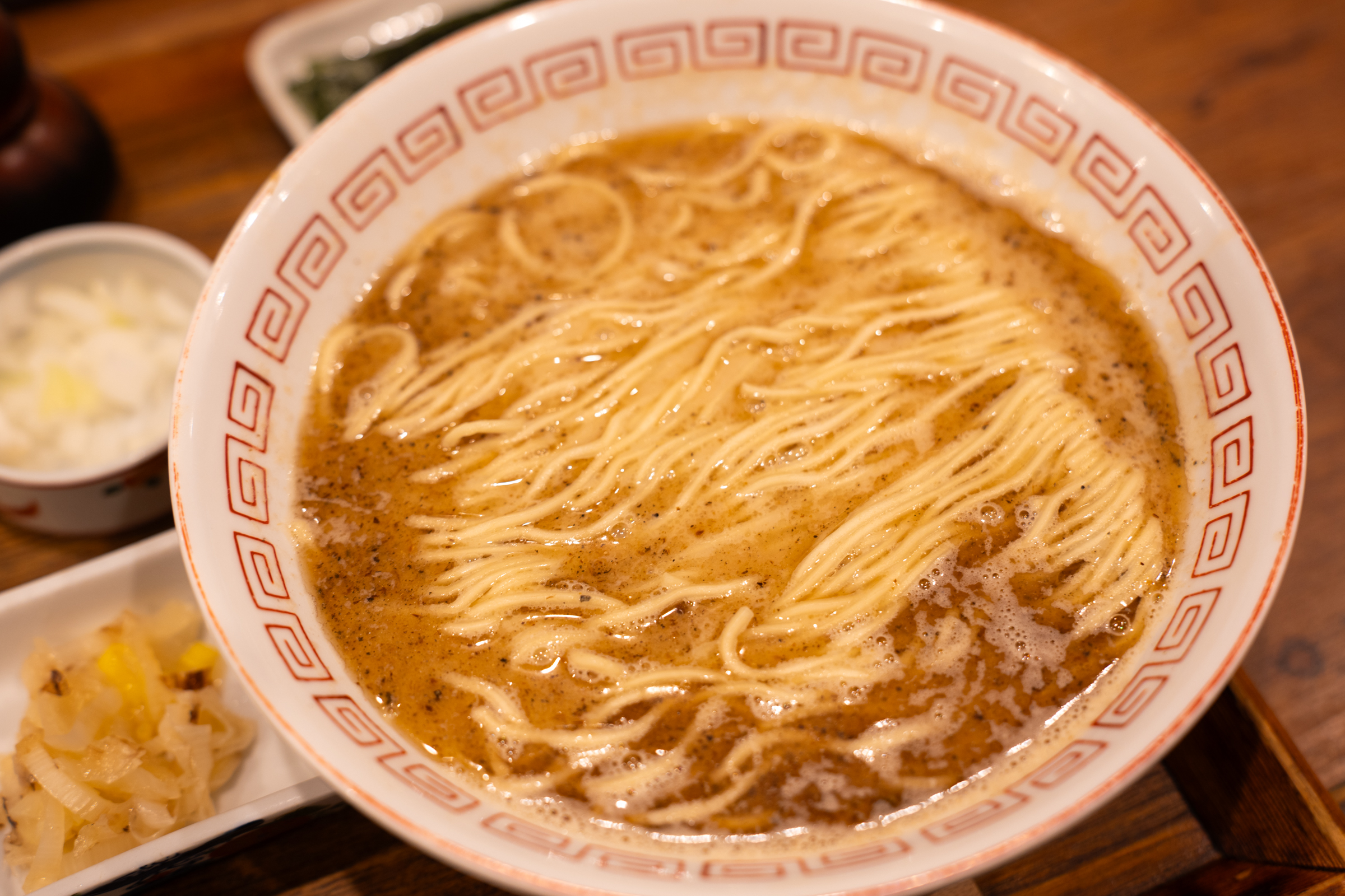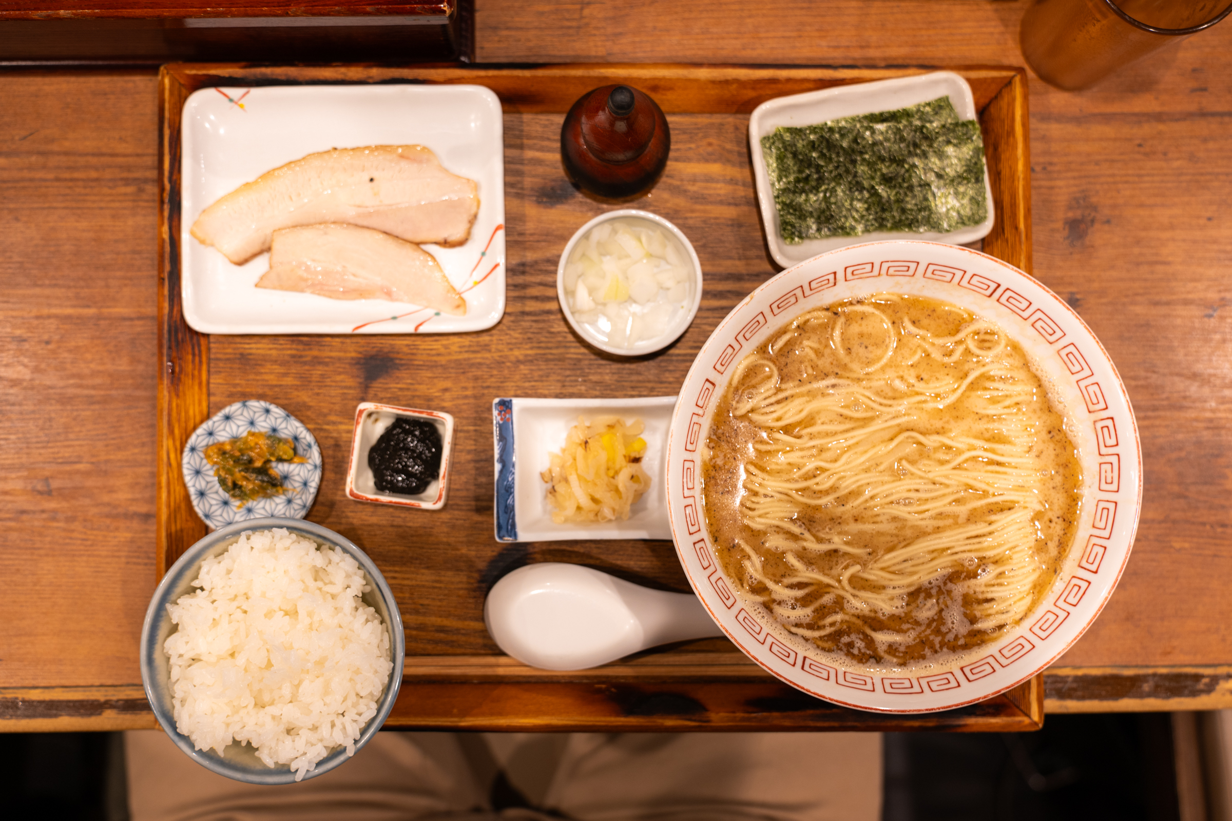 오쿠린도의 고등어 정식. 메인인 고등어 라멘이 그간 보았던 일본 라멘과는 완전히 다른 스타일입니다. 화려한 토핑 없이 면과 국물로만 구성돼 있어요. 접시 디자인도 중국집에서 본 듯한 느낌이라 중화 소바 느낌이 제대로 납니다. 돼지고기 차슈는 따로 접시에 올려 김도 눅눅해지지 않게 따로 나옵니다. 거기에 오이 된장 무침, 생양파, 구운 파, 두반장이 함께 나옵니다. 반찬으로 밥과 먹어도 되고 생양파는 면에 넣어 먹으면 식감과 풍미가 더해집니다.