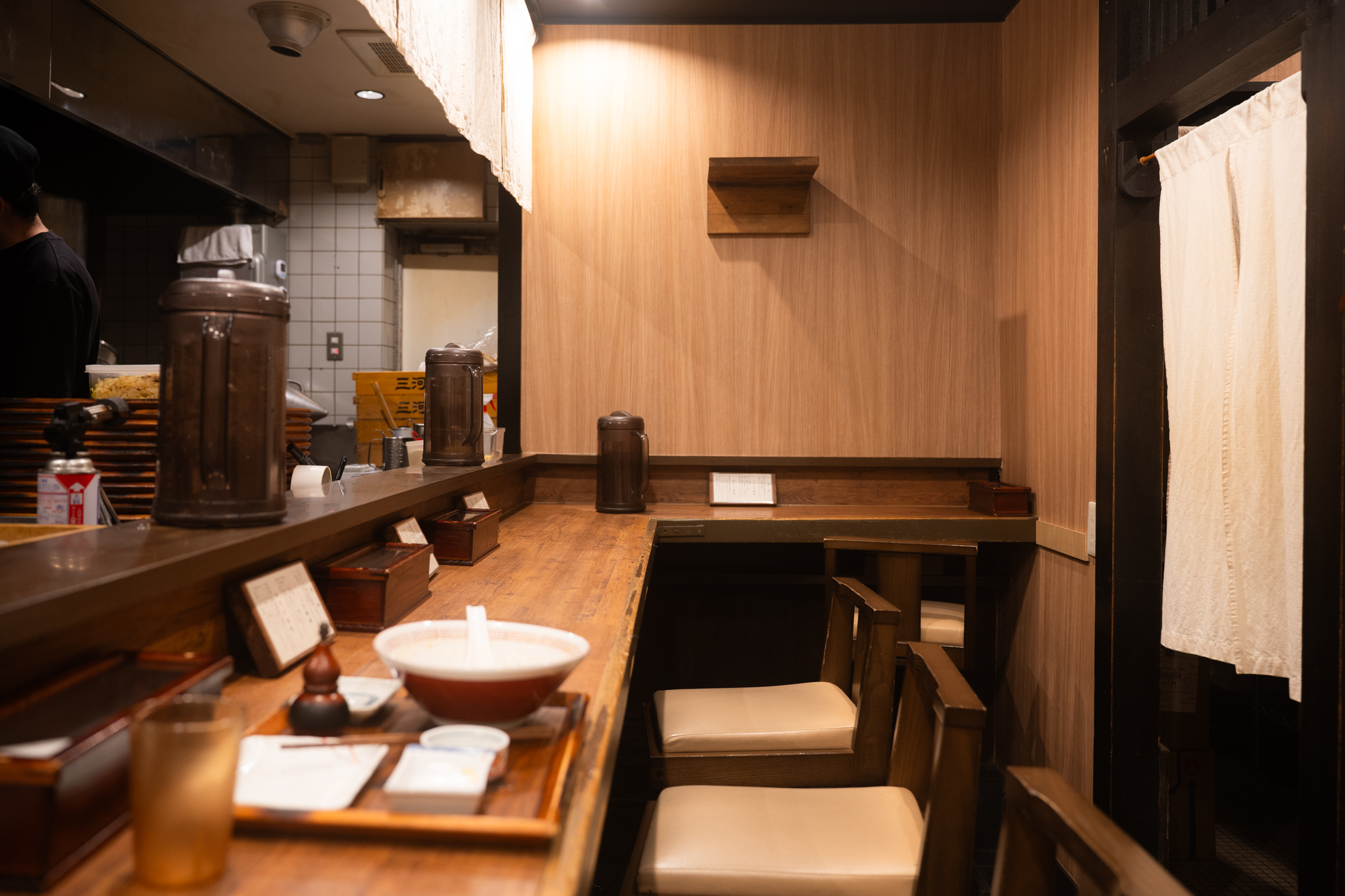 긴 바 좌석과 테이블 두어 개가 전부인 작은 식당입니다. 낡은 주방이 꽤나 정겨우면서 음식에 대한 믿음을 생기게 합니다. 주문은 입구에 있는 티켓 머신에서 할 수 있습니다. 한국어는 없지만 영어가 병기돼 있기 때문에 주문은 어렵지 않았어요. 정 어려우면 직원들에게 도움을 청하면 됩니다. 친절했어요. 저는 대표 메뉴인 고등어 라멘을 주문했습니다. 가격은 1200엔. 거기에 250엔을 추가하면 정식으로 먹을 수 있어요. 1450엔, 한국 돈으로 만이삼천원이니 서울 라멘집 대비 저렴합니다.
