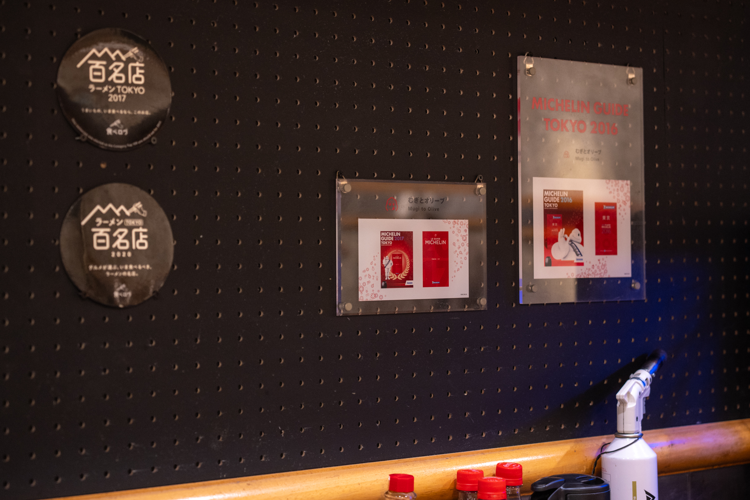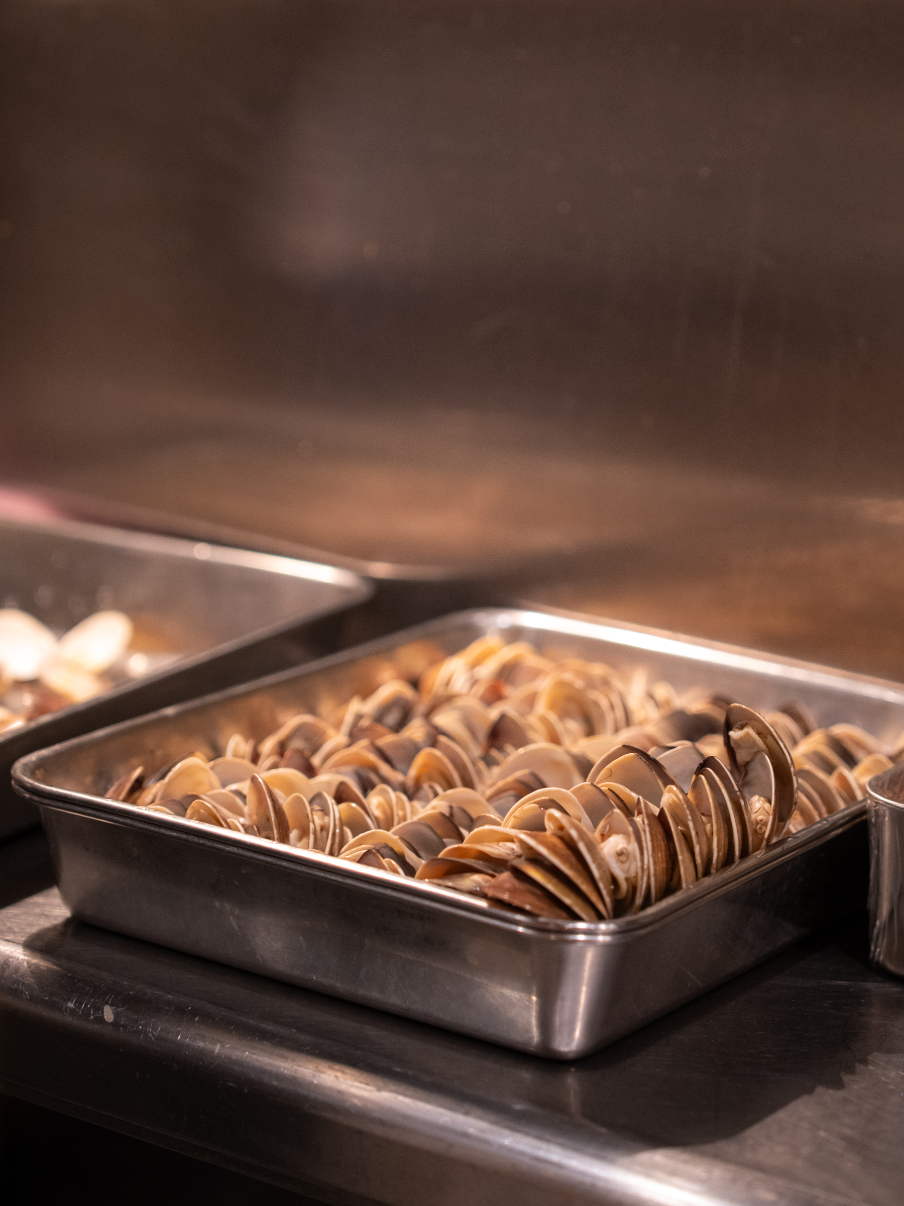 저녁 손님들이 몰리기 직전에 방문했습니다. 다행히 몇 안 남은 자리를 차지할 수 있었어요. 도쿄 내 미슐랭 맛집들은 대부분 웨이팅이 긴 편입니다. 특히 유명 관광지에 있는 곳들은요. 그래서 일정이 짧다면 개중에 대기가 좀 덜한 곳을 찾는 것이 중요합니다. 그런면에서 이집은 장점이 있어요. 라멘집답게 좌석은 대부분 바로 되어 있습니다. 혼밥하기도 좋고 주방을 엿볼 수도 있어서 저는 좋아합니다. 이집에선 곳곳에 조개들이 쌓여있는 것이 인상적이었습니다.