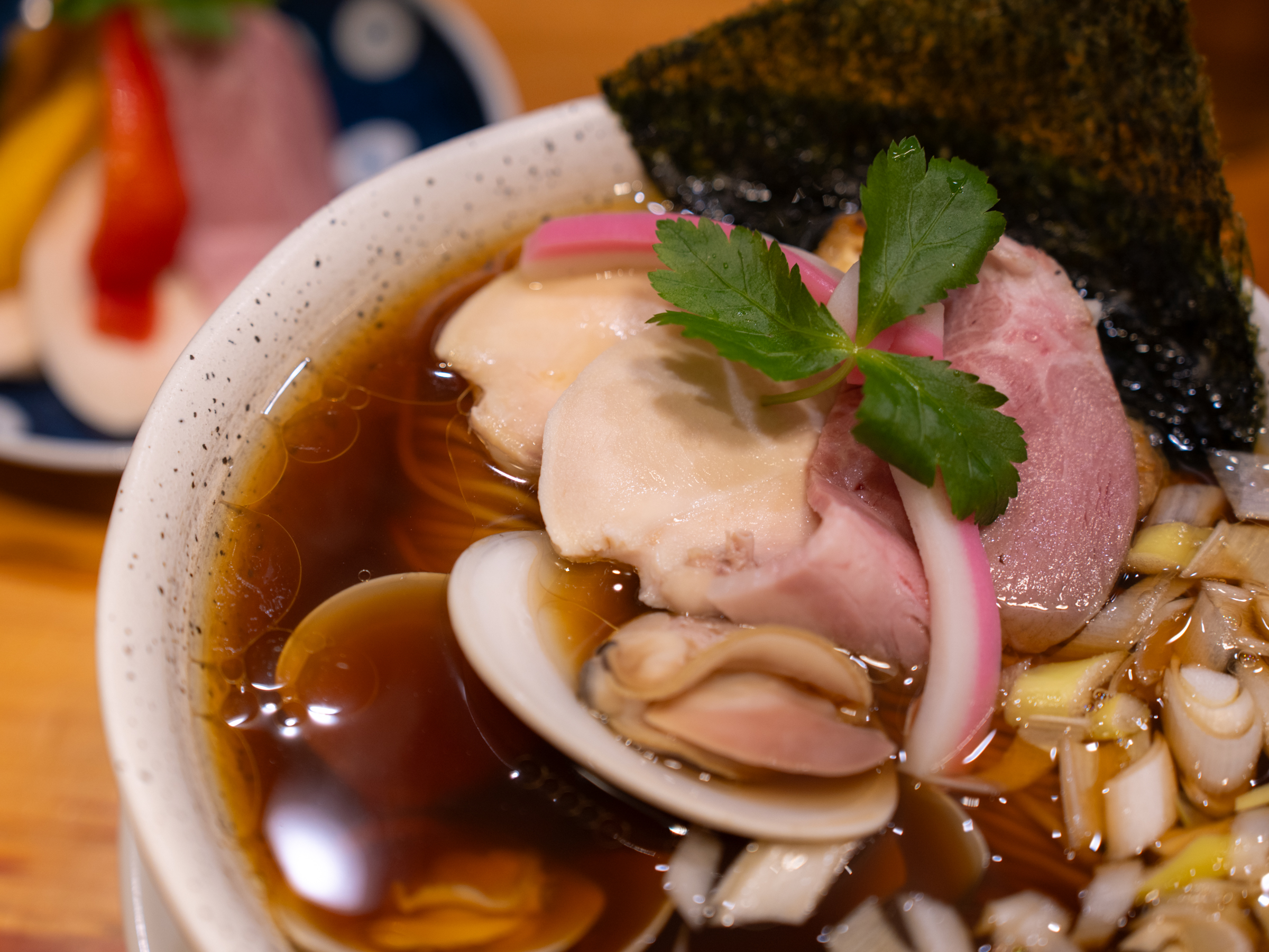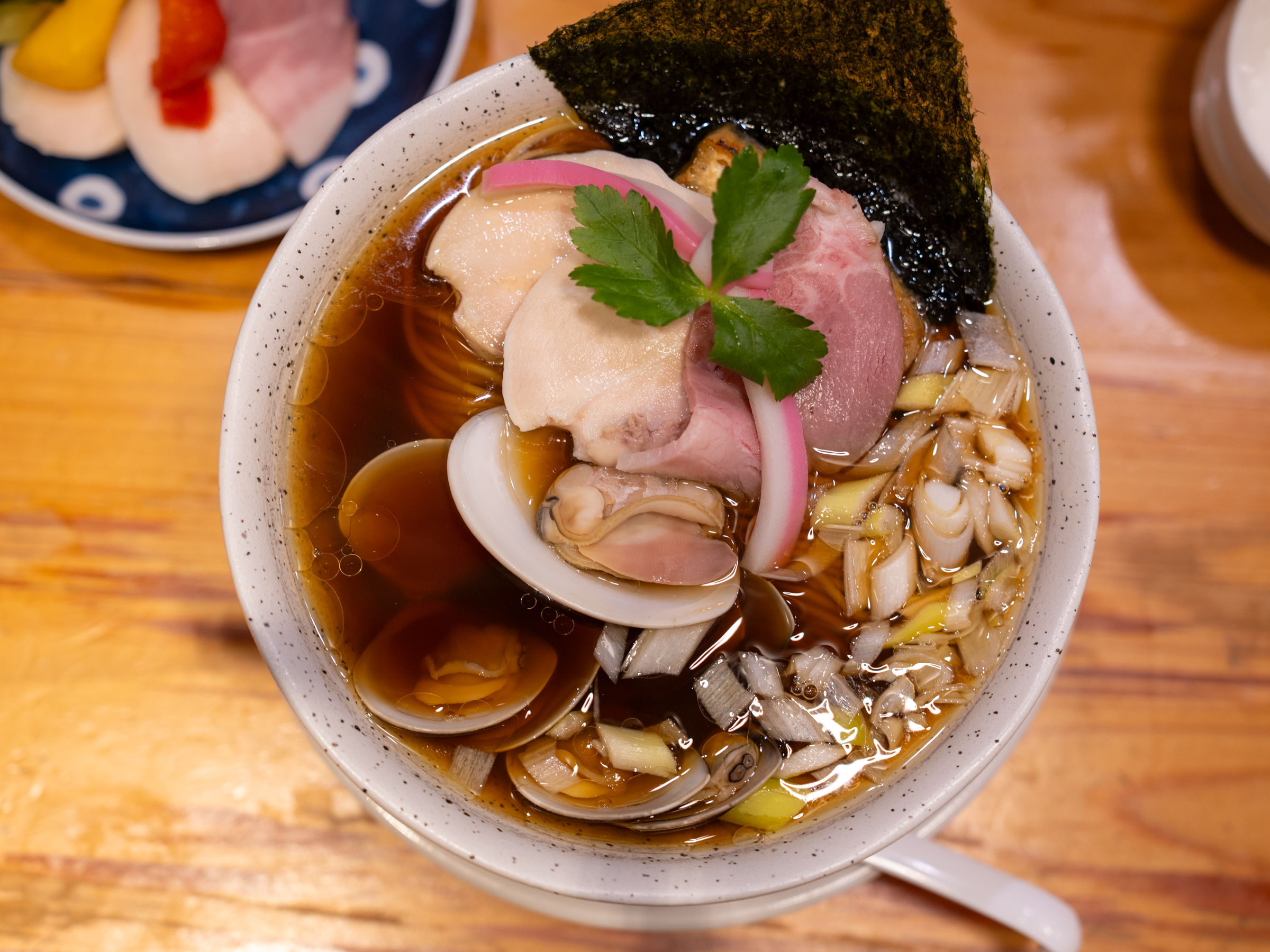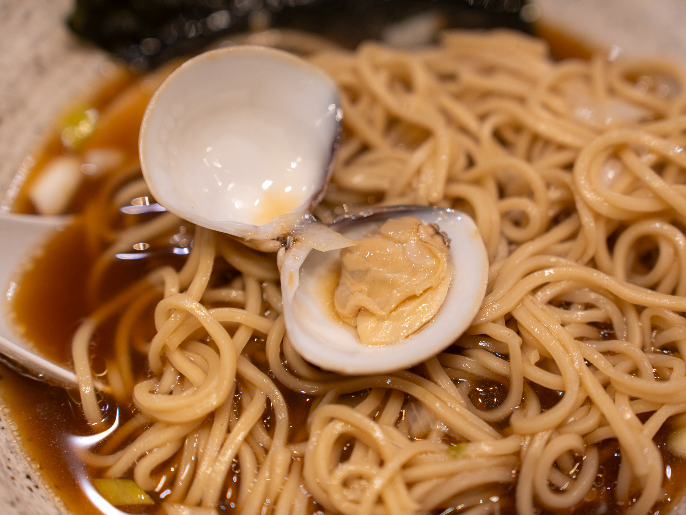 최고 인기 메뉴인 조개 라멘입니다. 간장 베이스의 쇼유 라멘이고 조개로 국물을 내 시원하면서도 감칠맛이 있습니다. 면은 중면 정도. 그리고 갖가지 고명들을 올렸습니다. 수비드 조리한 닭고기와 돼지고기, 어묵, 파, 김, 유부 그리고 두어 종의 조개. 주인공은 단연 조개입니다. 활짝 입을 벌리고 있는 모습이 시선을 사로잡습니다. 국물에 잠겨있는 것까지 합하면 그 수가 상당하고요. 이래서 가격이 비싼가봐요. 이곳 외에도 도쿄 라멘집들 중에는 조개를 활용한 곳이 많더군요. 도쿄 라멘 트렌드인 건지.