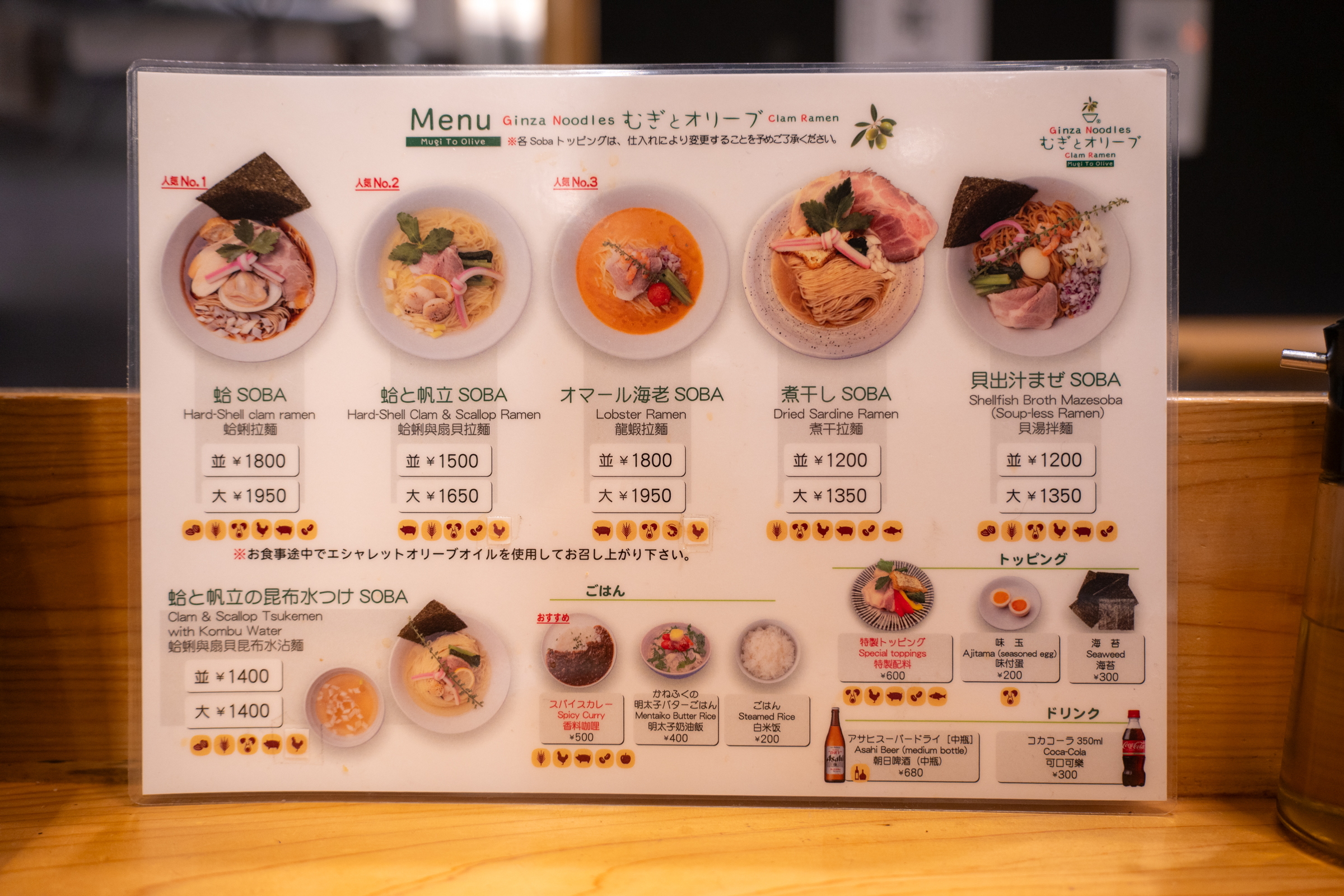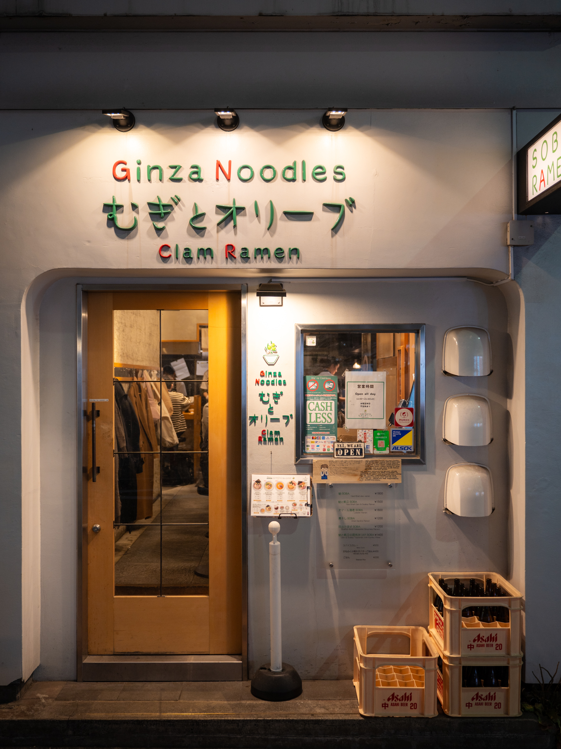 상호명 무기토 올리브는 보리·밀·귀리 등을 총칭하는 무기, 그리고 올리브를 붙여 지은 것입니다. 이름만 봐서는 파스타나 리조토를 파는 이탈리안 레스토랑에 어울리죠. 실제로 이집 메뉴들 중 상당수는 전통적인 일본 라멘과 다릅니다. 랍스터 라멘, 정어리 라멘 등의 메뉴가 그렇습니다. 대표 메뉴는 조개를 사용한 라멘들로 이집을 지금의 유명세에 오르게 했습니다. 위치도 좋아요. 번화가이자 유명 관광지인 긴자 한복판에 있습니다. 가게 외관은 평범하지만 여러모로 힘이 느껴지는 곳입니다.