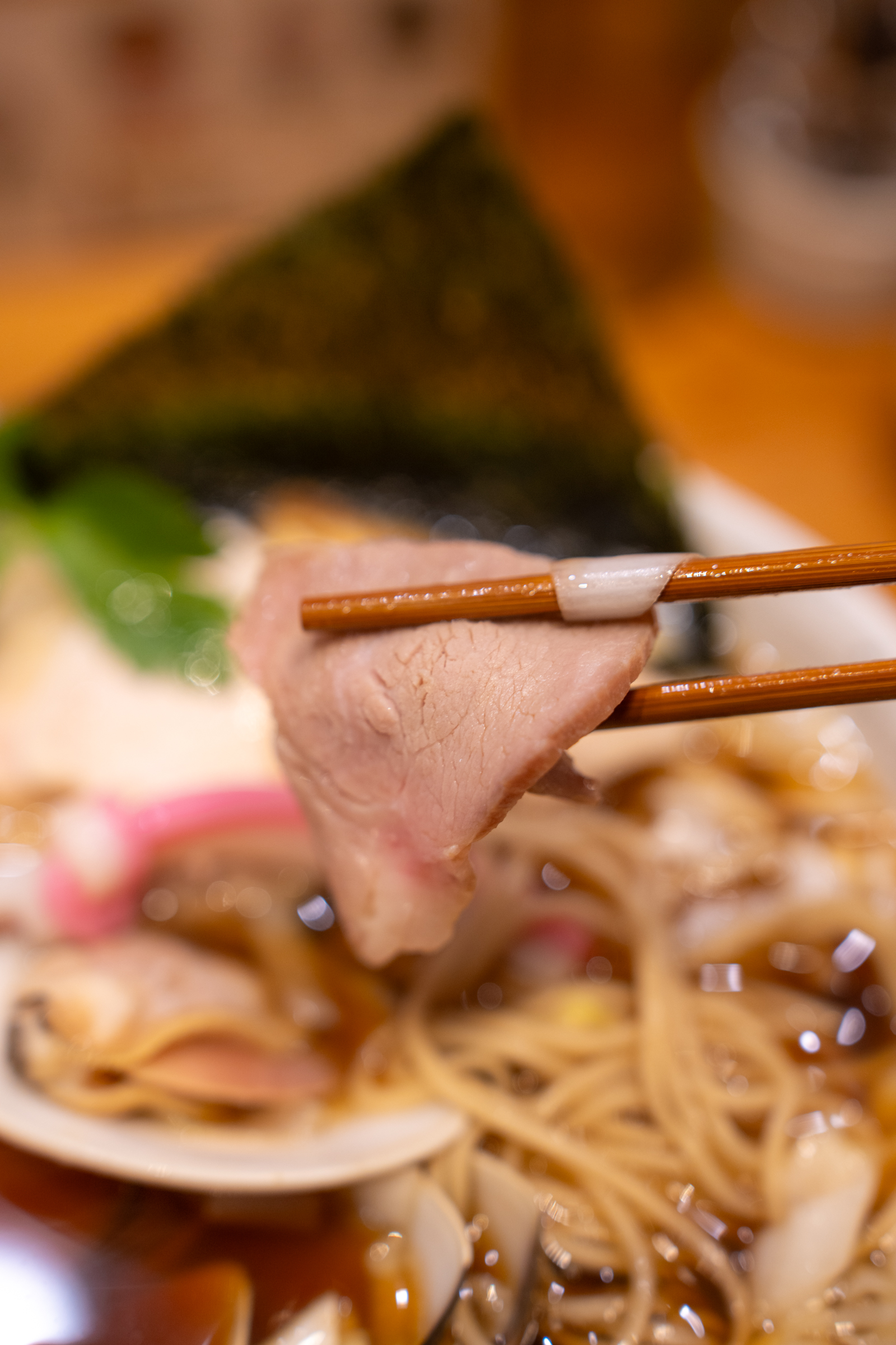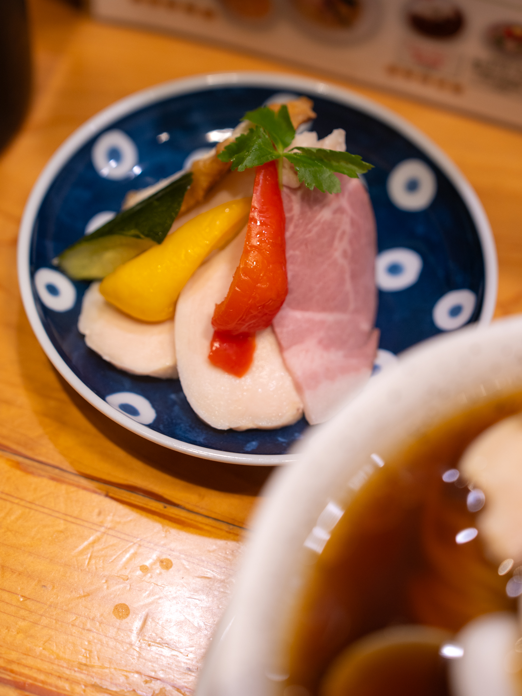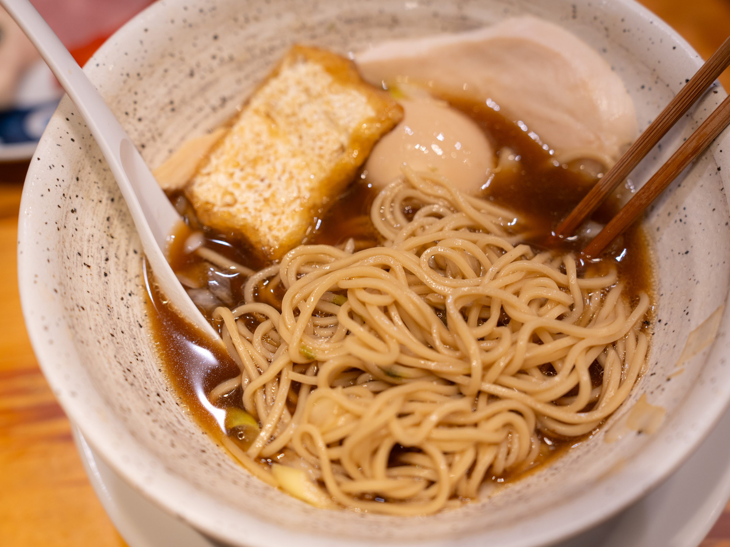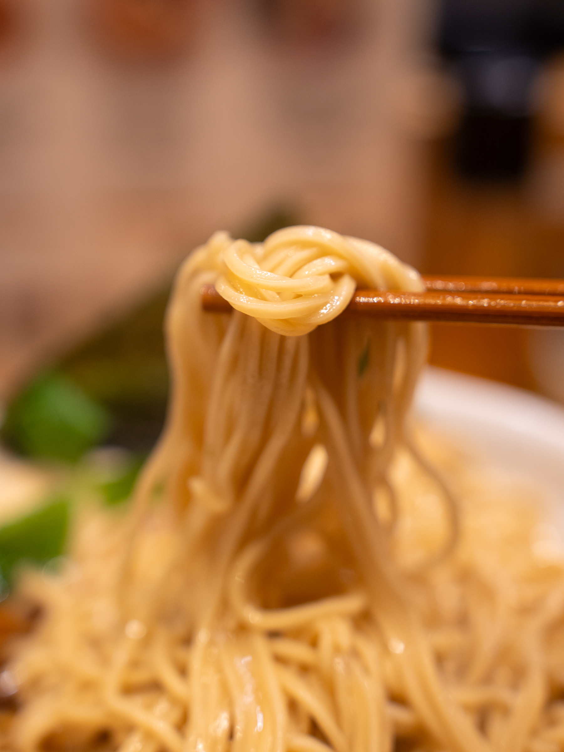 면은 중면 정도. 맑은 국물이라 면에 국물의 맛과 간이 충분히 배지 않았다는 느낌이 들었는데 그래서 오히려 좋았습니다. 담백한 면 맛을 즐길 수 있었거든요. 면이 살짝 덜 익힌듯 나온 것도 제 입맛에 맞았습니다. 저는 1950엔짜리 큰 사이즈를 주문했더니 면 양이 정말 많더라고요. 보통 라멘의 두 배 가까이 됐습니다. 어지간히 양 많은 분이 아니라면 기본 양으로 충분할 거예요.