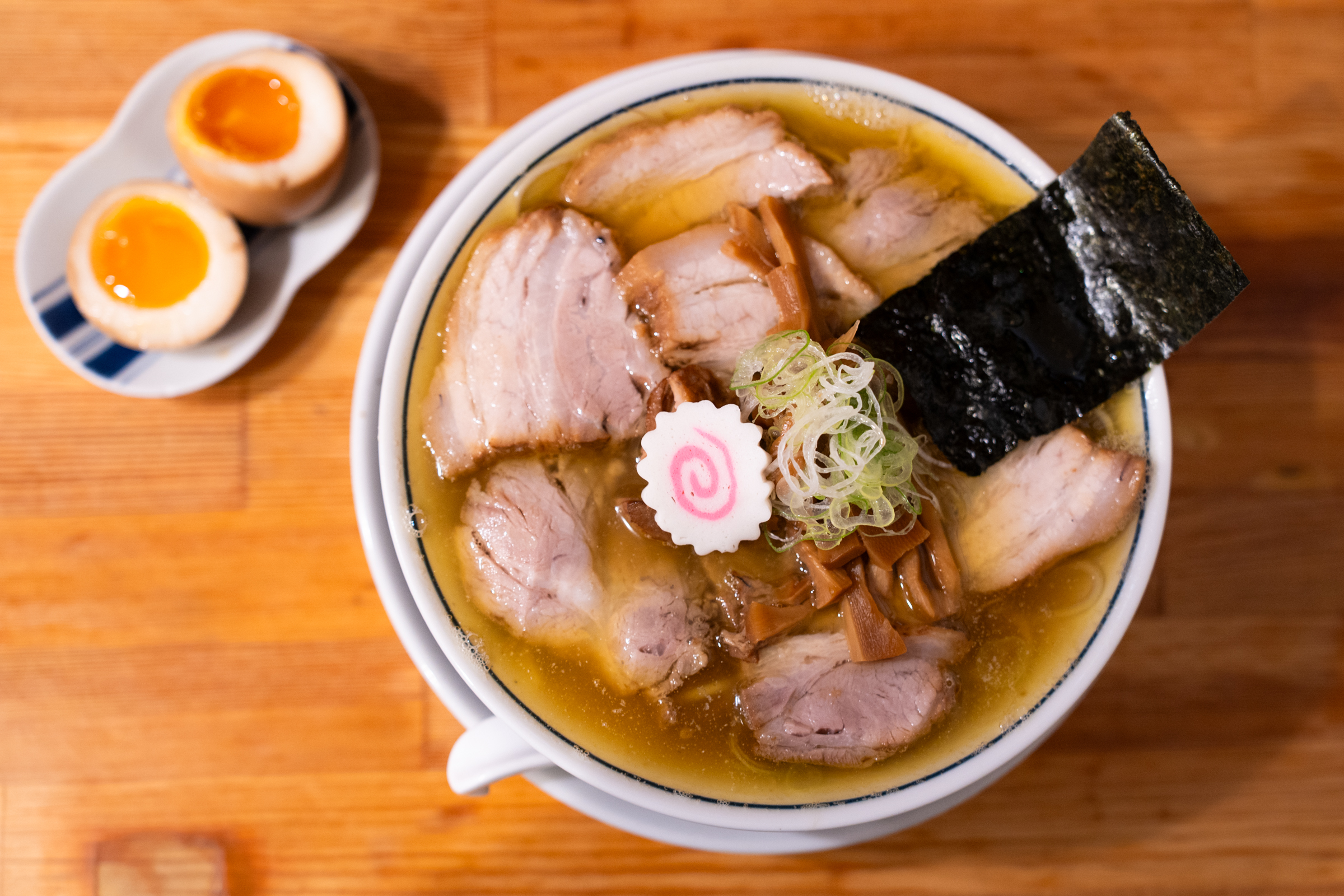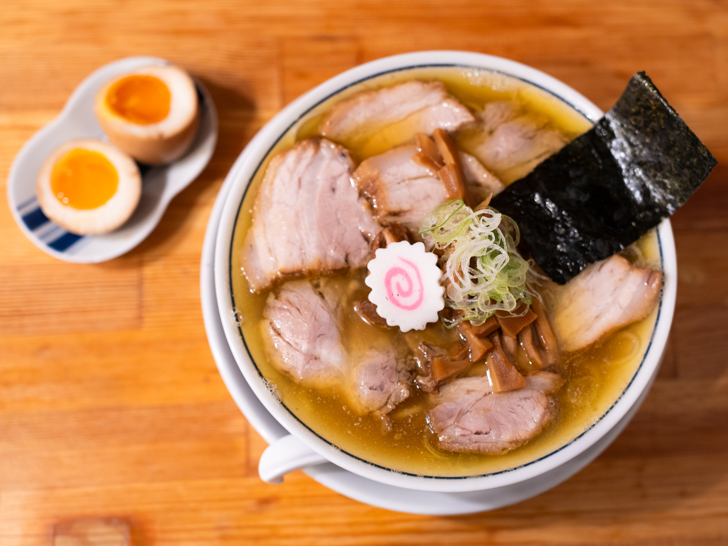 가장 인기 있다는 차슈 라멘을 주문했습니다. 당연히 반숙달걀을 추가했고요. 이집 라멘의 특징은 멸치 육수를 베이스로 했다는 것입니다. 미리 알고 봐서 그런지 멸치국수 국물과 비슷해 보였습니다. 차슈 라멘답게 차슈가 보통 라멘집의 토핑 이상으로 올라가 있습니다. 과장 조금 보태 면보다 고기가 더 많아요. 거기에 멘마, 김, 파 그리고 작은 어묵 하나가 올라가 있습니다. 구성도 담음새도 무뚝뚝한 것이 이집 분위기에 잘 어울려요.