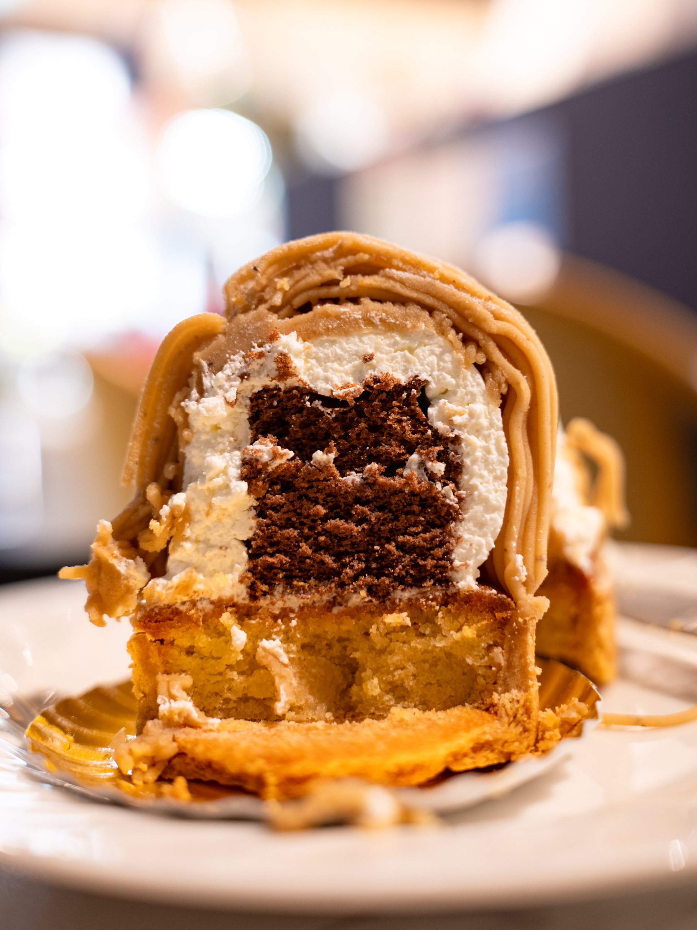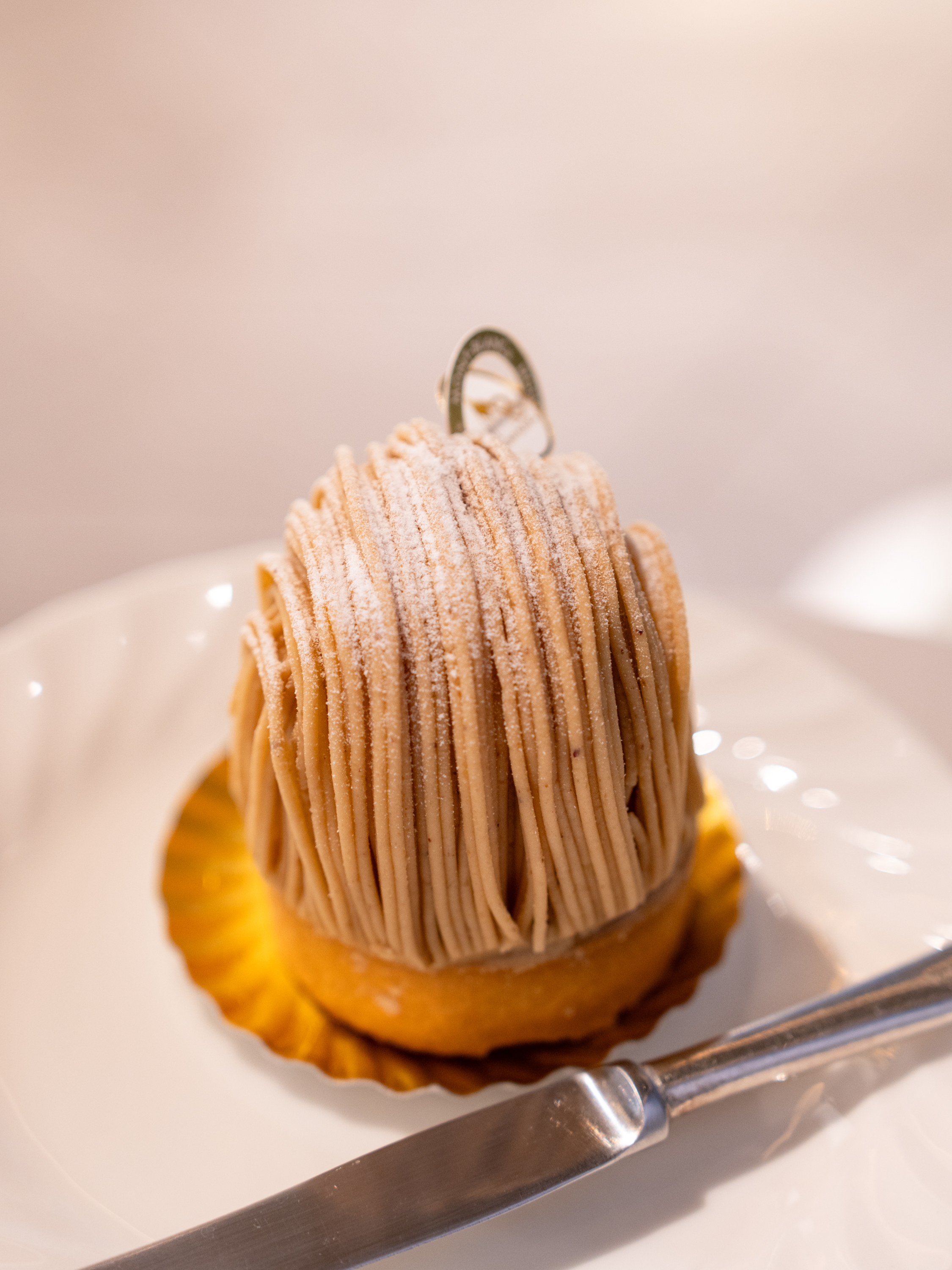 안은 더 화려하죠. 원조 몽블랑이 다소 평범한 케이크 시트를 썼다면 이 몽블랑은 아랫쪽에 파이를 놓고 그 위로 부드러운 빵과 크림, 밤 크림을 올려 식감이 훨씬 다채롭습니다. 밤 향도 좀 더 진하고요. 두 개의 디저트로 몽블랑 케이크의 변화와 발전을 느낄 수 있었어요. 양쪽 모두 밤의 맛과 향이 좋으니 몽블랑 좋아하시는 분들은 가 볼 가치가 있습니다.