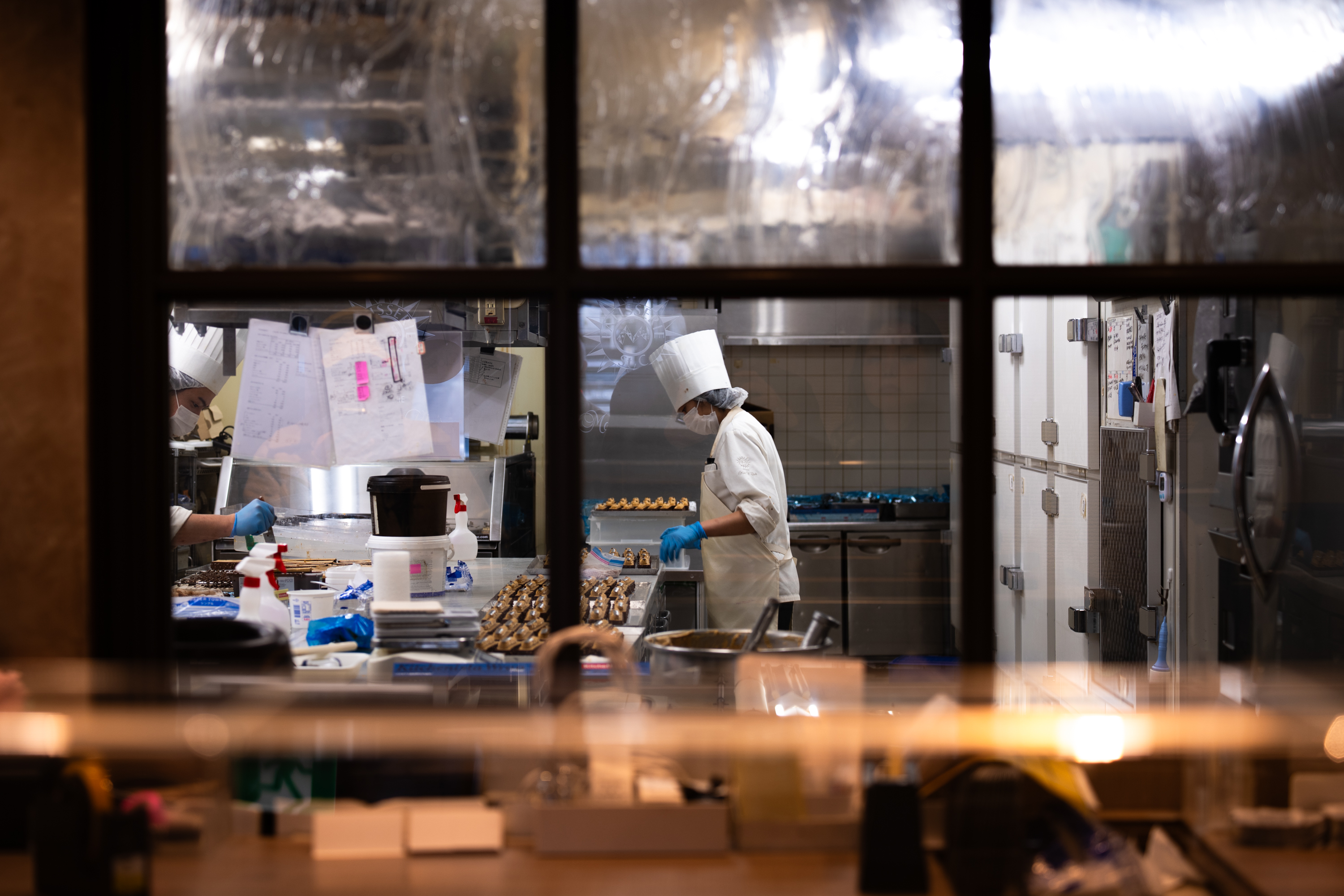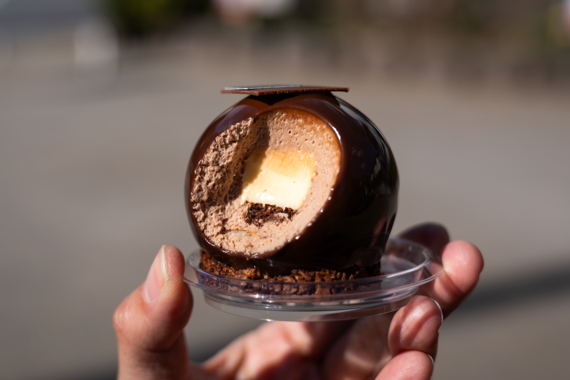 당연히 내부 좌석에서는 먹을 수가 없다고 해서 가장 맛있어 보이는 케이크를 하나 사서 나가기로 했습니다. 이날의 픽은 유자 초콜릿 케이크. 매끈하게 코팅된 겉면에 반했습니다.