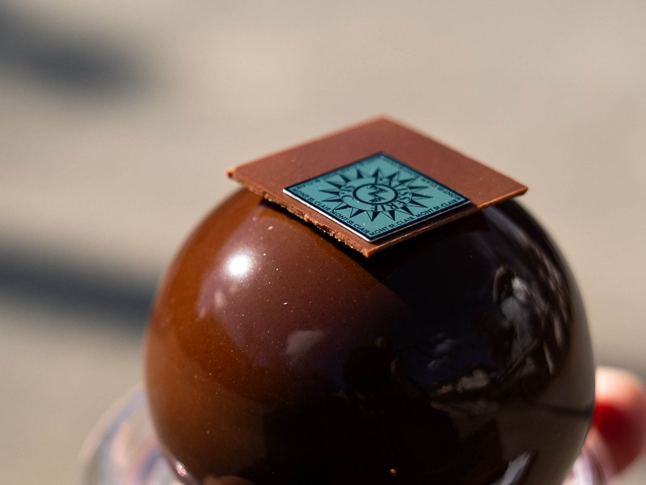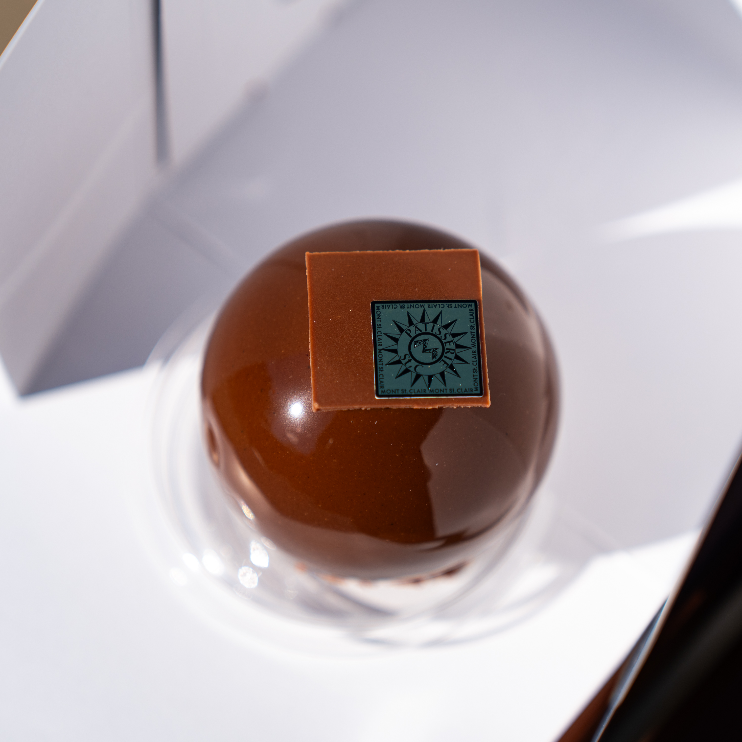 동그란 모양의 초콜릿 케이크입니다. 표면이 매끈하게 코팅된 것이 특징이고요. 위에도 작은 초콜릿을 올려 장식했습니다. 몽 상 클레르 로고가 있는 저것은 종이입니다. 초콜릿인 줄 알고 함께 씹었다 입맛 버렸어요. 퉤.
