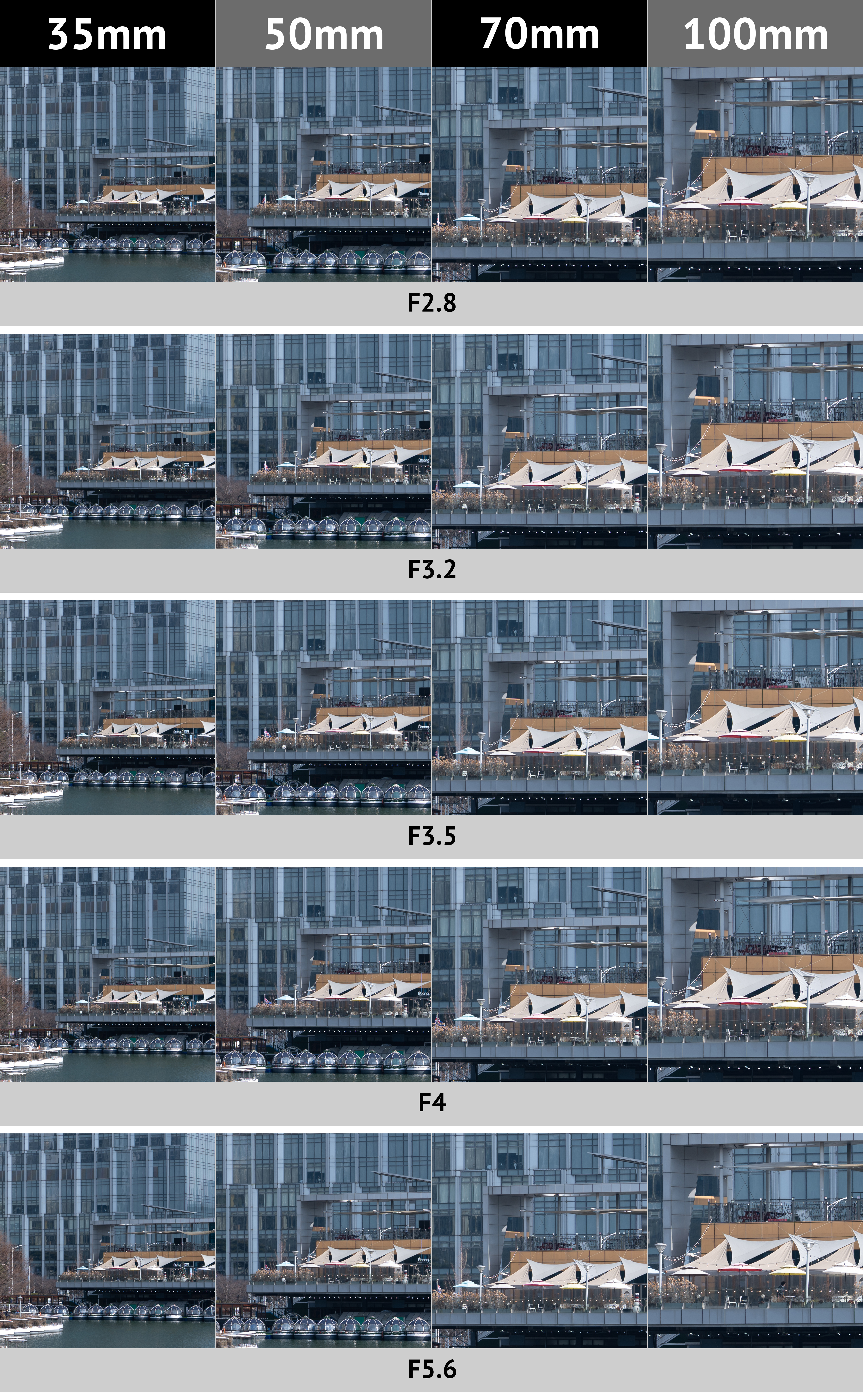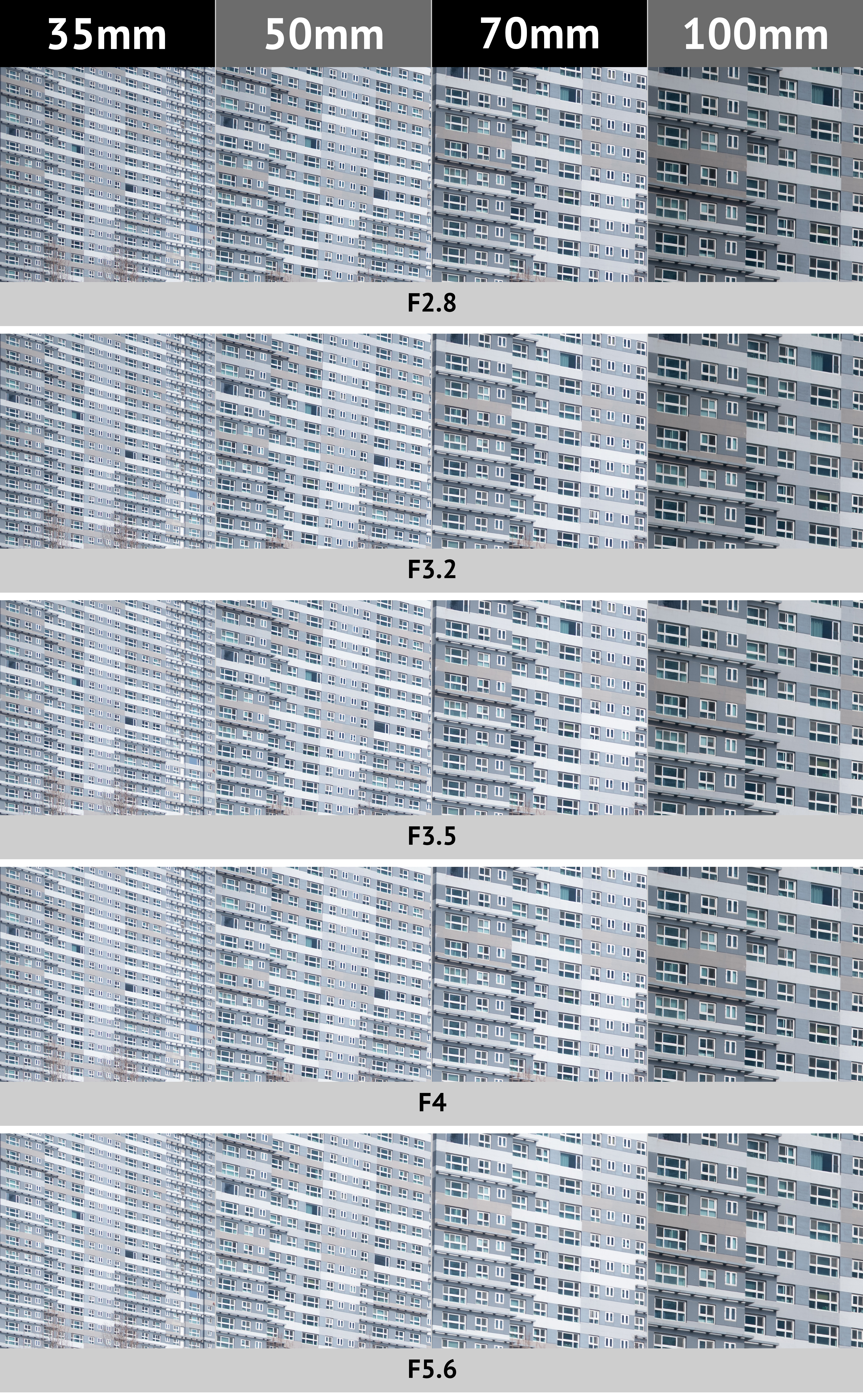 주변부 역시 초점거리에 따른 해상력 차이는 미미합니다. 다만 조리개 값에 따른 변화는 의미가 있습니다. 최대 개방 F2.8의 결과물에서 해상력, 광량 저하가 눈에 띕니다. 특히 광량 저하가 F4 이상의 결과물과 한눈에도 차이가 보여요. 이는 1/3 스톱 단계로 균일하게 개선됩니다. F5.6 이상의 값이면 모든 구간에서 문제가 없고요. 해상력 차이는 광량 저하만큼은 아닙니다. 주변부까지 신경 쓴다면 F4 정도로만 조리개 값을 설정해줘도 충분합니다. 비네팅은 소프트웨어 보정으로 보완이 가능하니까요.